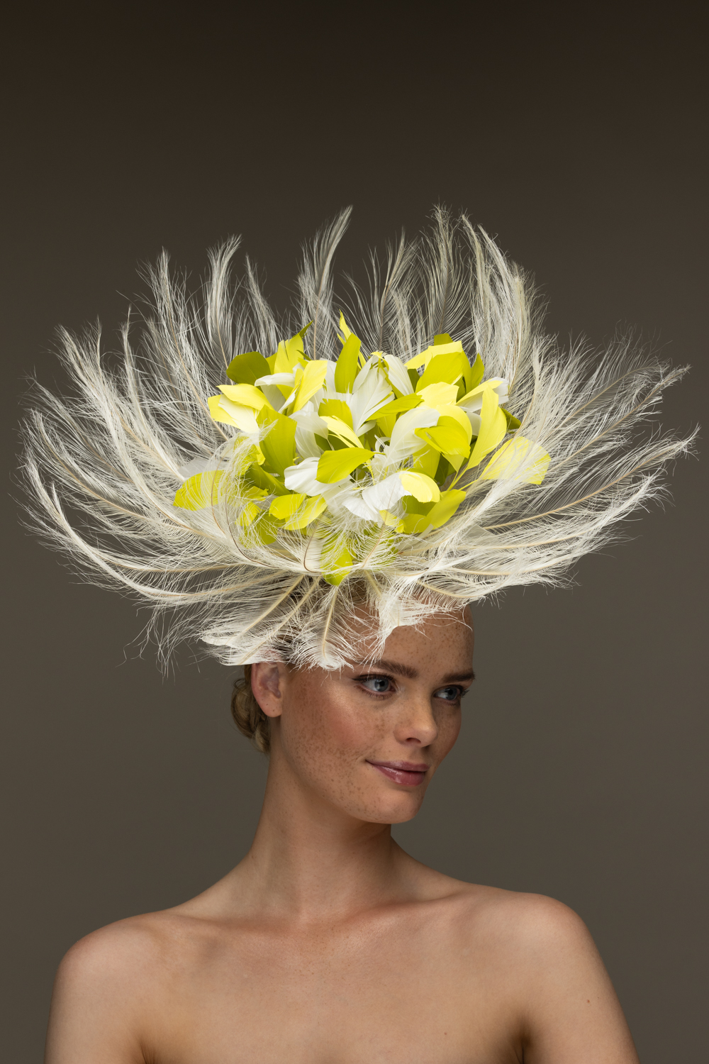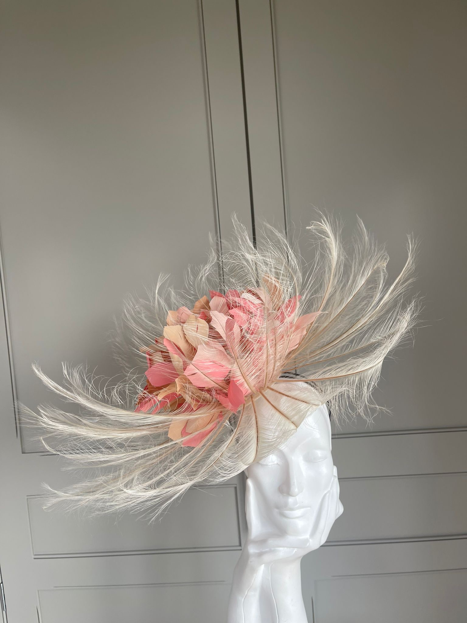 The Amethyst Fascinator is an absolute show stopper. The fascinator consists of a ring of burnt ostrich feathers trimmed to the centre with a large cluster of feathers in up to three different colours.
