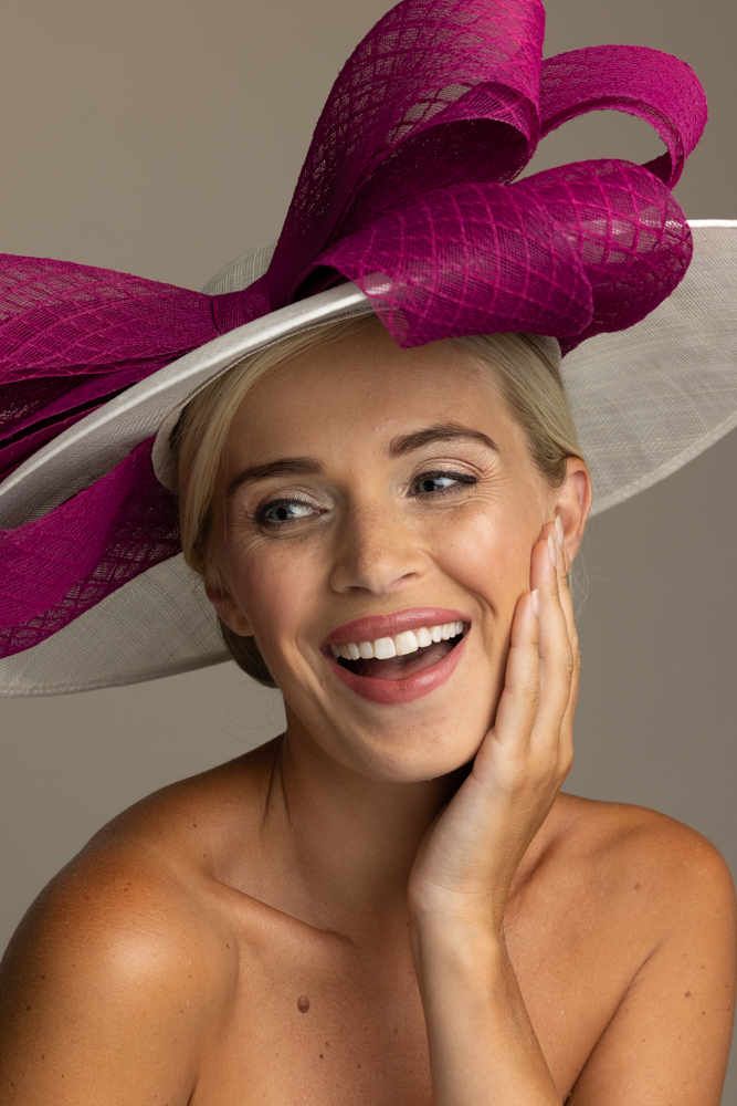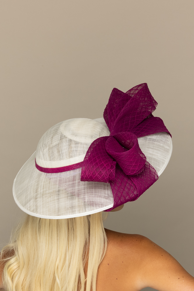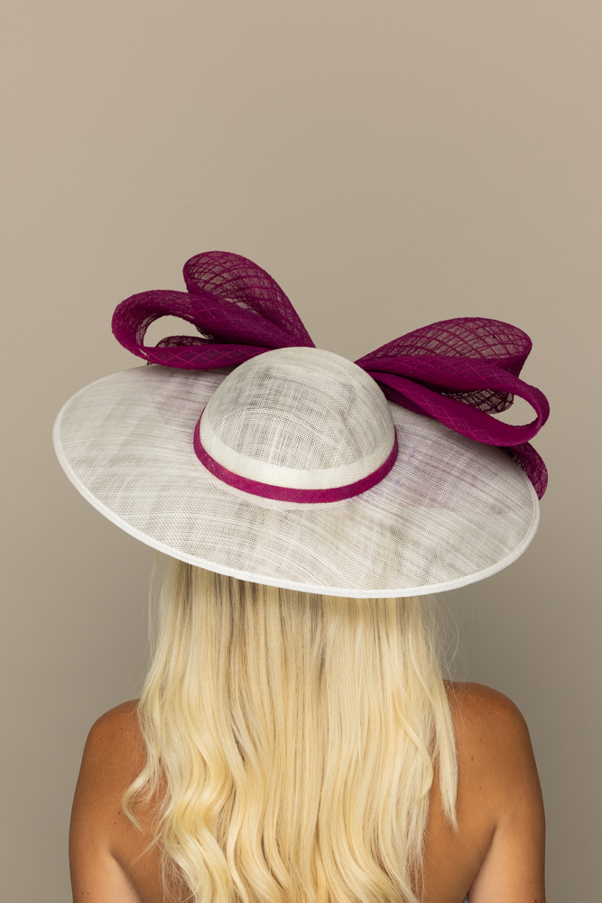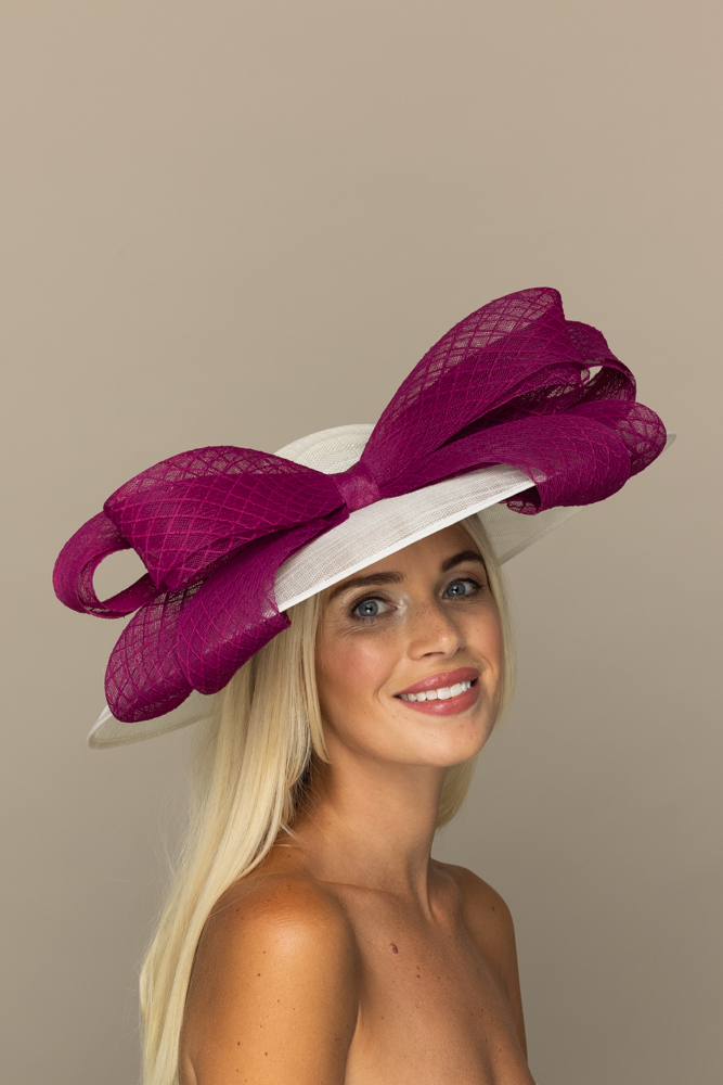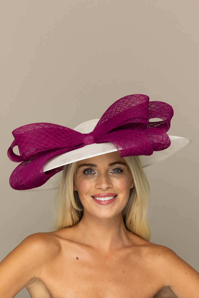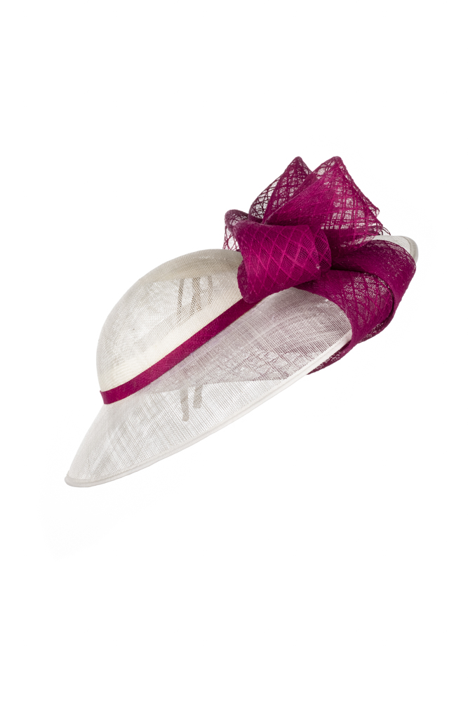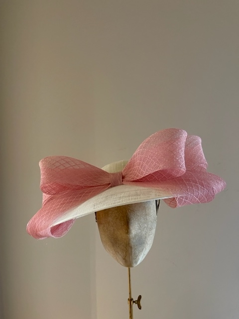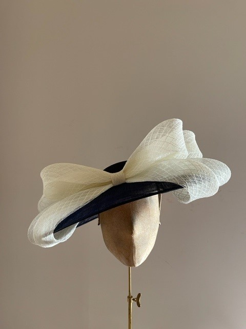 The Andres hat comprises a large sinamay base with a dropped brim, trimmed with a diamond patterned large bow to the front which wraps the underside of the brim. The hat measures 17″ left to right and 15.5″ front to back to give a slight oval shape. The hat comes on a ribbon-wrapped double headband for comfort and security as the hat has a shallow crown.