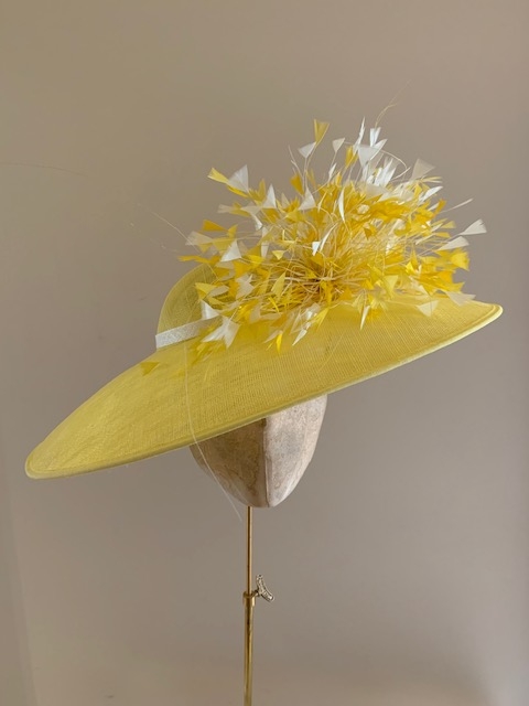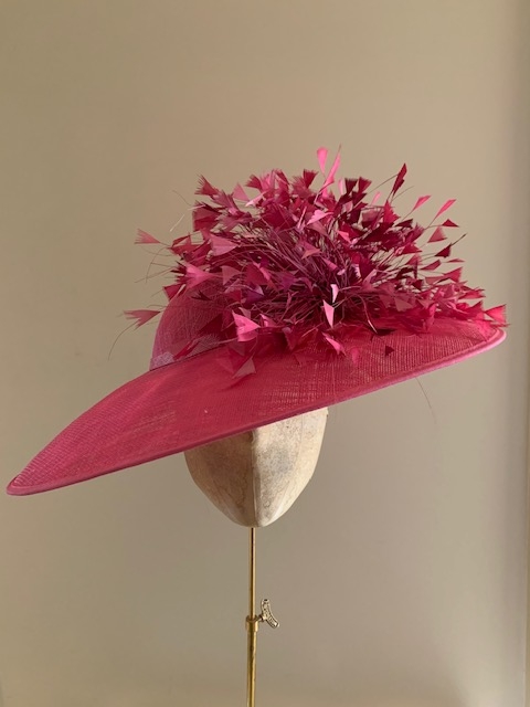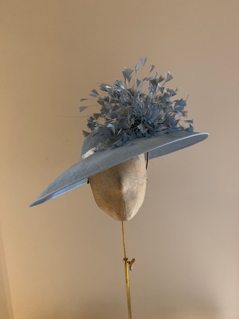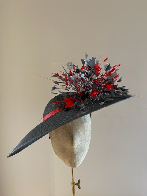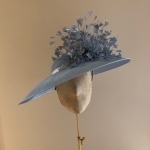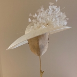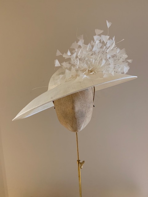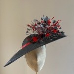 The Ardèche Hat is a feminine take on a wedding hat and would be a great wedding guest or Mother of the Bride or Groom hat. This hat comprises a sinamay base with shallow crown and gently dipped brim trimmed with a band and finished off with a beautiful spray of cut coque feathers.
