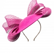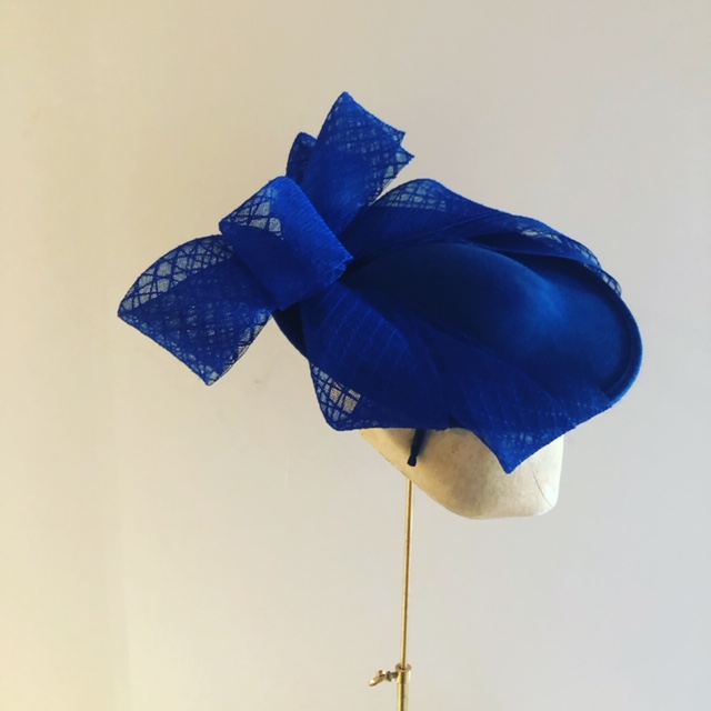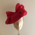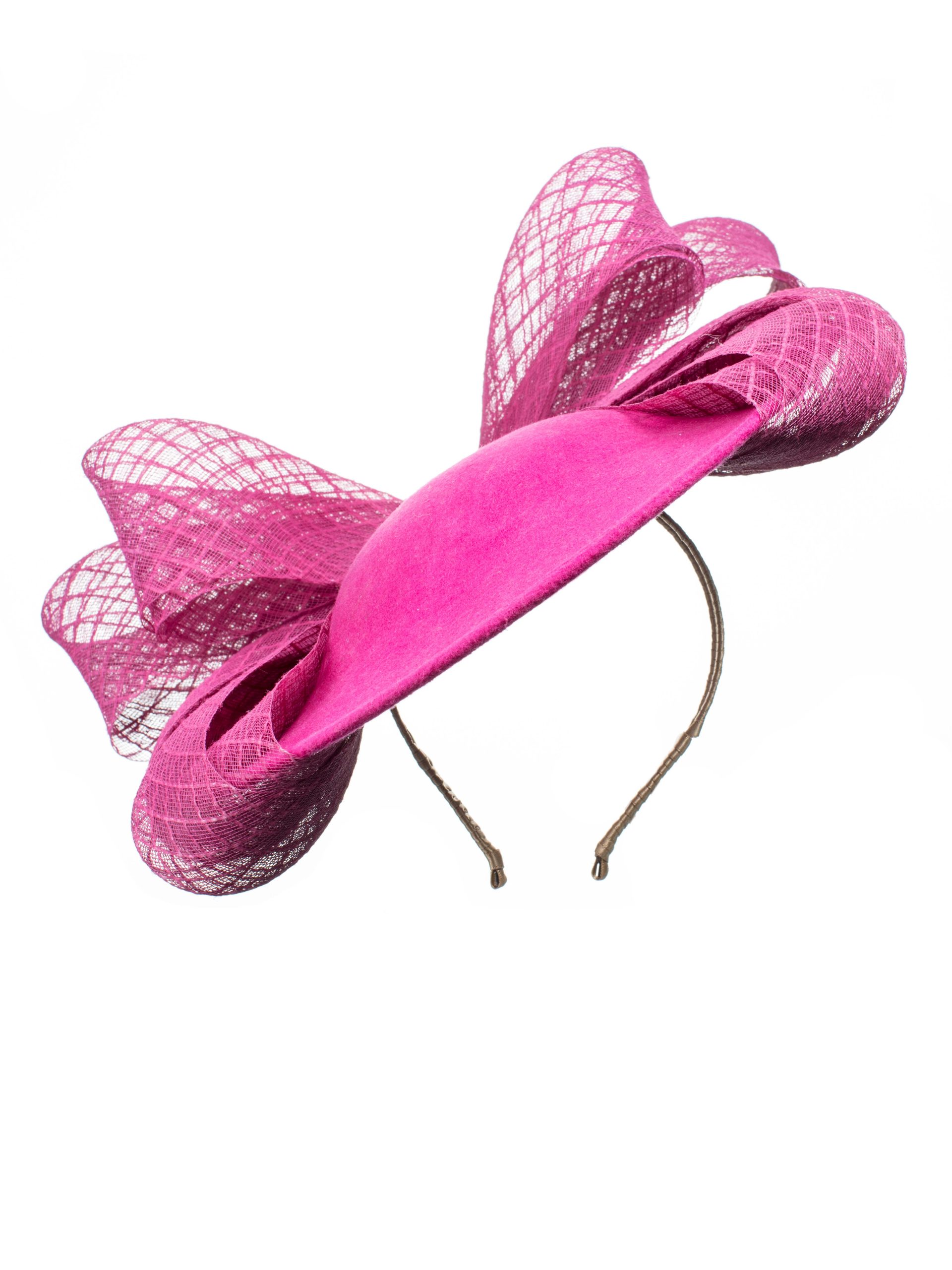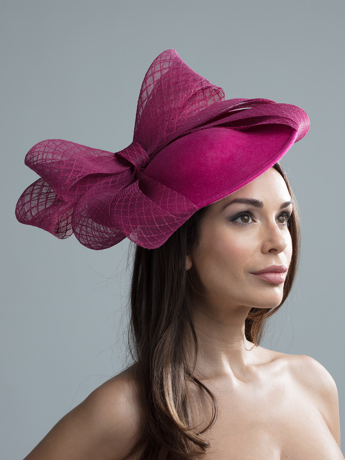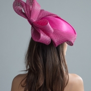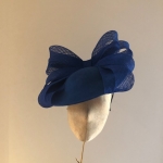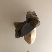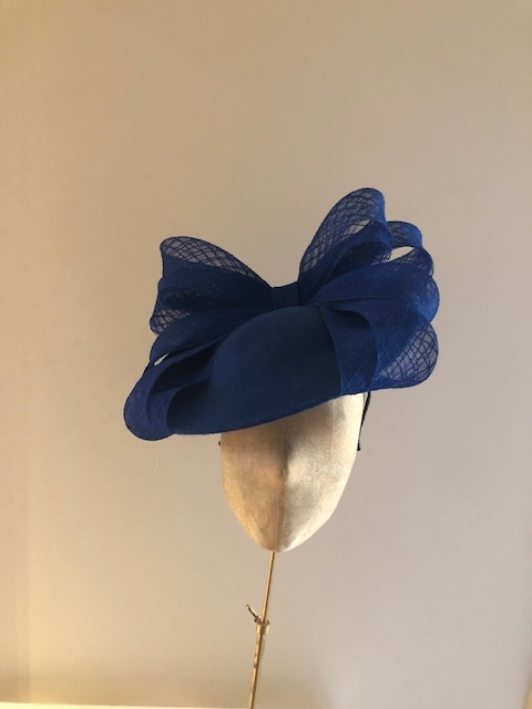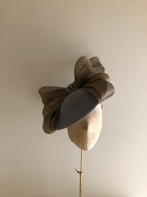 An absolutely beautiful choice for any winter mother of the bride, the Austen dish hat comprises a felt dish base trimmed with a large, double-looped, diamond patterned crinoline bow. The loose ends of the bow wrap neatly around the brim edge. The hat is made on a hair band which we will match to your hair colour.