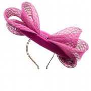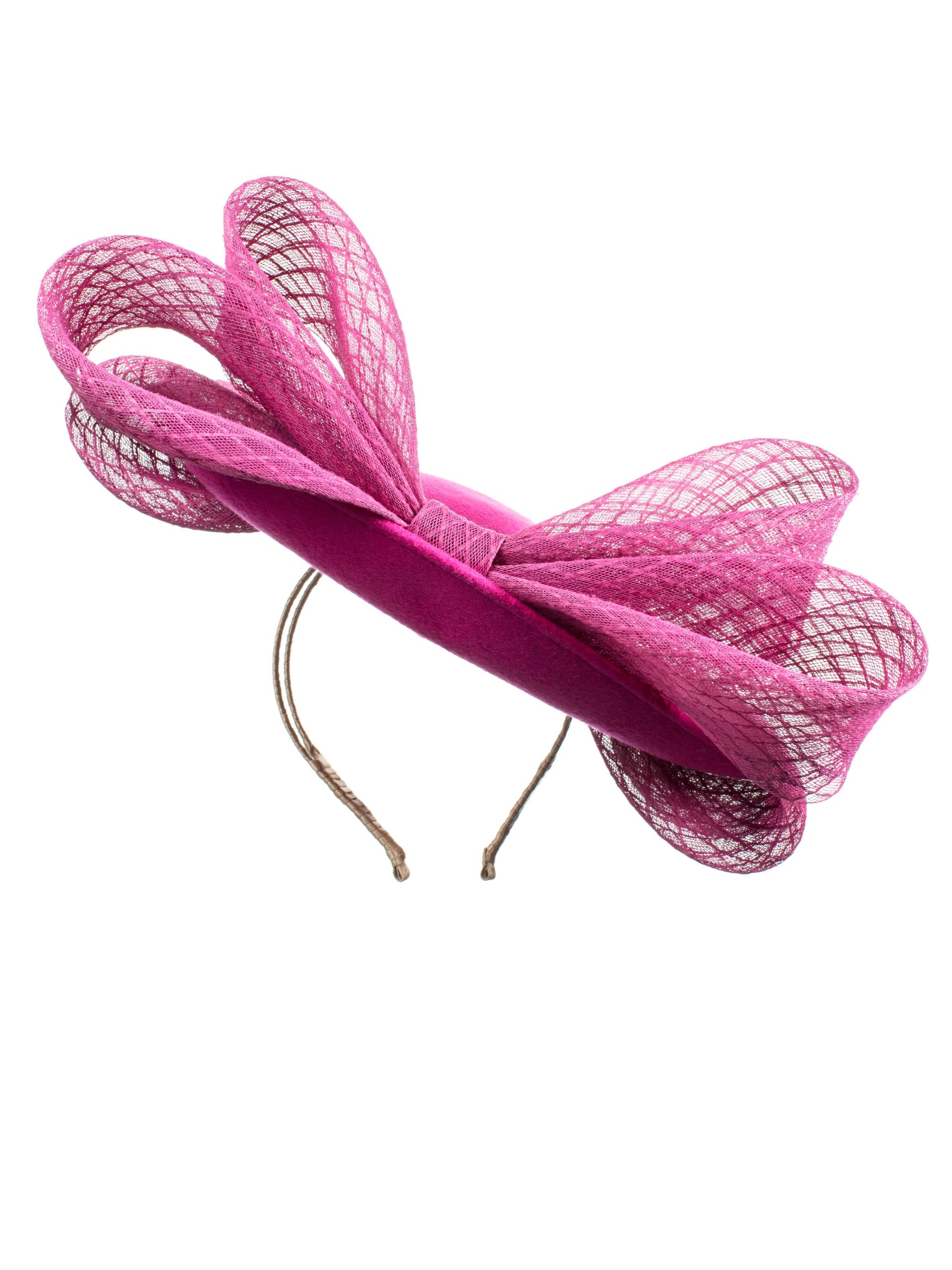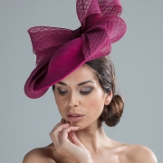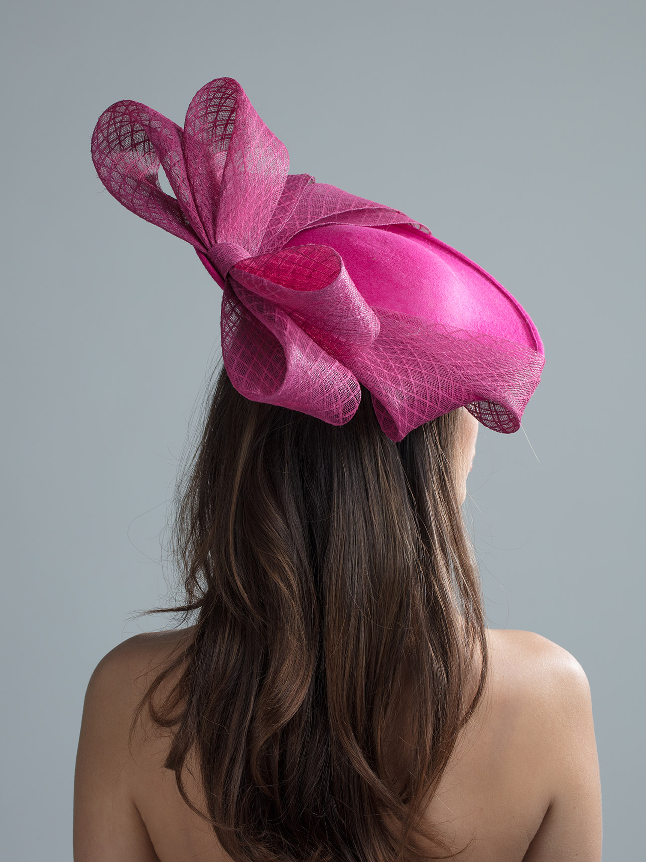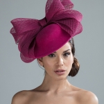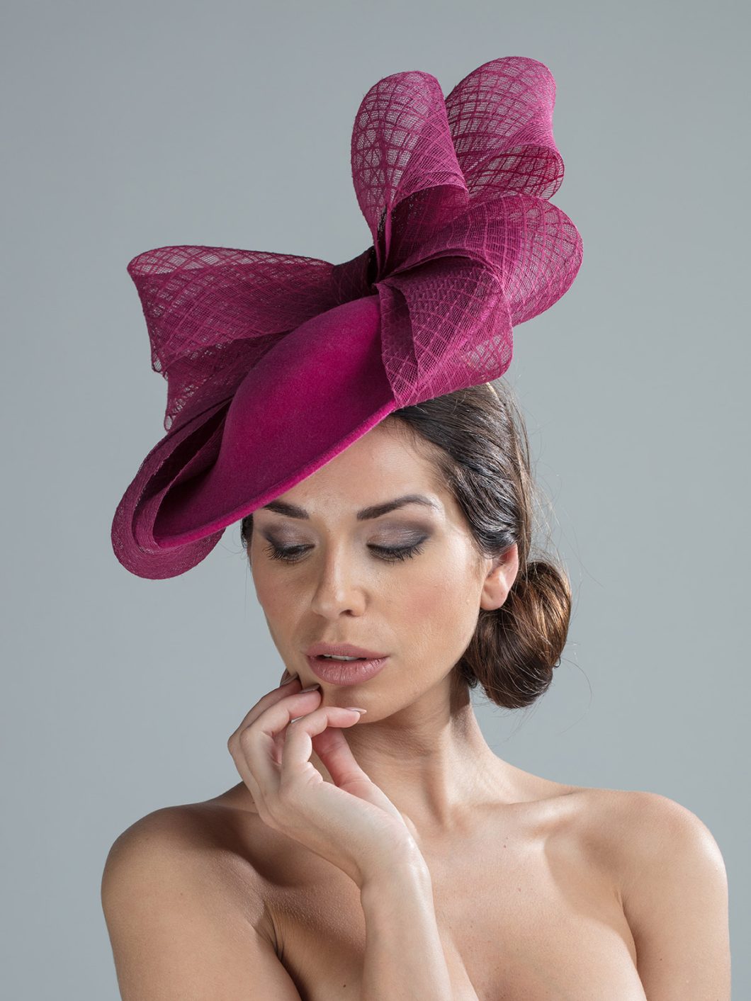 An absolutely beautiful choice for any winter mother of the bride, the Austen dish hat comprises a felt dish base trimmed with a large, double-looped, diamond patterned crinoline bow. The loose ends of the bow wrap neatly around the brim edge. The hat is made on a hair band which we will match to your hair colour.