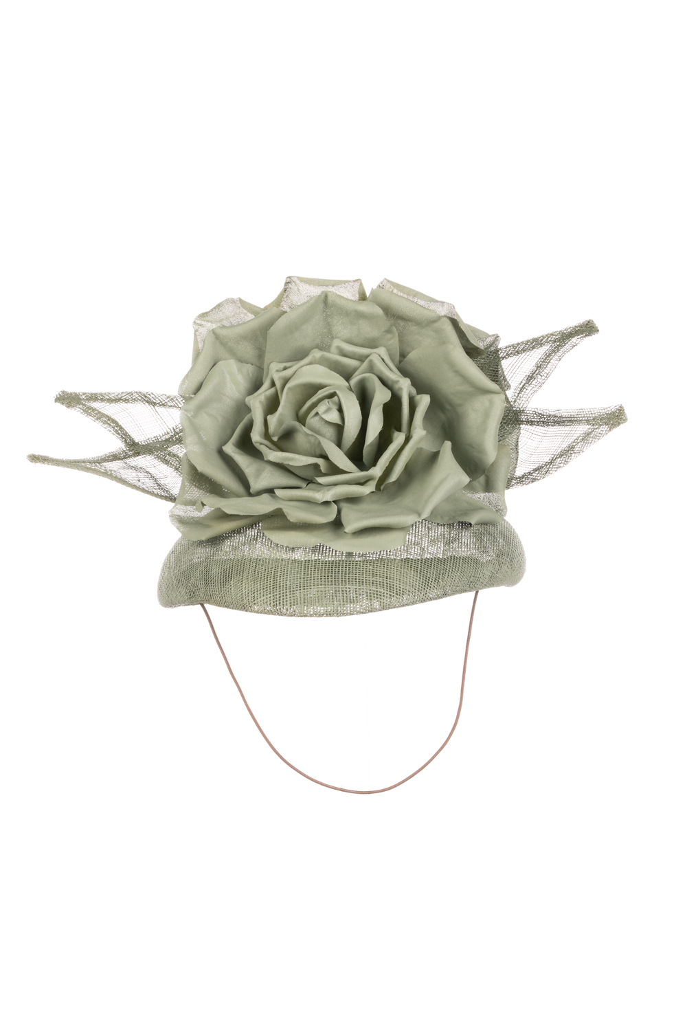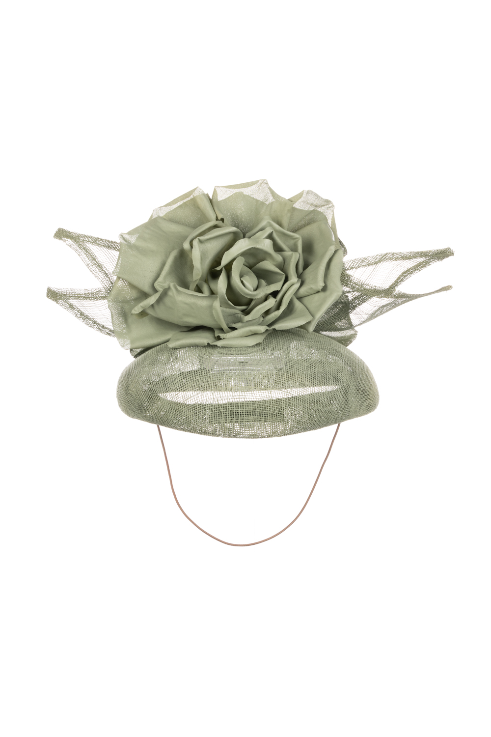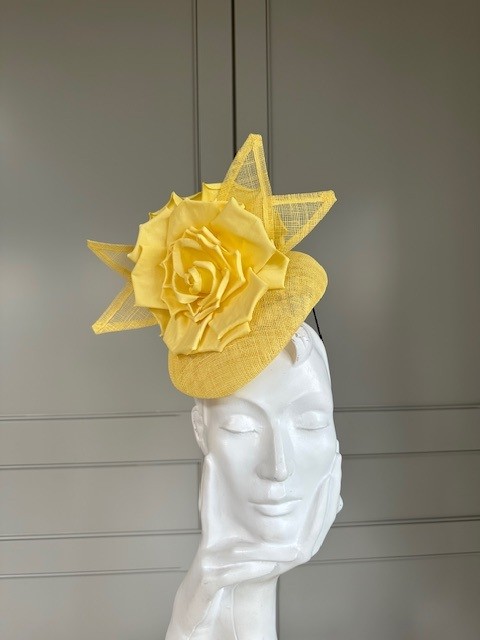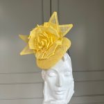 The Balfour Pillbox hat comprises a sinamay pillbox base trimmed to the top with a rose style flowers and sinamay leaves.