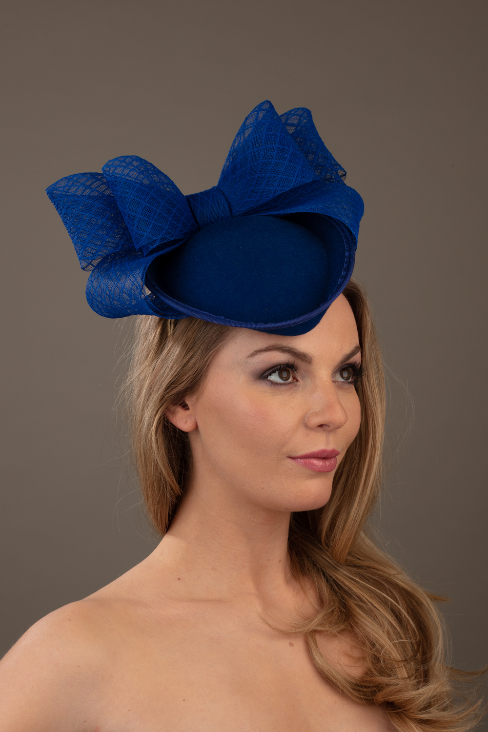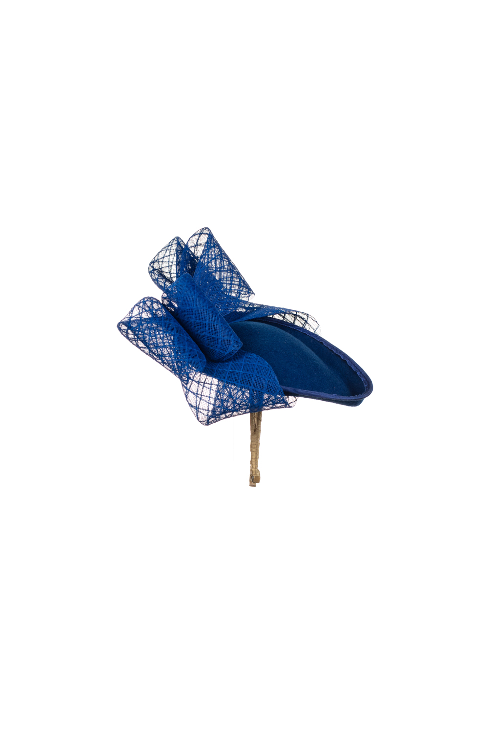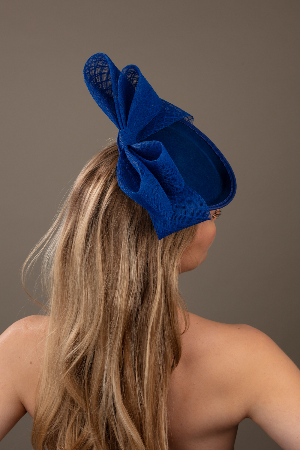 The Barolo Cocktail Hat is a stunning little teardrop shaped felt dish hat with upturned brim to the back. The back is then trimmed with a luxurious diamond patterned crinoline double bow with ends that wrap the underside of the hat. We love this hat in the bright yet rich royal blue colour.