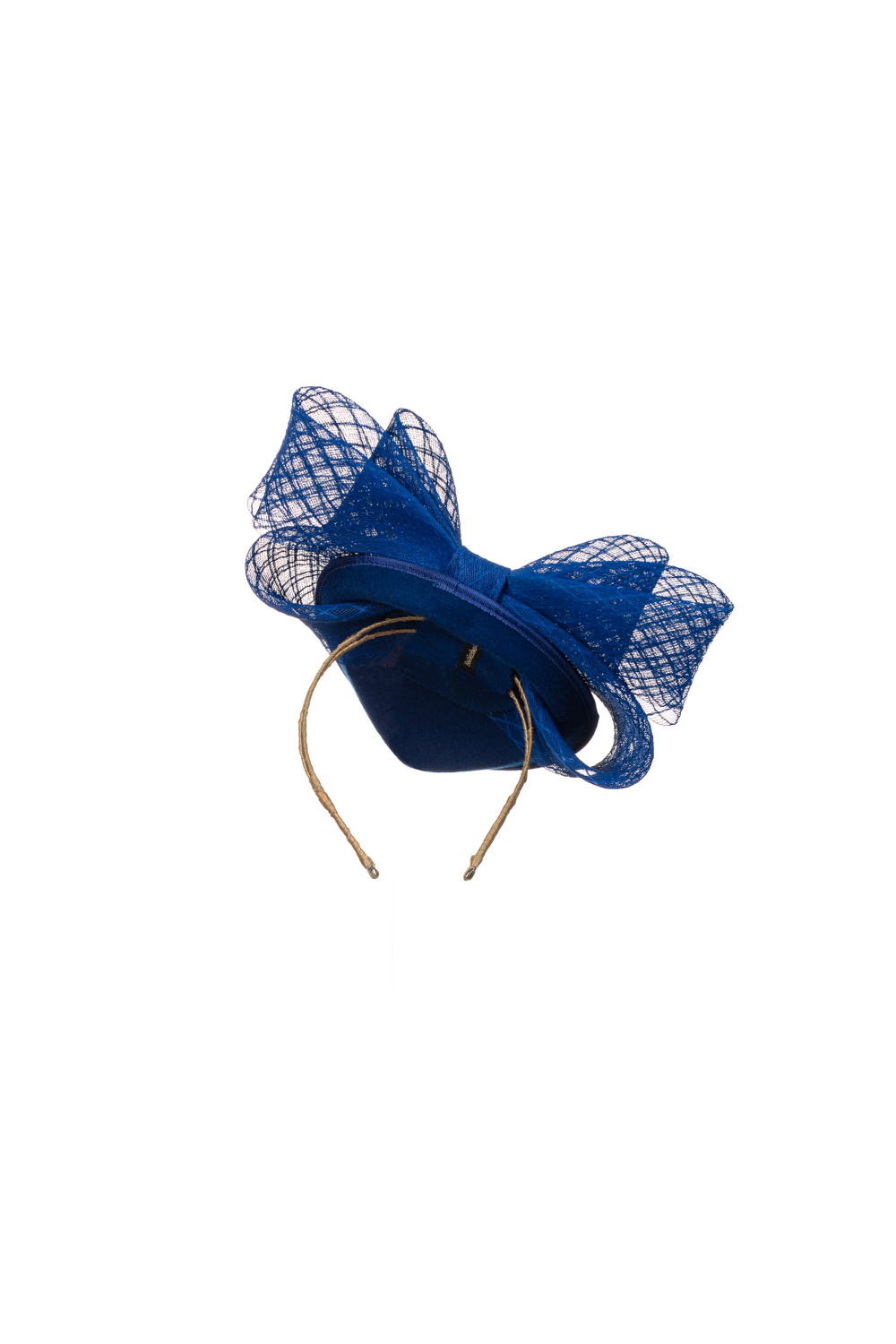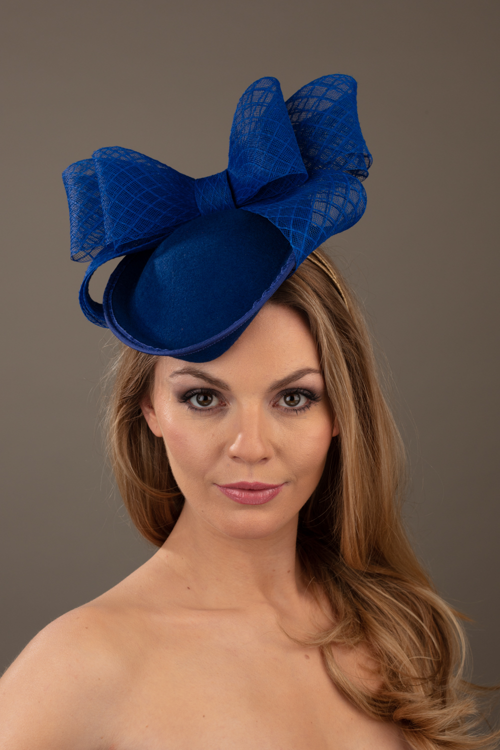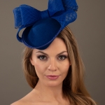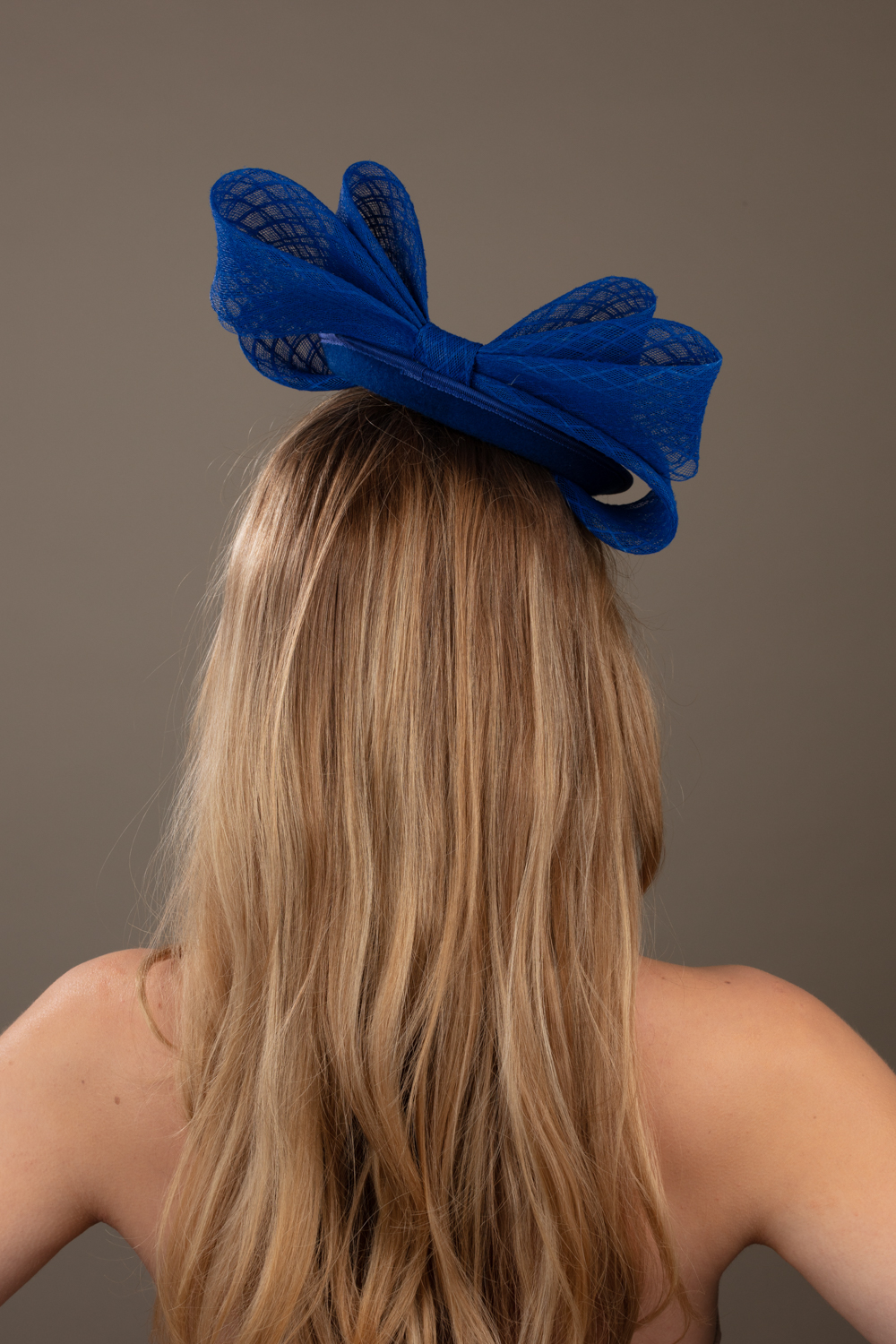 The Barolo Cocktail Hat is a stunning little teardrop shaped felt dish hat with upturned brim to the back. The back is then trimmed with a luxurious diamond patterned crinoline double bow with ends that wrap the underside of the hat. We love this hat in the bright yet rich royal blue colour.