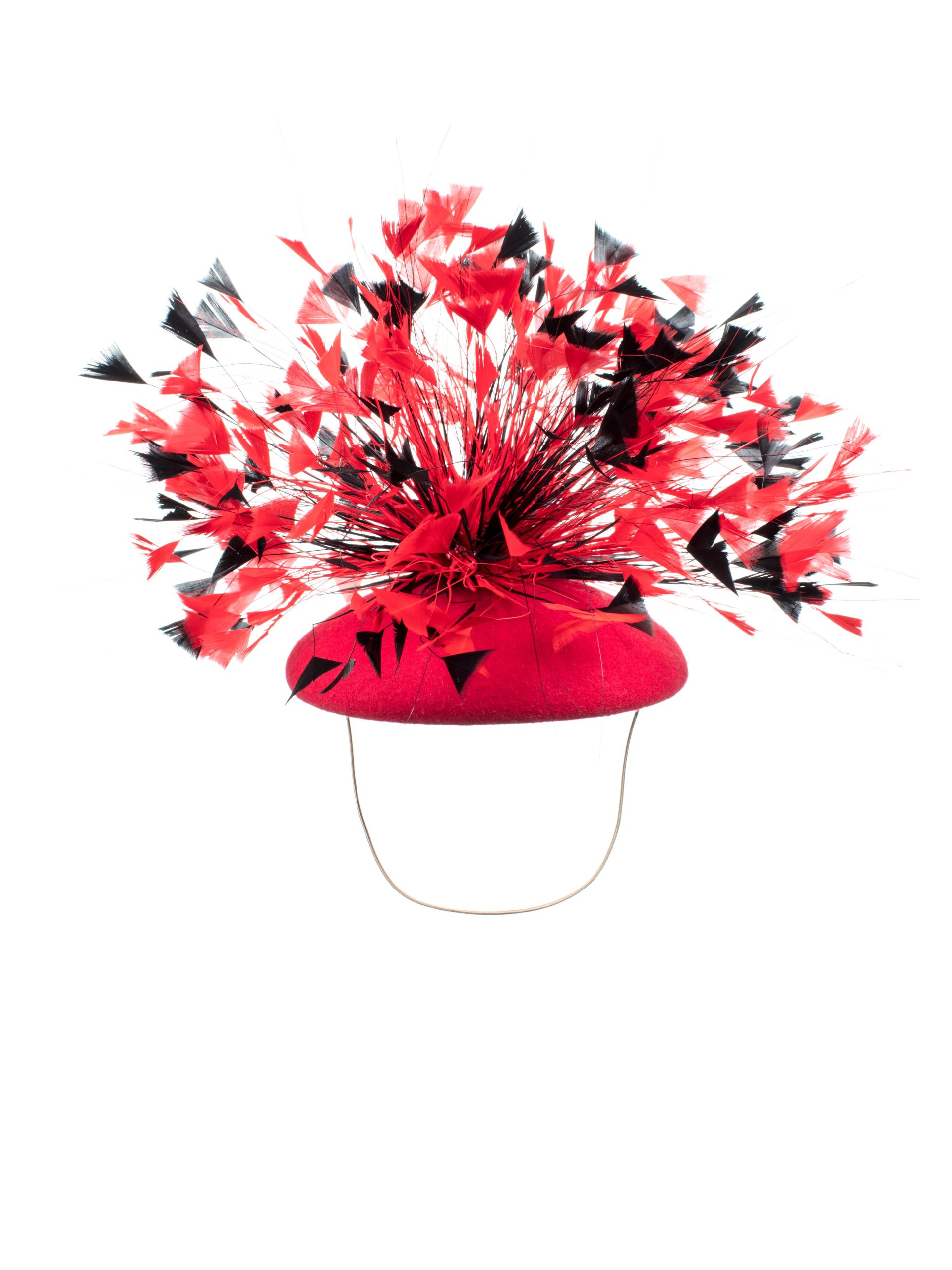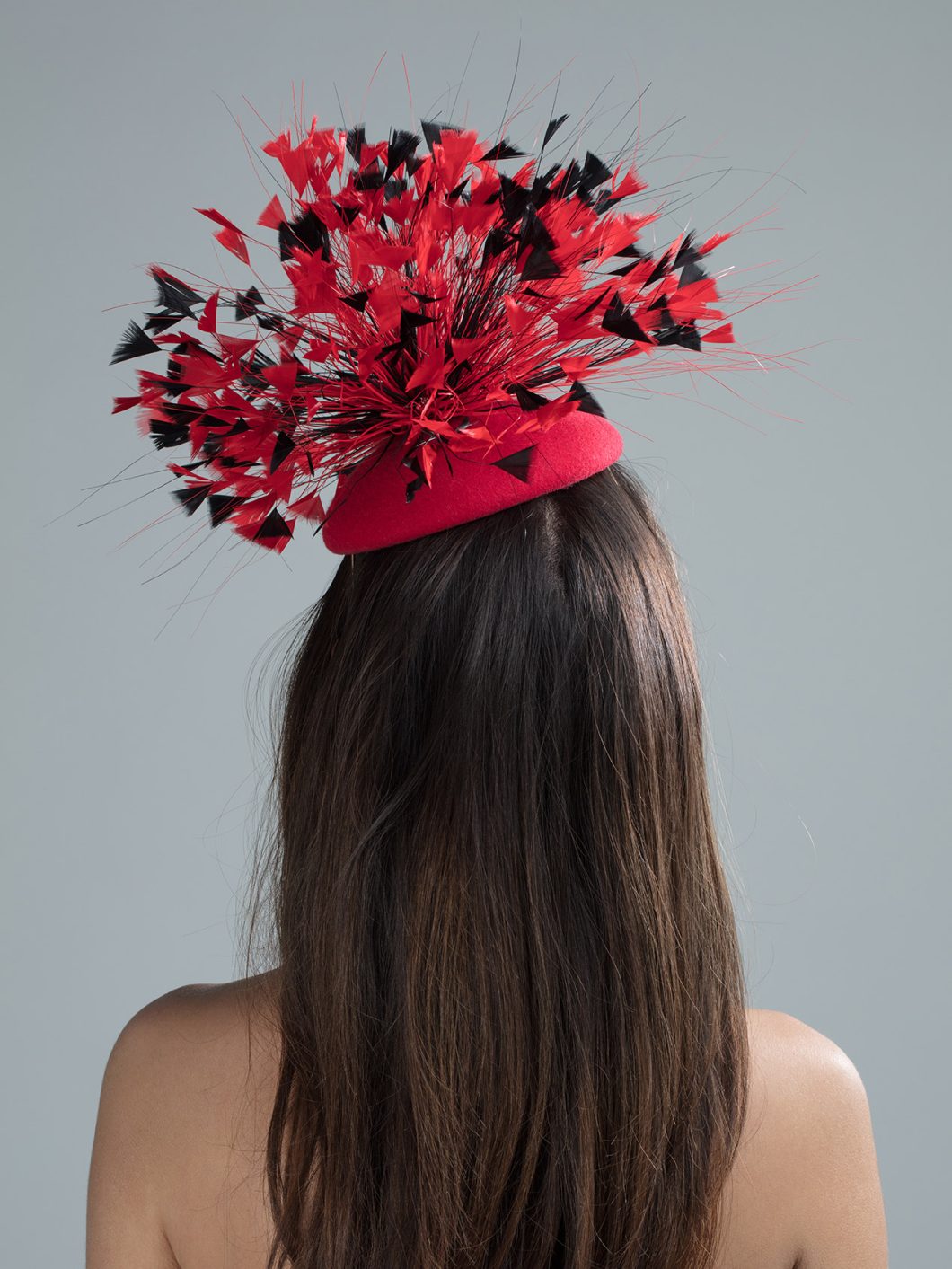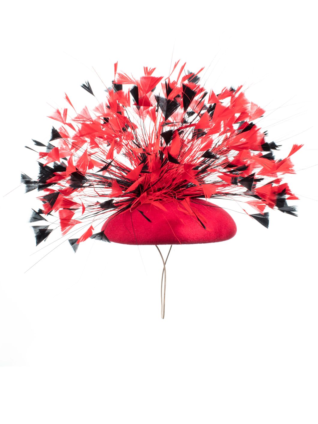 The Beautrix pillbox hat is a stunning statement hat for a winter wedding or a day and the races. The pillbox style hat comprises a red felt base trimmed with a bold spray of cut coque feathers in up to 3 different colours.