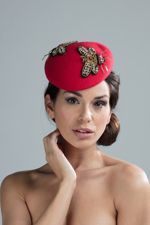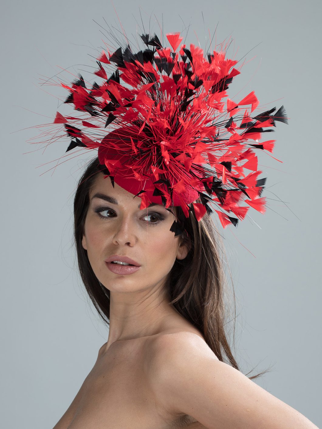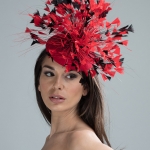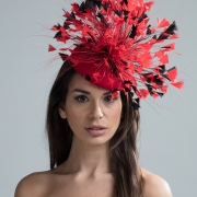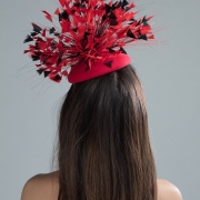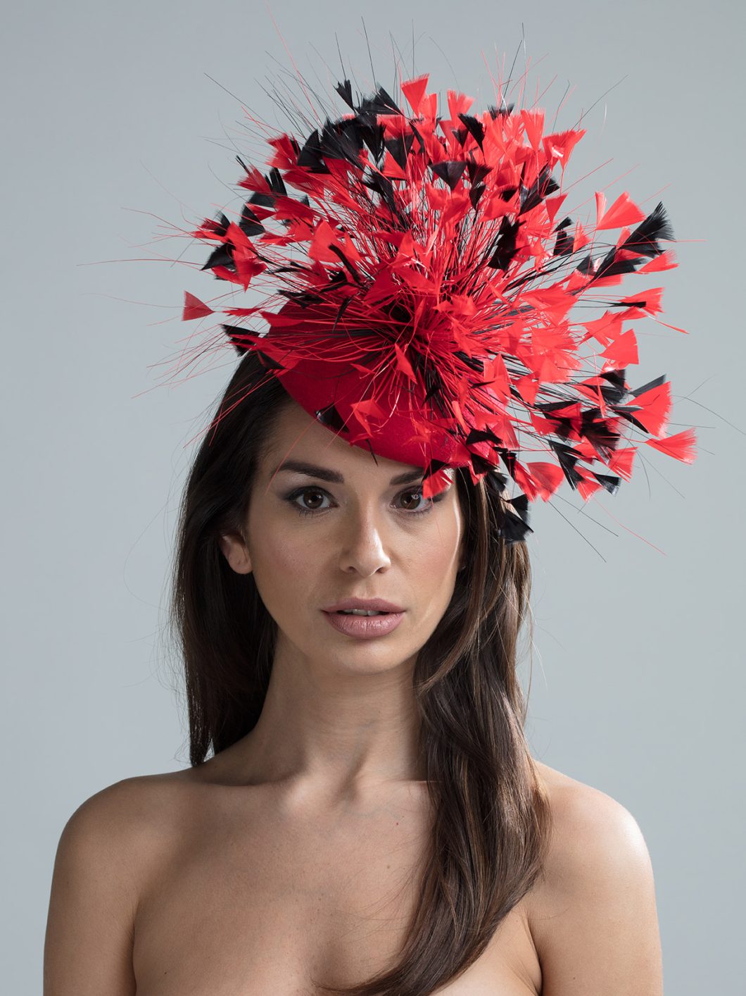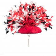 The Beautrix pillbox hat is a stunning statement hat for a winter wedding or a day and the races. The pillbox style hat comprises a red felt base trimmed with a bold spray of cut coque feathers in up to 3 different colours.