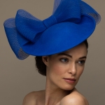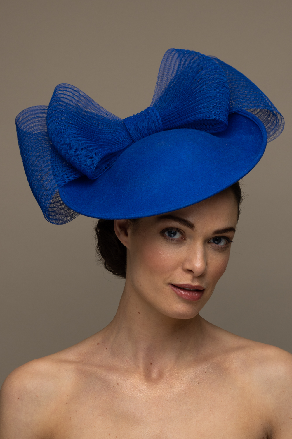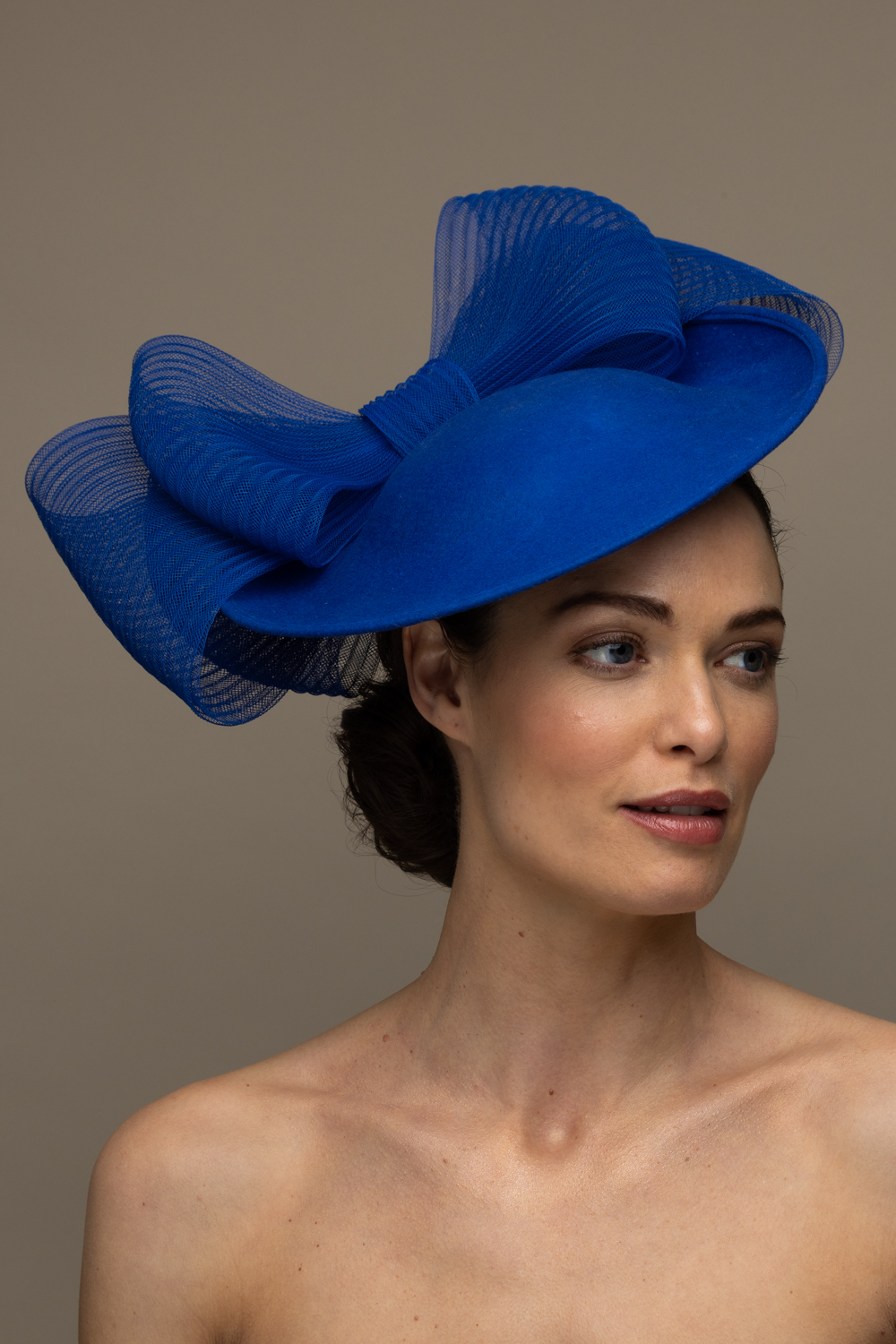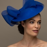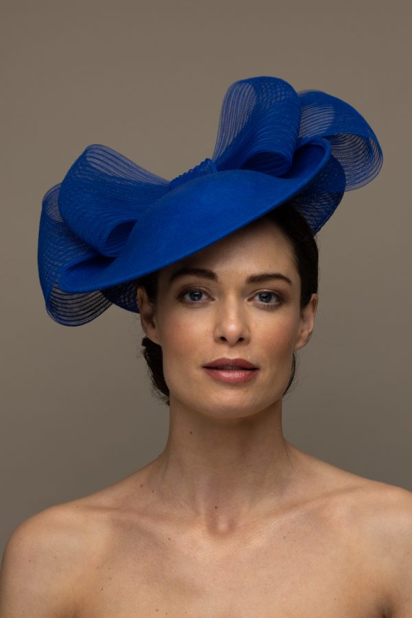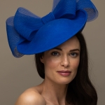 The Belle Dish hat is the perfect winter mother of the bride or groom hat. It comprises a 12″ dish base trimmed to the back, both above and below the brim with large double looped bows made form ribbed crinoline. This hat comes on a comfortable, ribbon wrapped double head band which we will match to your hair colour.