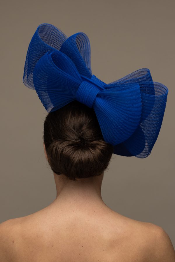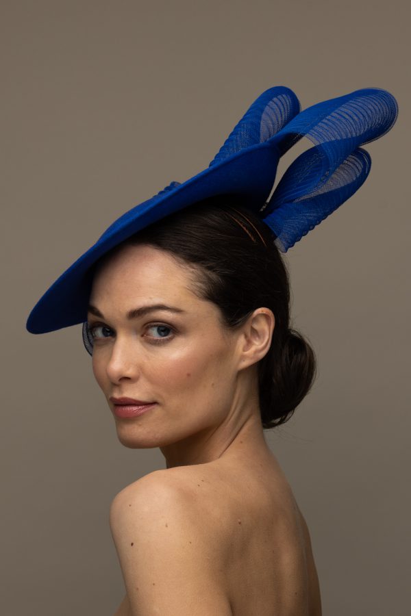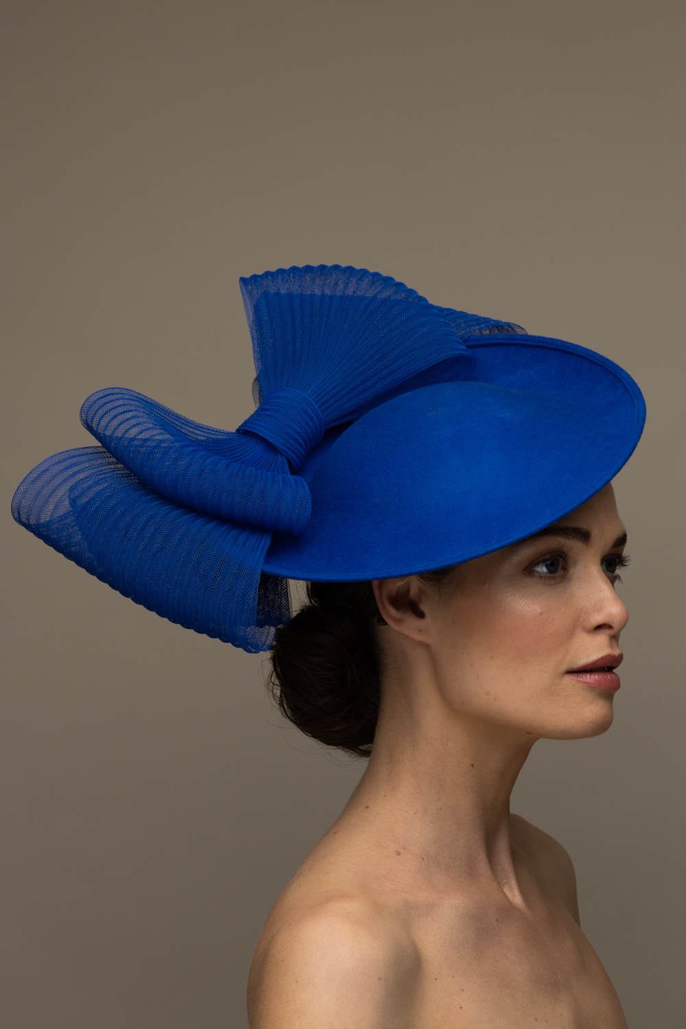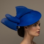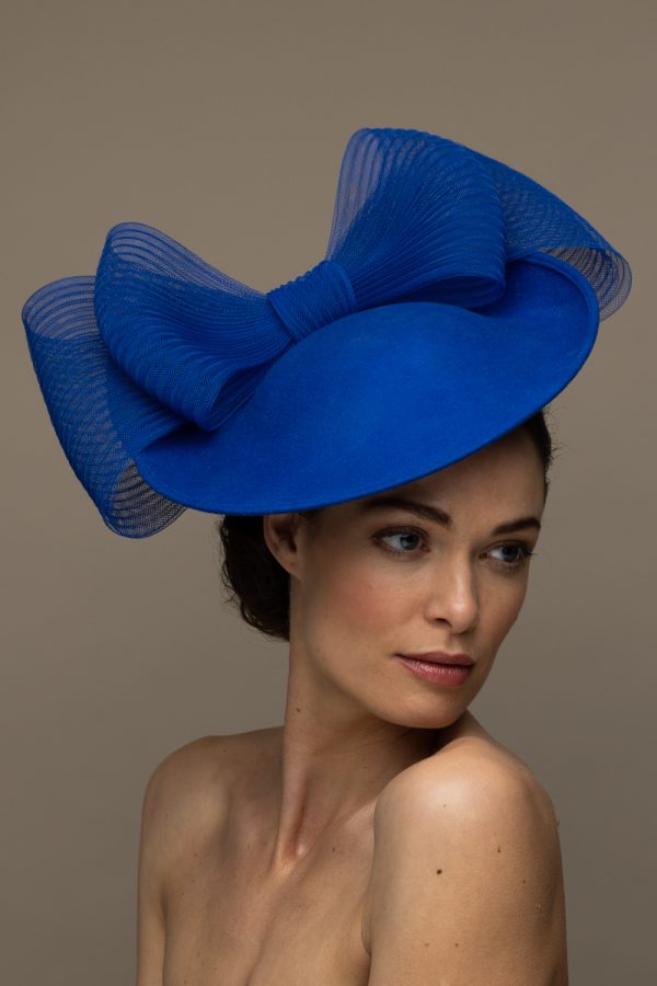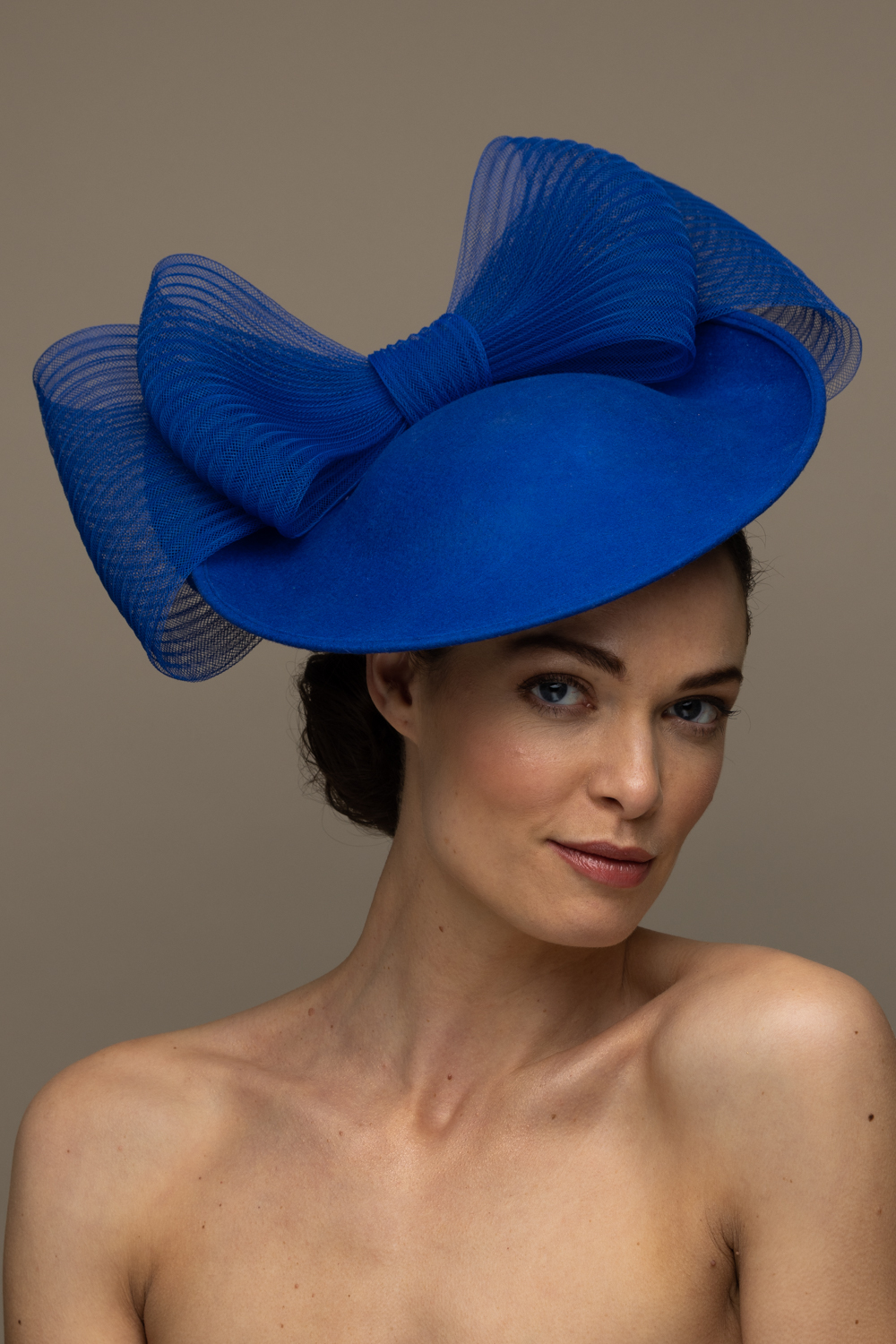 The Belle Dish hat is the perfect winter mother of the bride or groom hat. It comprises a 12″ dish base trimmed to the back, both above and below the brim with large double looped bows made form ribbed crinoline. This hat comes on a comfortable, ribbon wrapped double head band which we will match to your hair colour.