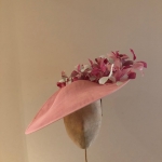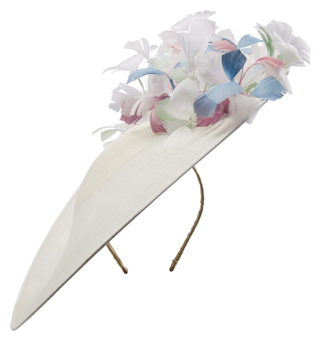 The Bellini dish hat comprises an angled sinamay dish base embellished with beautiful flowers. This hat comes on a covered headband which will be matched to your hair colour for a seamless finish to your outfit.