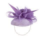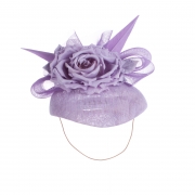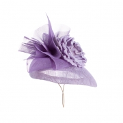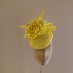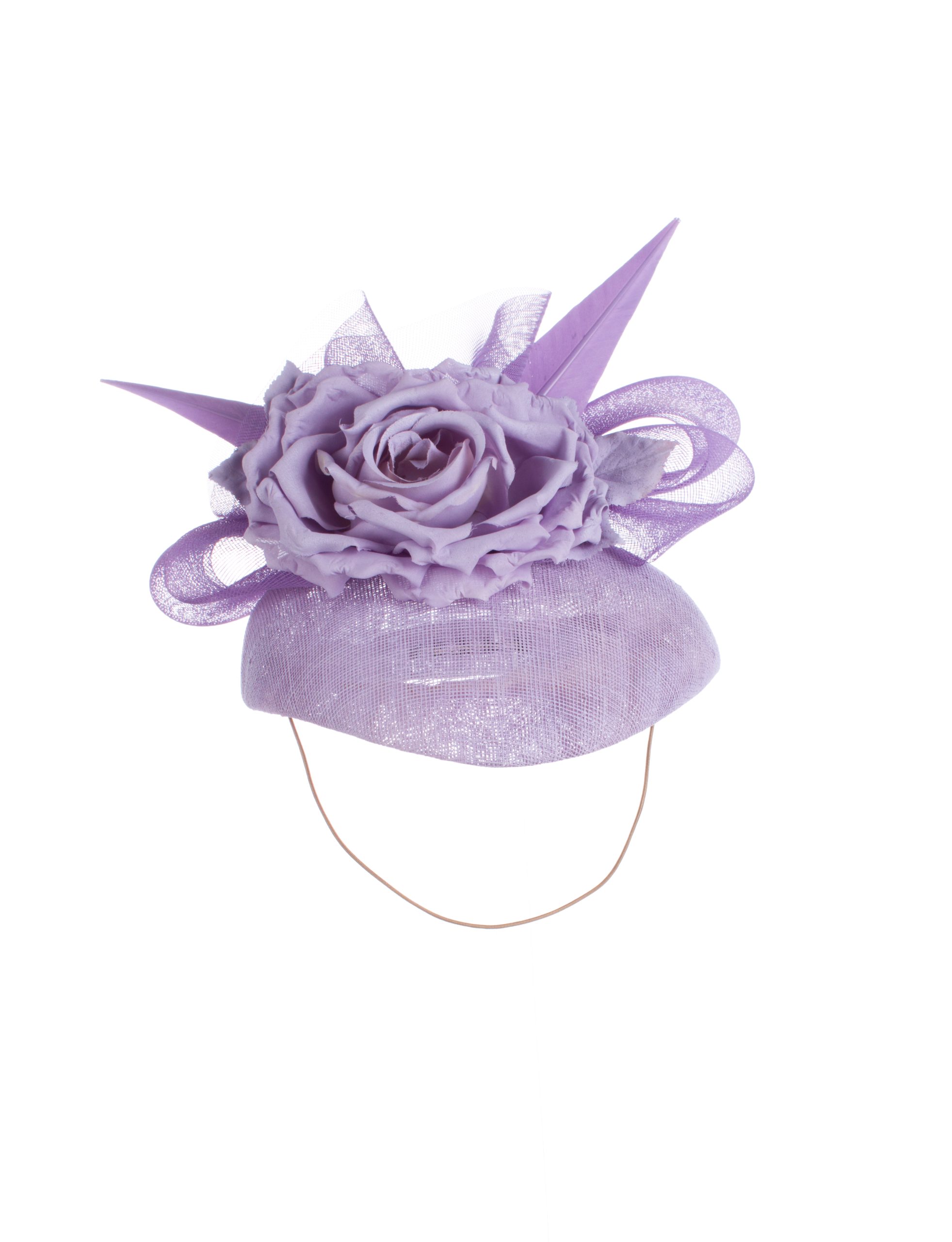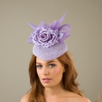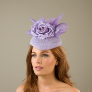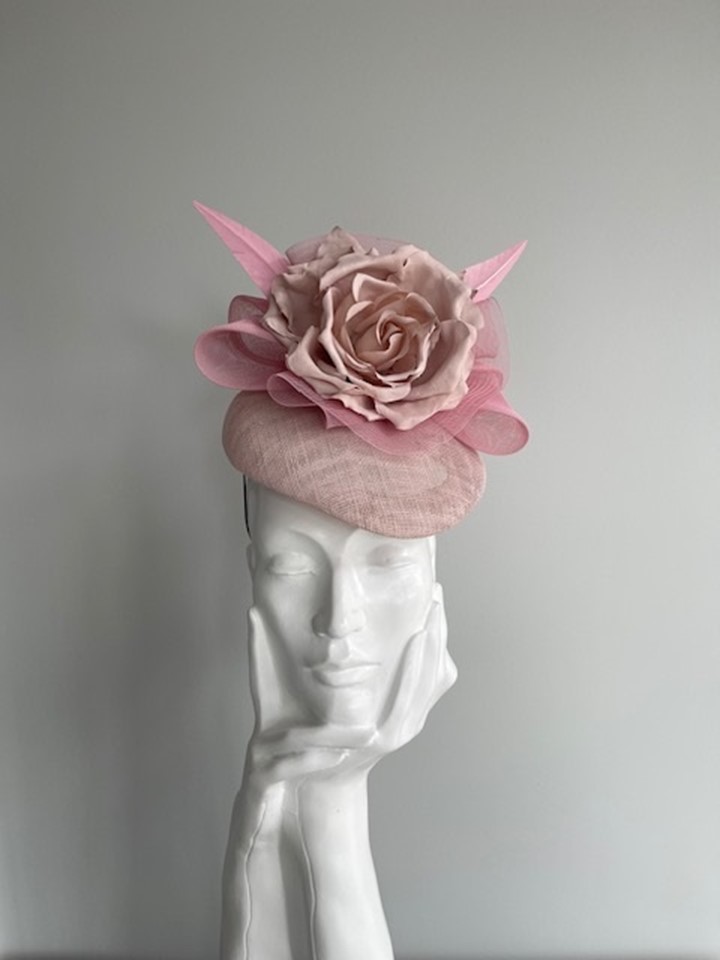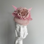 The Berwick Pillbox hat comprises a sinamay pillbox base trimmed with a large English style rose which is beautifully framed with a crinoline bow and two short feathers.