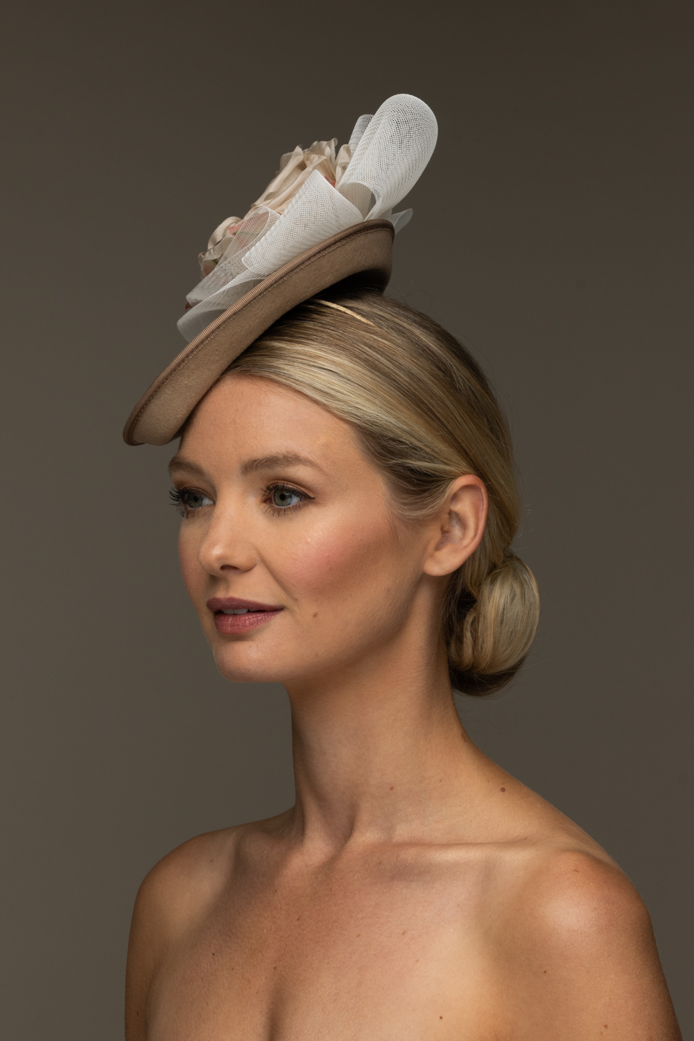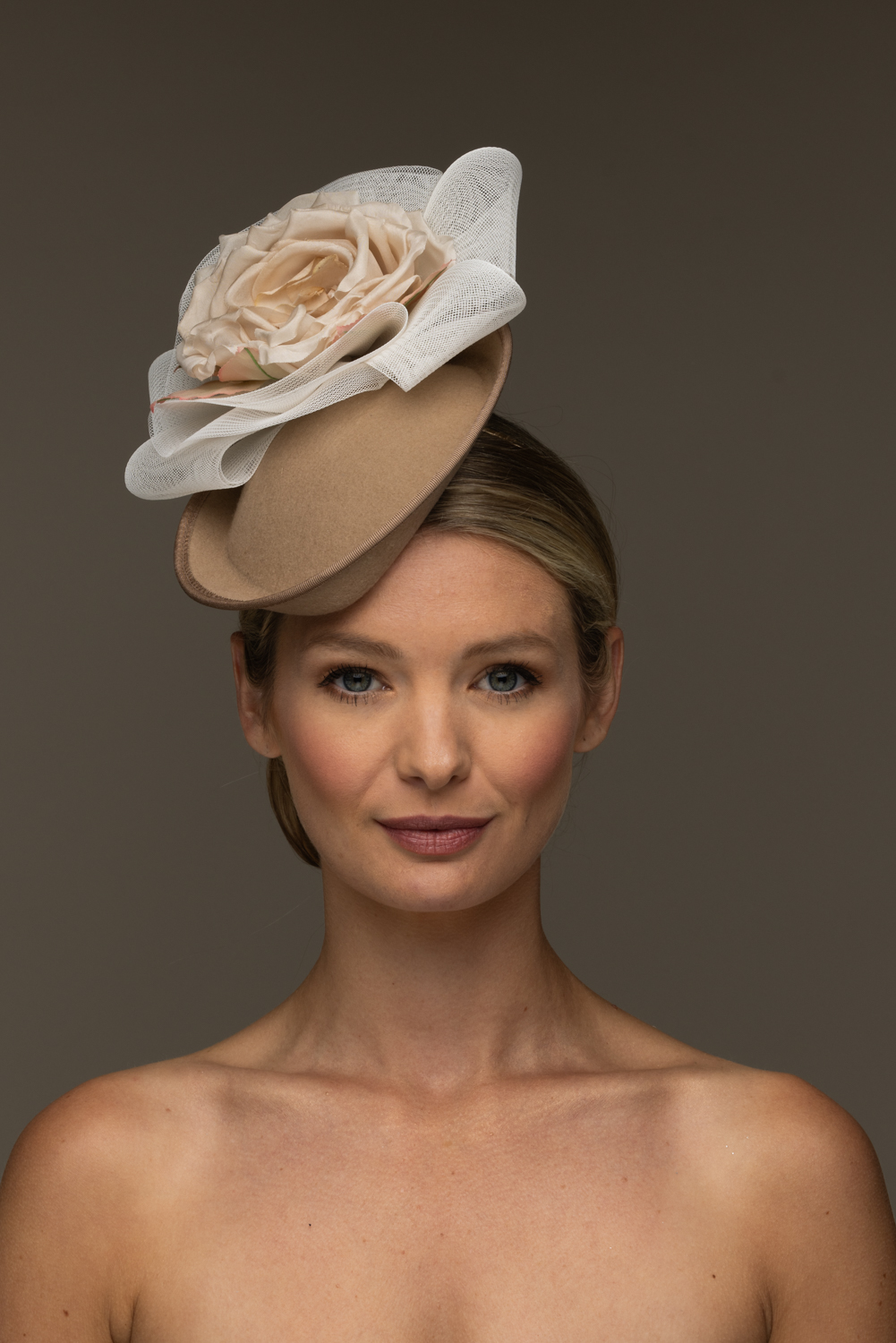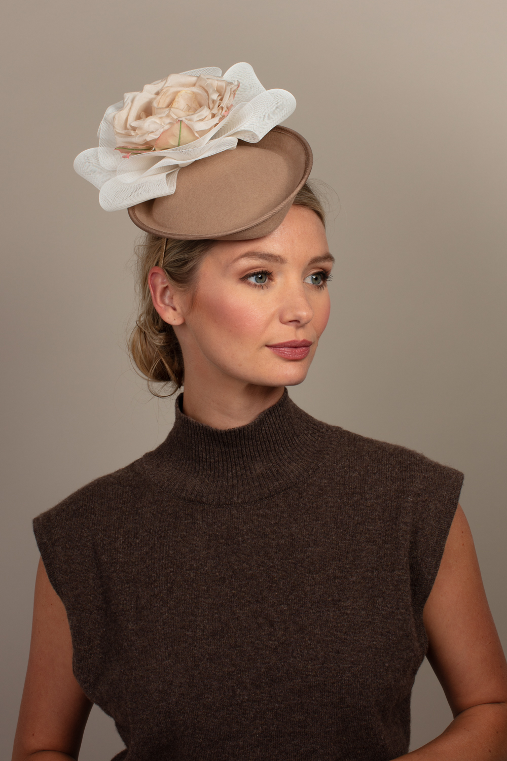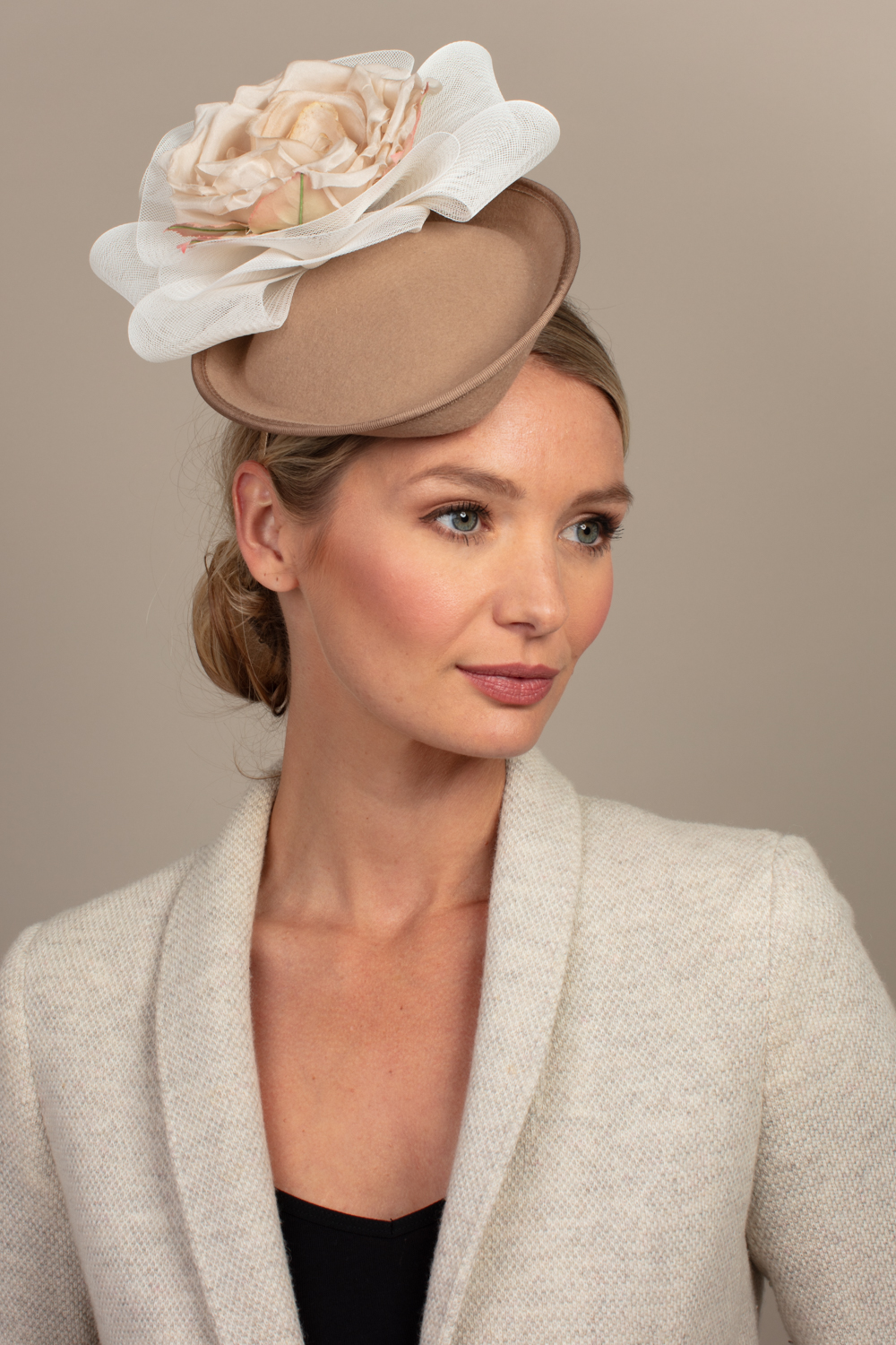 As with all of our hats, you can have your Biden Cocktail hat in any colour way you wish. Choose your felt base colour here and your crinoline & rose colours from this extensive colour chart. We are happy to send out colour swatches so you can be sure that your chosen colours perfectly match your outfit. To order colour samples click here.