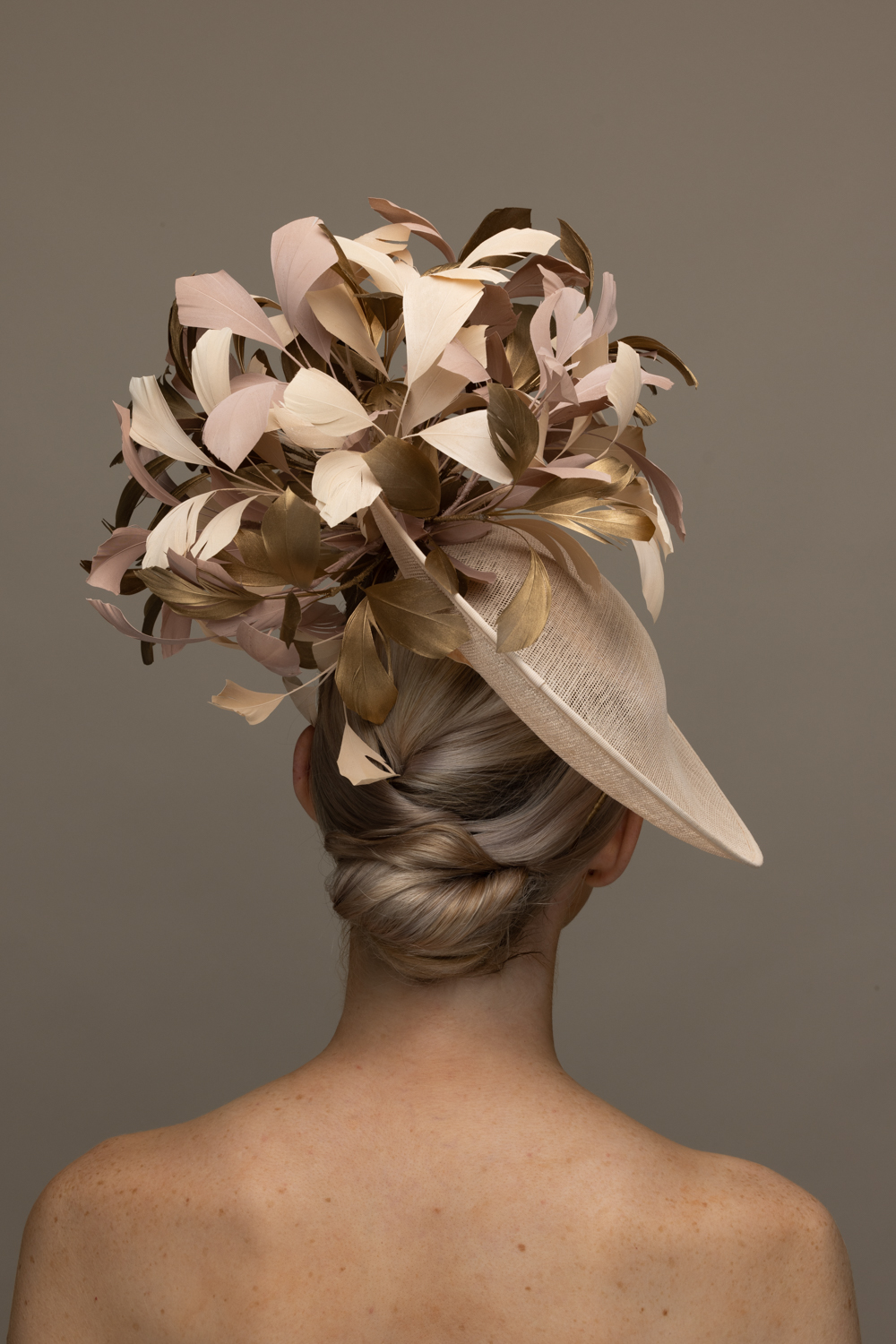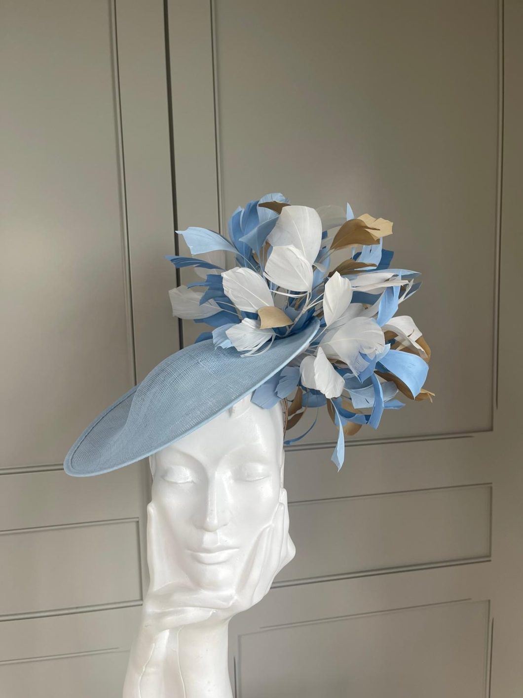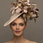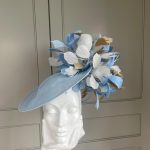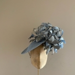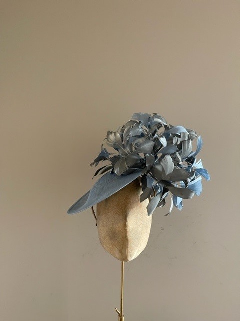 The Blackmore Dish Hat comprises a 12″, sinamay dish base trimmed on one side with feathers, both above and underneath the brim. This hat comes on a comfortable double head band which will be ribbon wrapped to match your hair colour.
