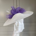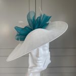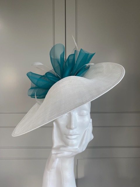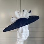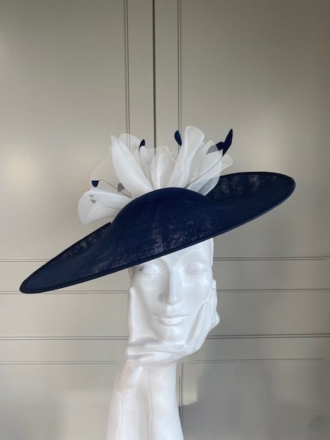 The Bourne hat comprises a large sinamay dish base with shallow crown trimmed to the back with crinoline offset with contrasting feathers.