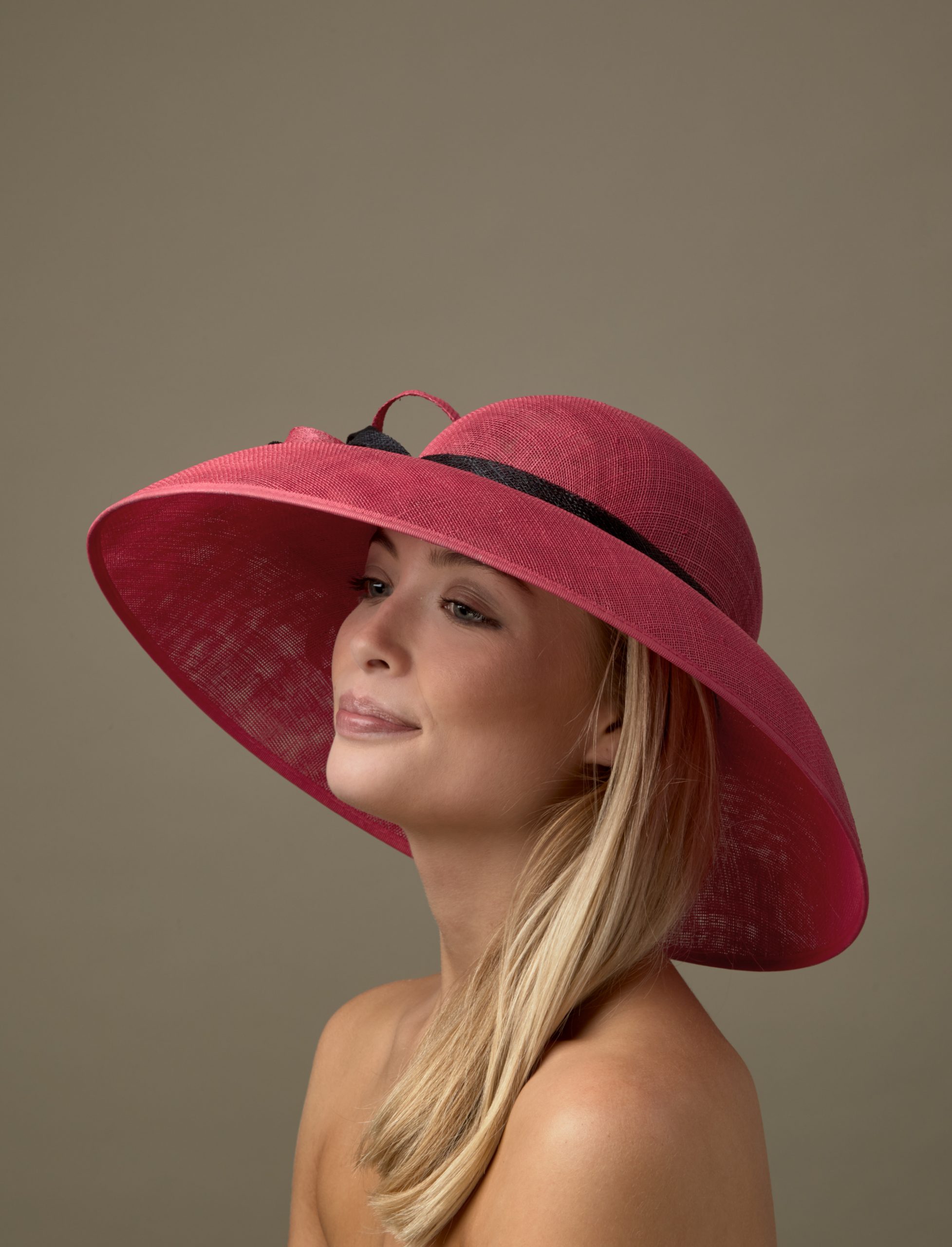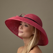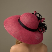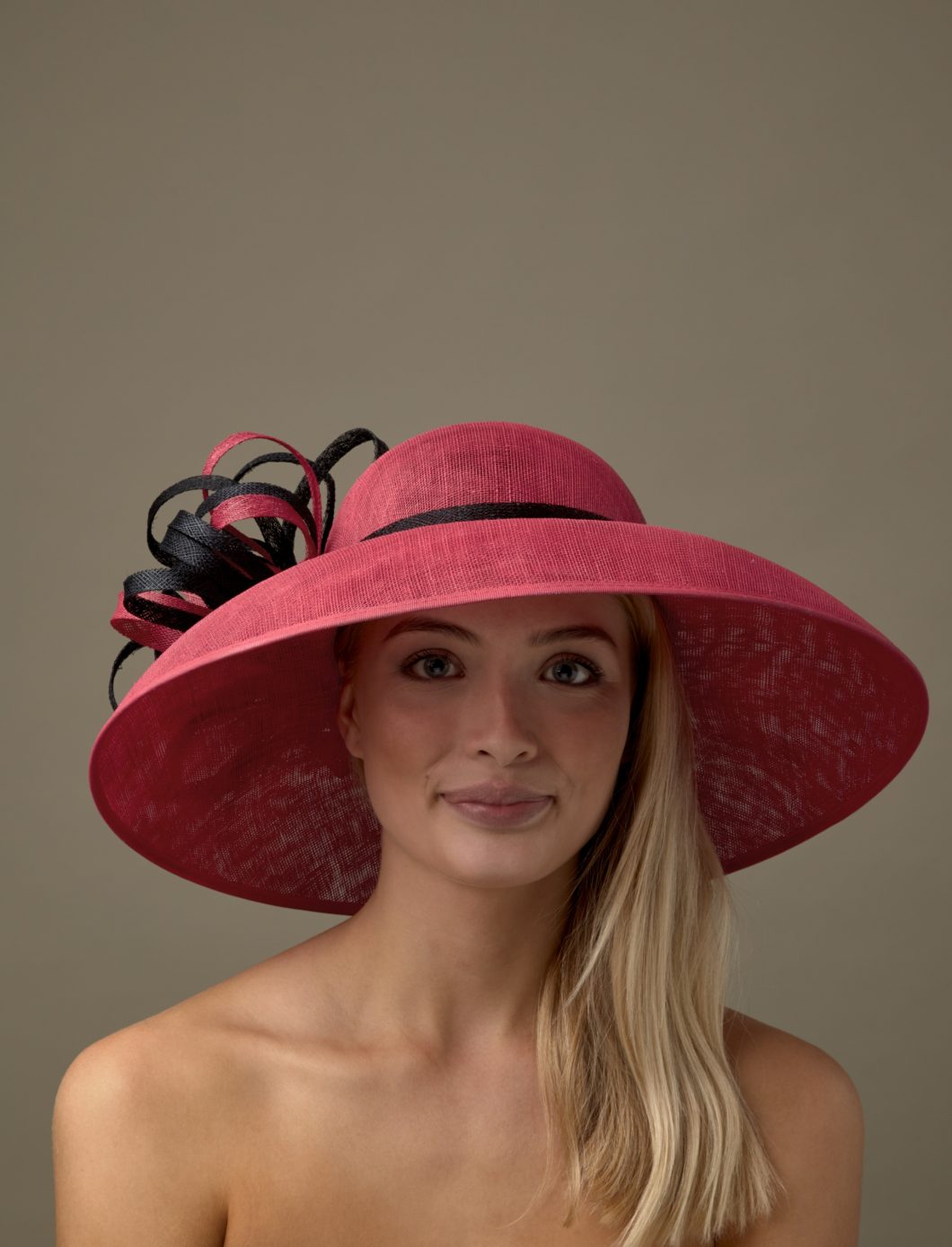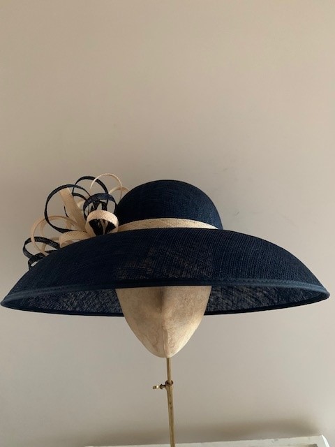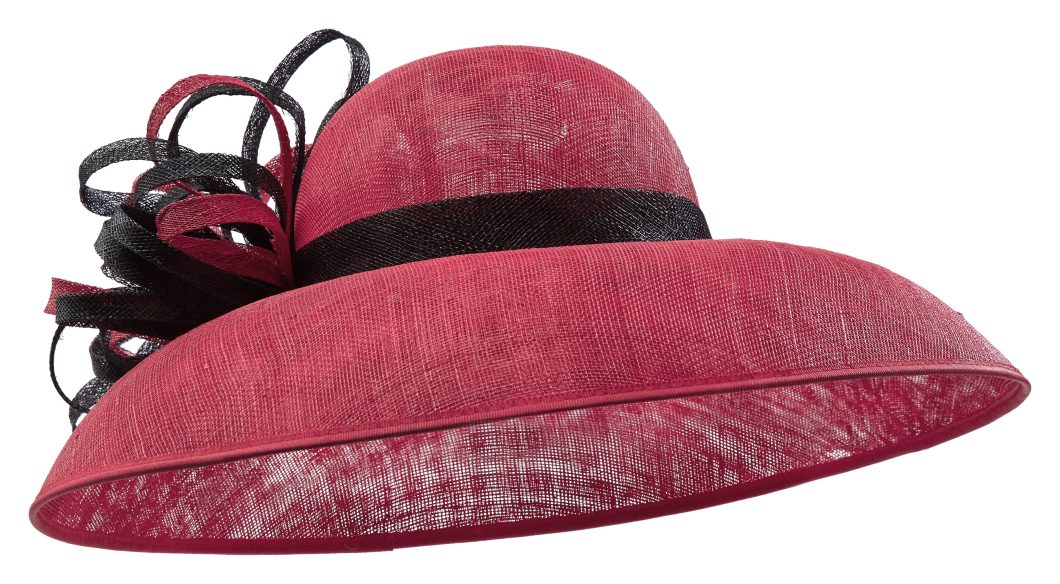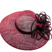 The Brandy hat is a really fun take on a classic hat. It comprises a drop-edged sinamay hat base with a coloured band and trimmed with loops of sinamay, in up to 3 colours, to one side.