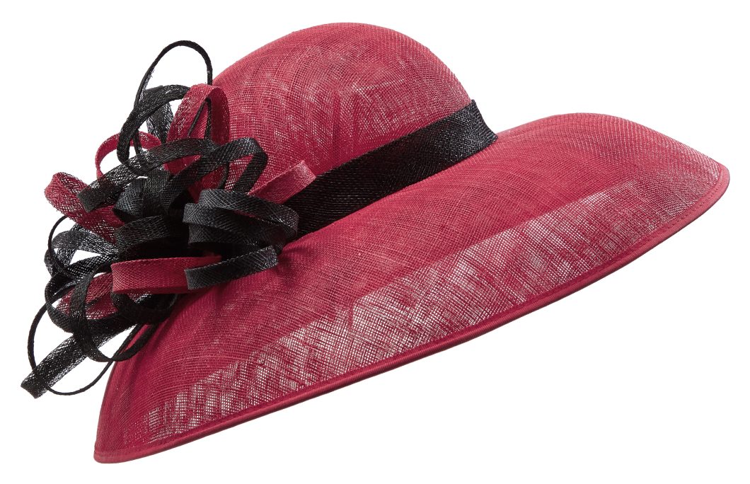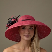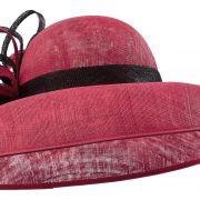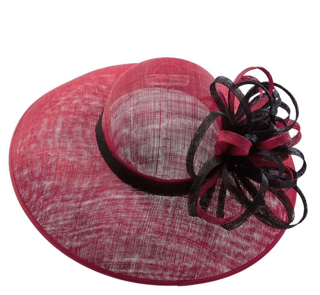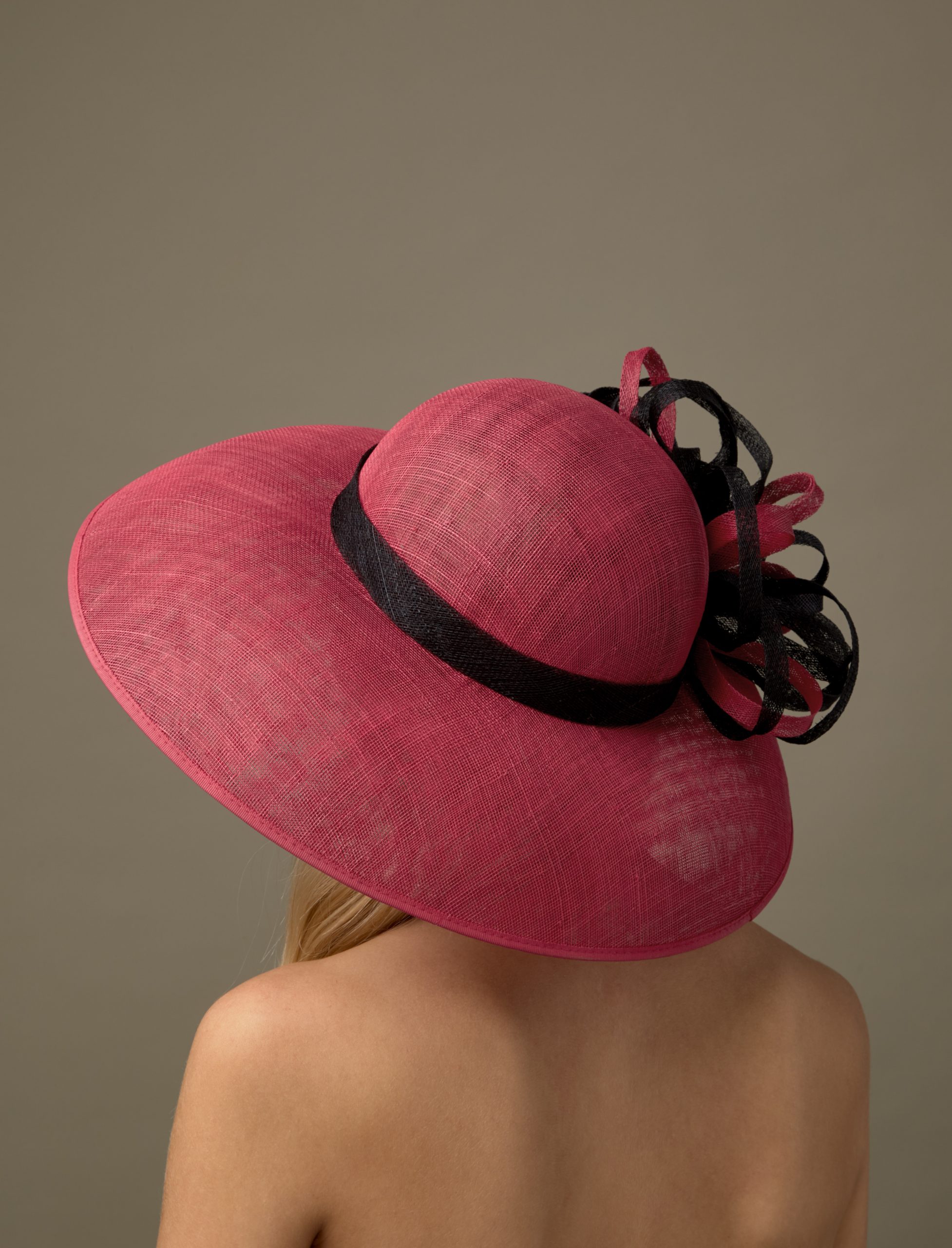 The Brandy hat is a really fun take on a classic hat. It comprises a drop-edged sinamay hat base with a coloured band and trimmed with loops of sinamay, in up to 3 colours, to one side.