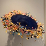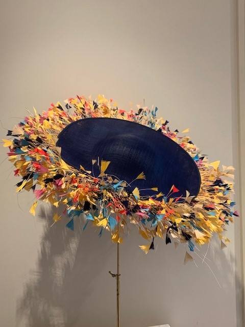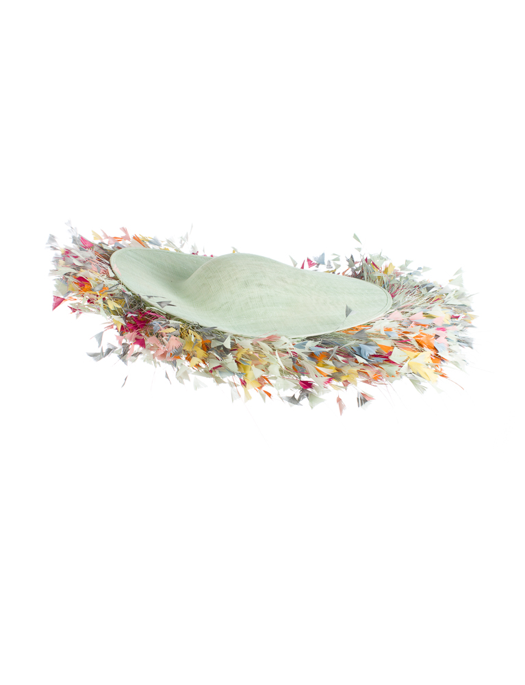 The Buckingham comprises a large double layered sinamay base with shallow crown adorned with a beautiful array of cut coque feathers between the two layers.