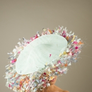 This dish hat is a stunning hat and is perfect for any summer race meeting, especially Royal Ascot as well as a great Mother of the Bride hat. This is such a versatile hat for colour matching to your outfit. The hat comes on a head band which we will cover to match your hair colour providing a seamless finish.