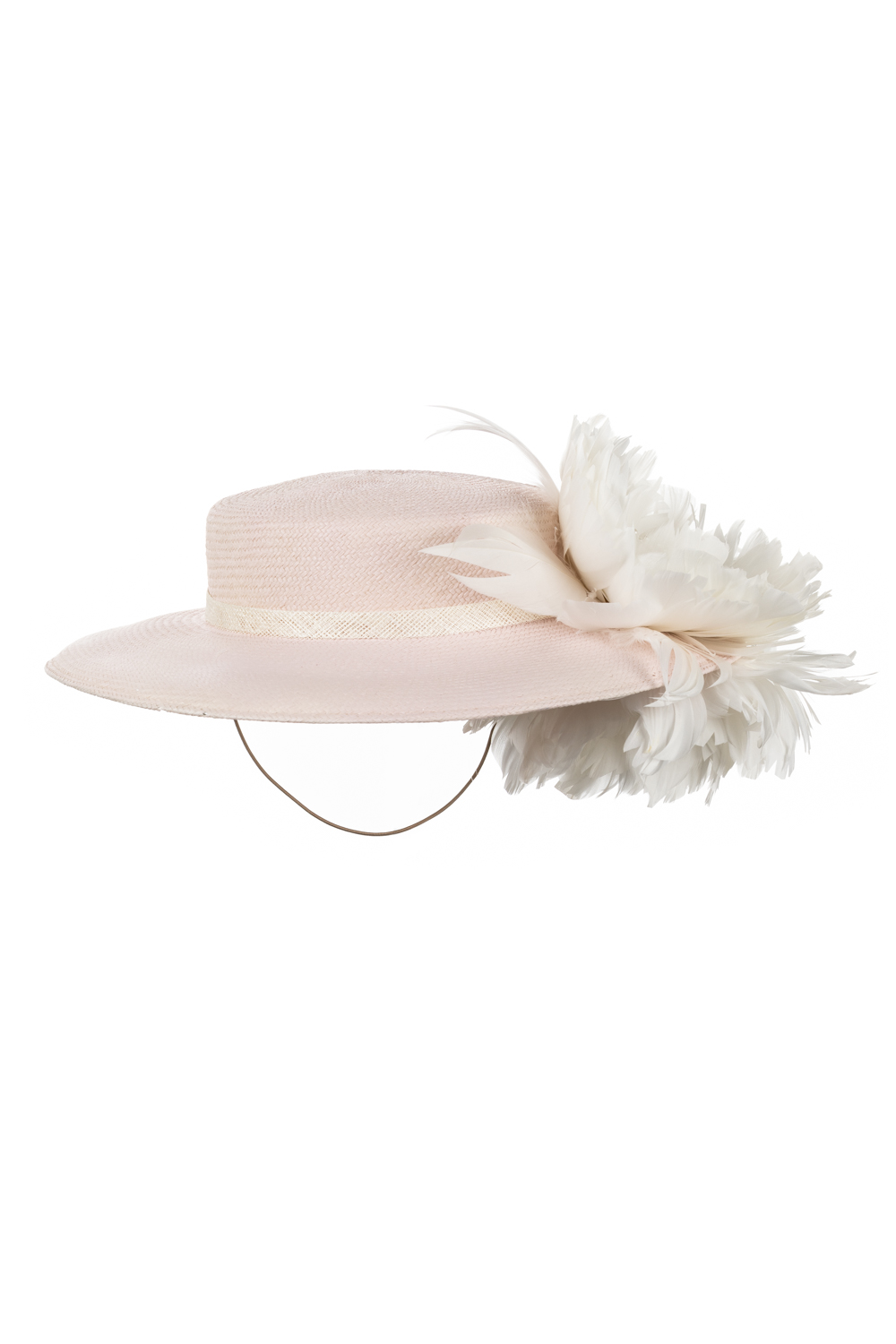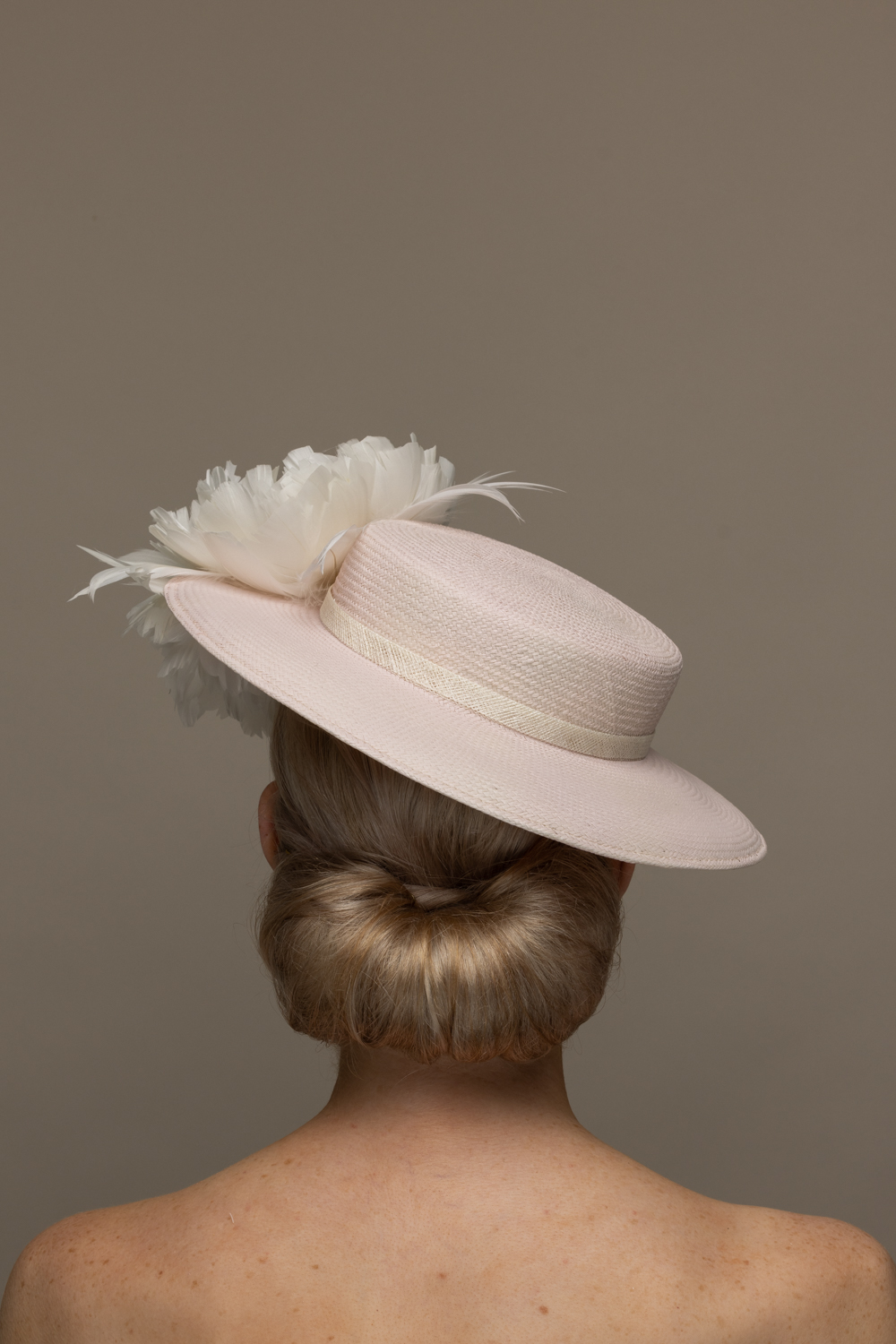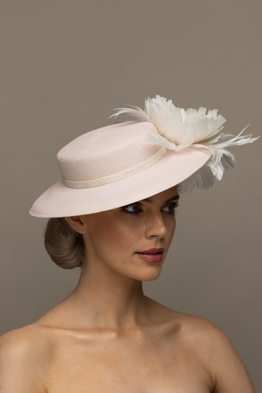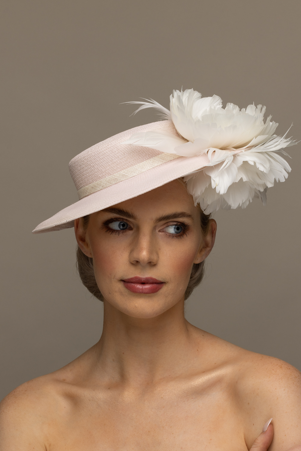 The Burmese hat comprises an on-trend boater-style base trimmed with a thin sinamay hat band and two beautiful feather flowers, one to the underside and one to the top side of the brim.