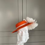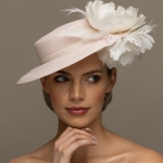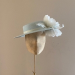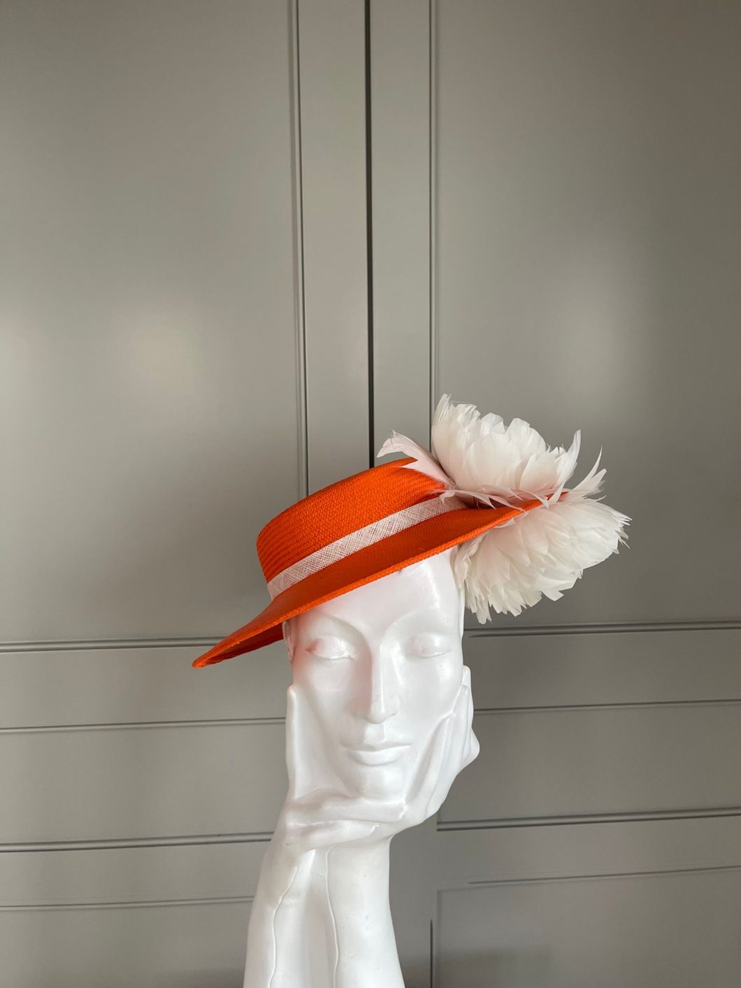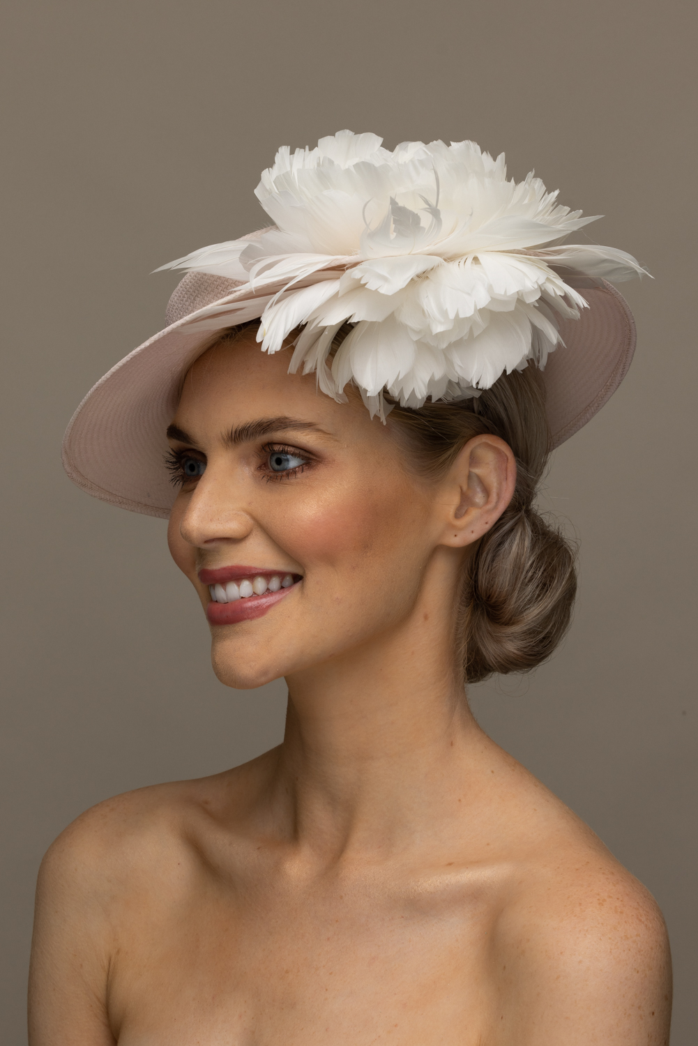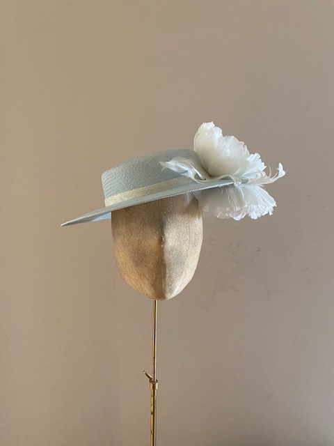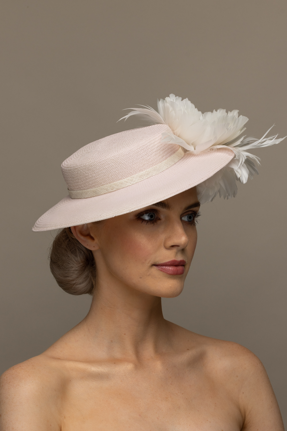 The Burmese hat comprises an on-trend boater-style base trimmed with a thin sinamay hat band and two beautiful feather flowers, one to the underside and one to the top side of the brim.