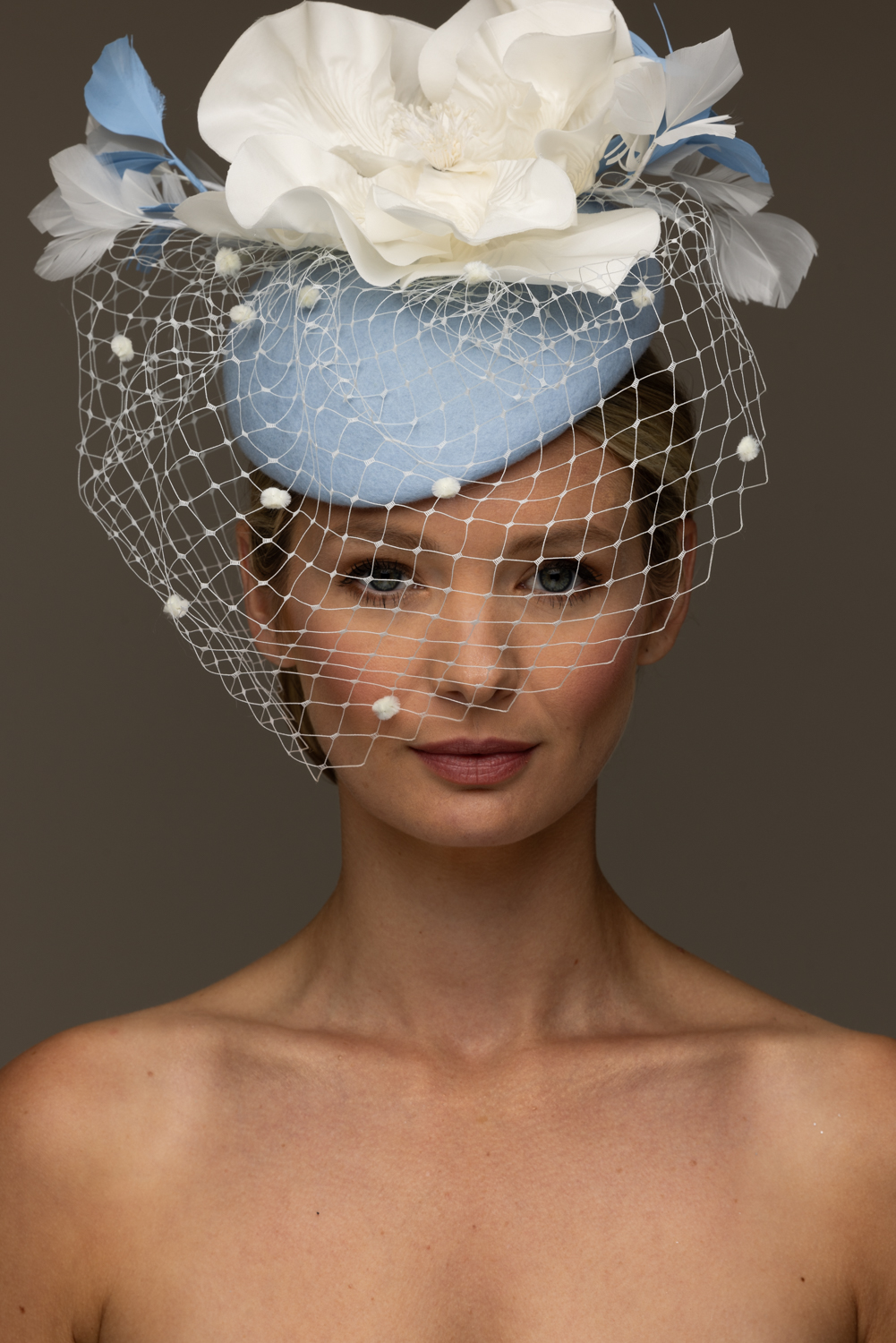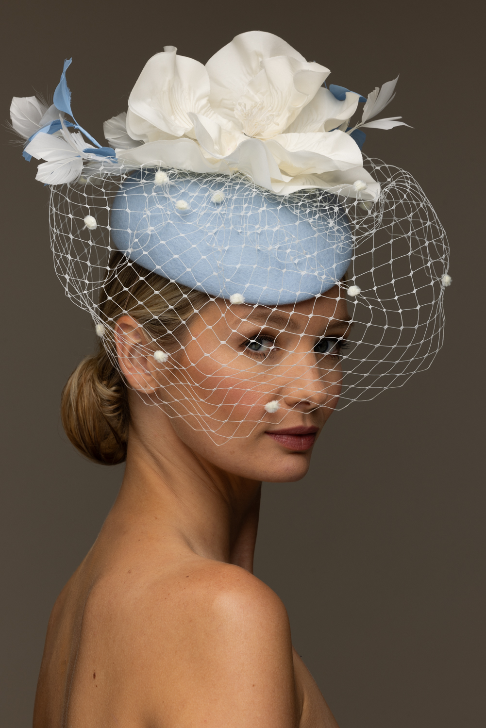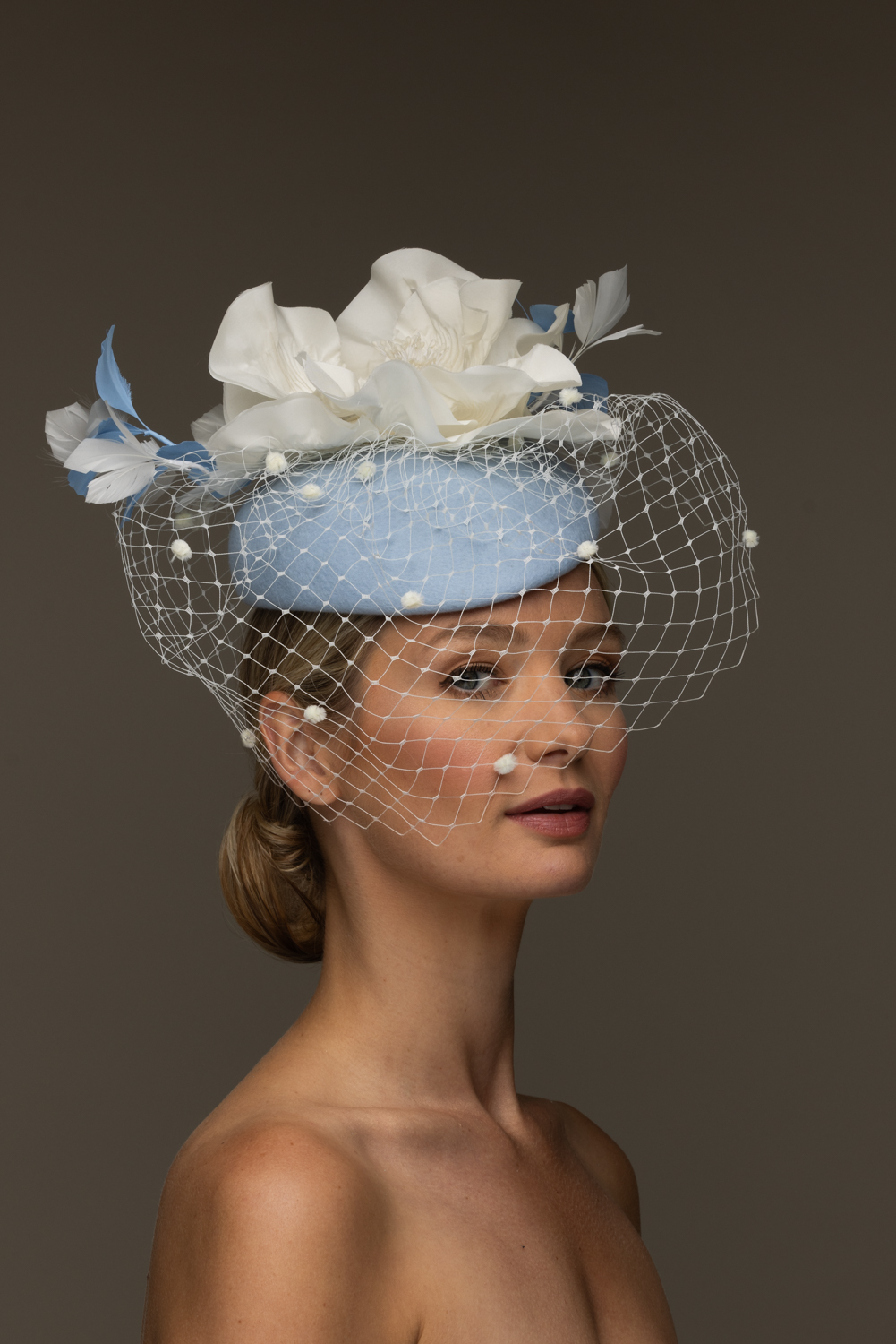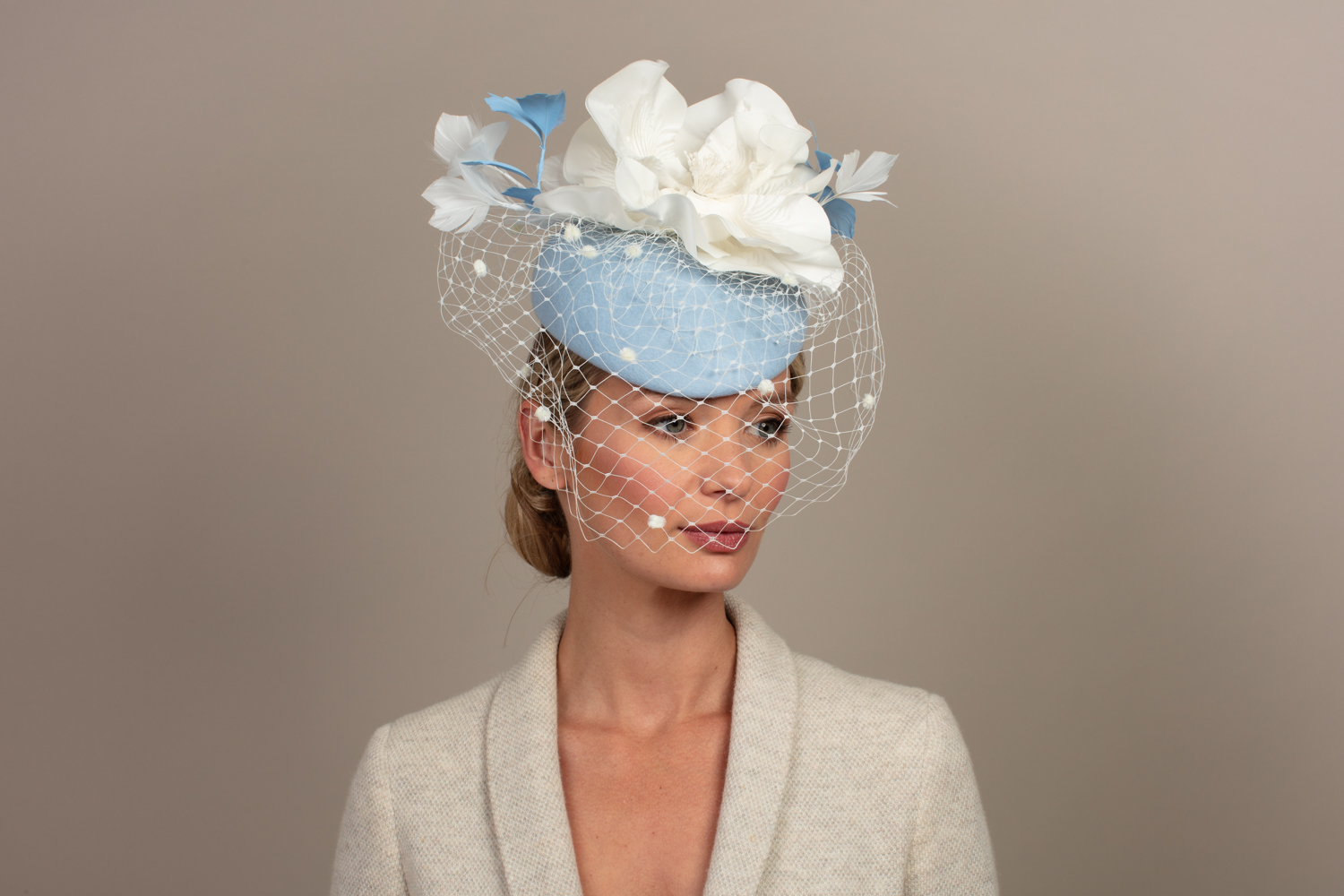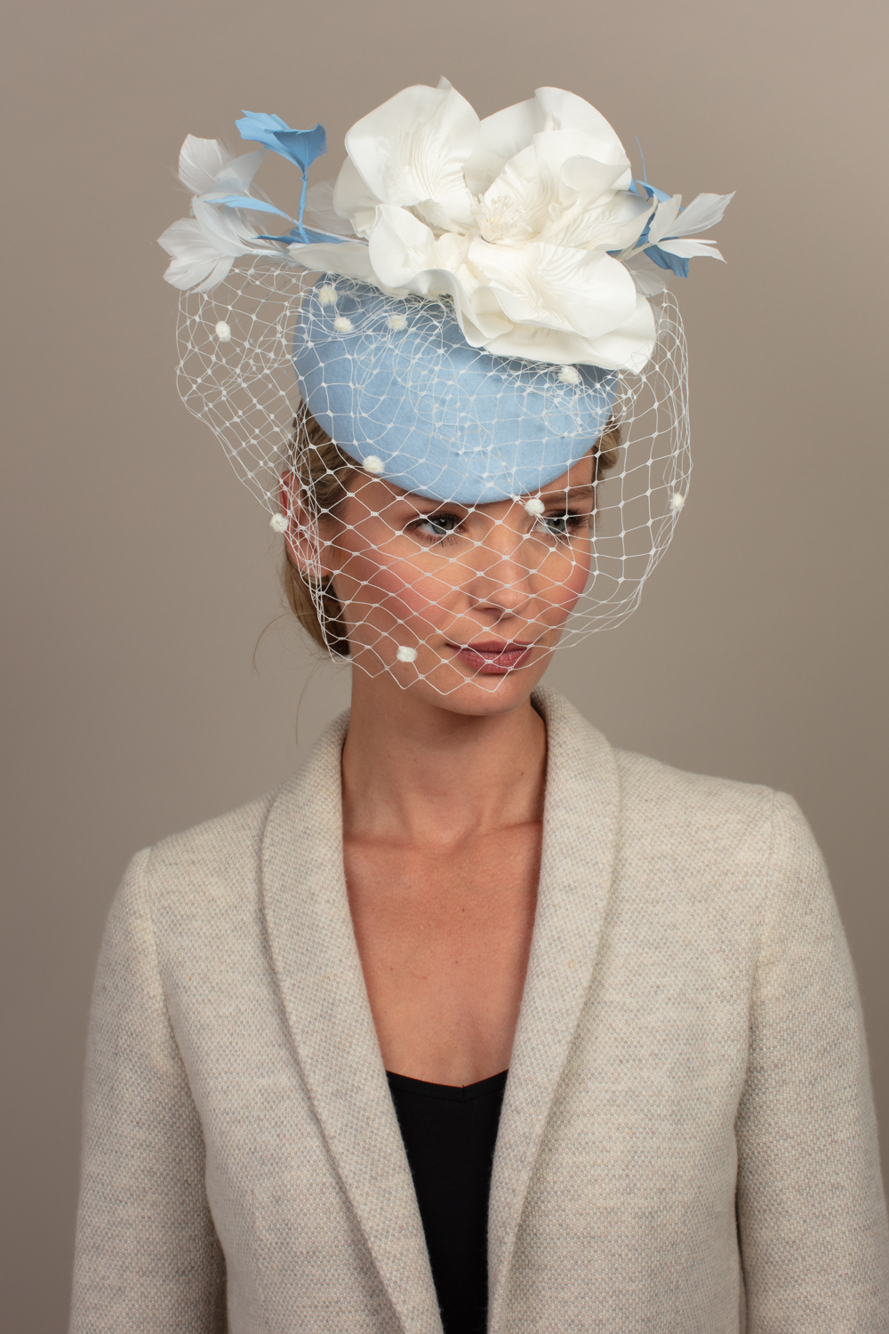 As with all of our hats, you can have your Caesar Pillbox hat base in any colour you wish.  Choose your felt base colour here and your flower and veiling colours here. The flowers are available in black, ivory and navy.We are happy to send out colour swatches so you can be sure that your chosen colours perfectly match your outfit. To order colour samples simply email info@hostiehats.co.uk.