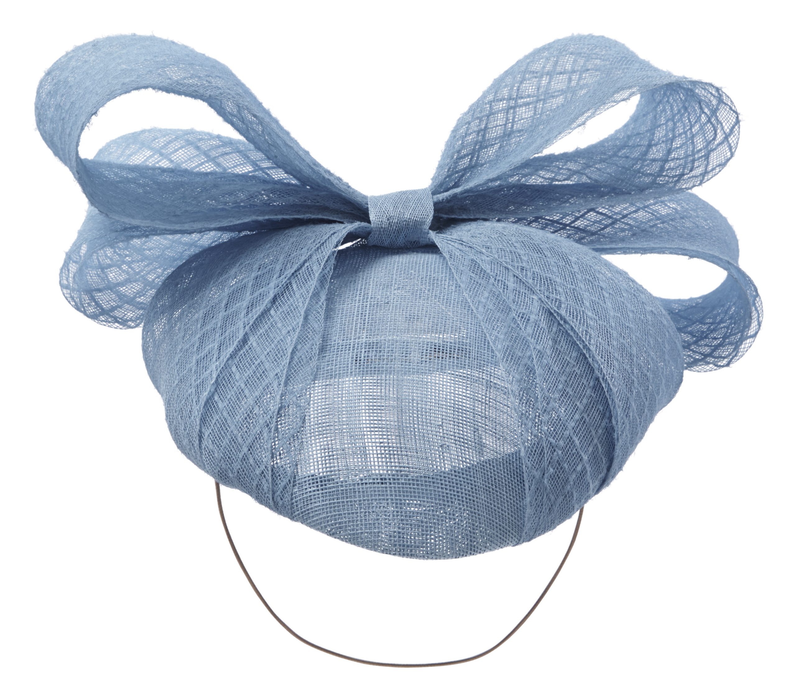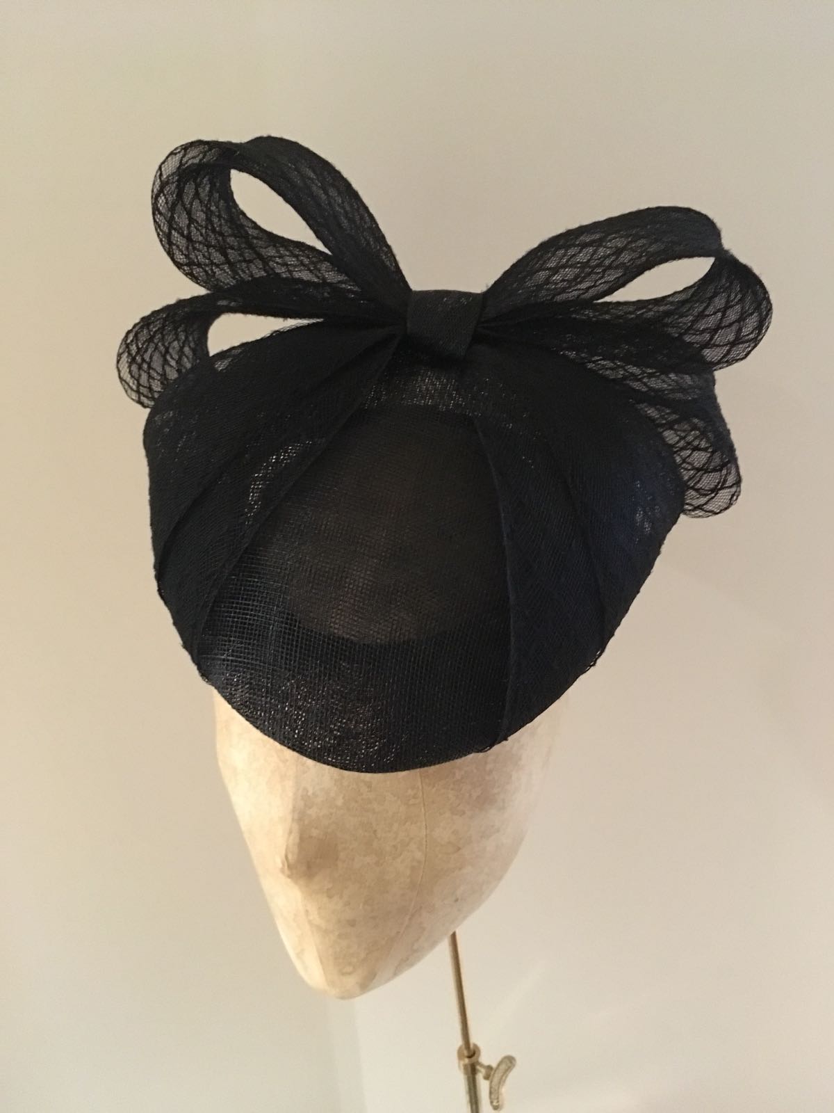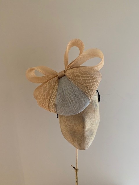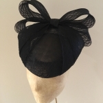 The Calypso is a gorgeous pillbox style hat. This hat comprises a sinamay pillbox base trimmed with a large double looped, diamond patterened, sinamay bow. The loose ends of the bow then wrap neatly around the edge of the hat base.