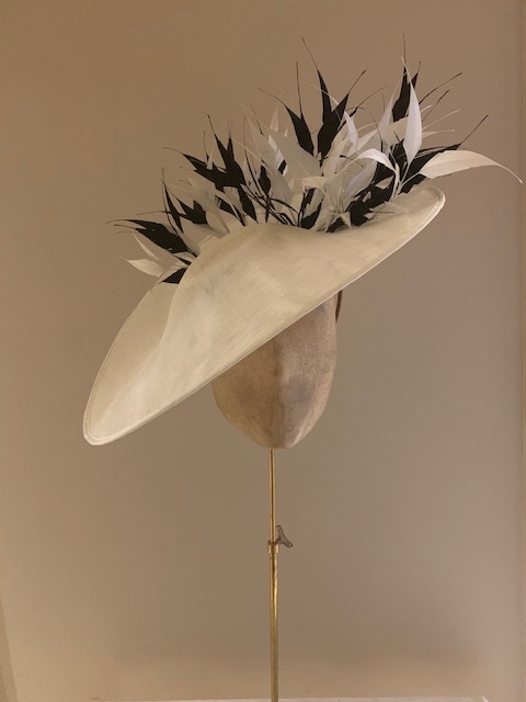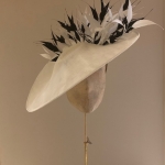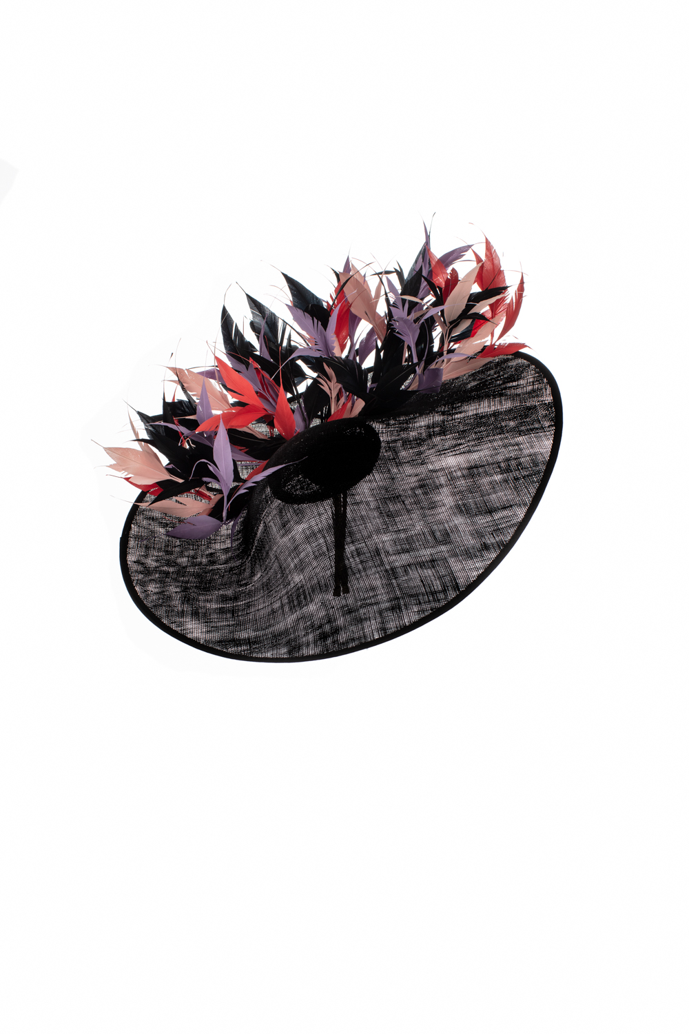 The Cannes Dish hat comprises a large dish base with slight upturn and shallow crown and is adorned with spiked feather mounts. This hat is perfect for a summer wedding or day at the races.