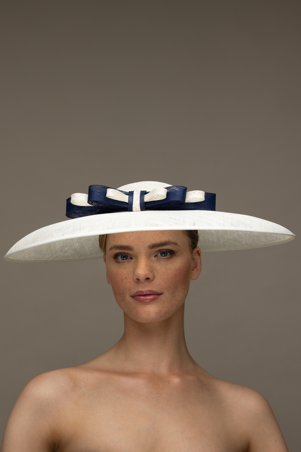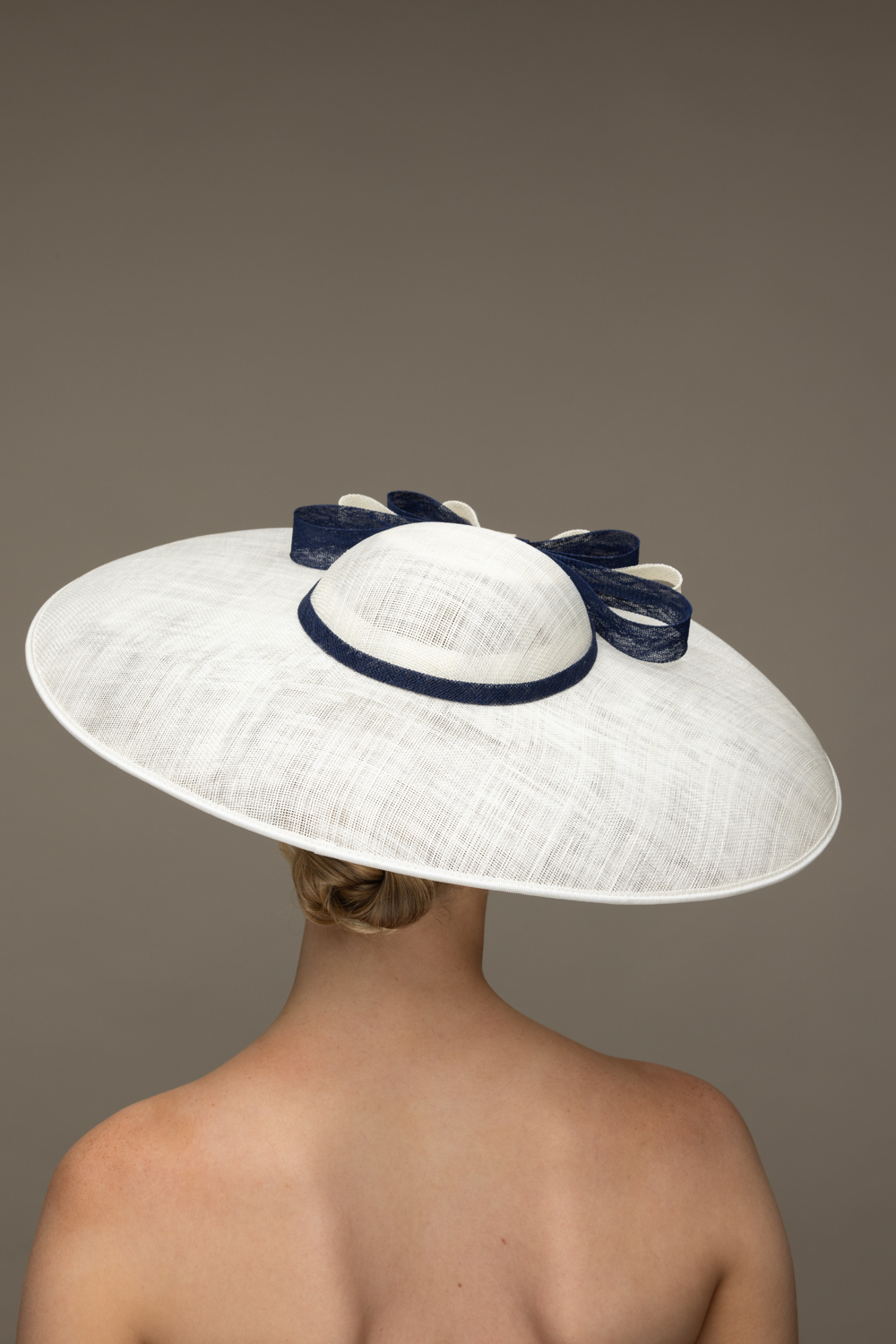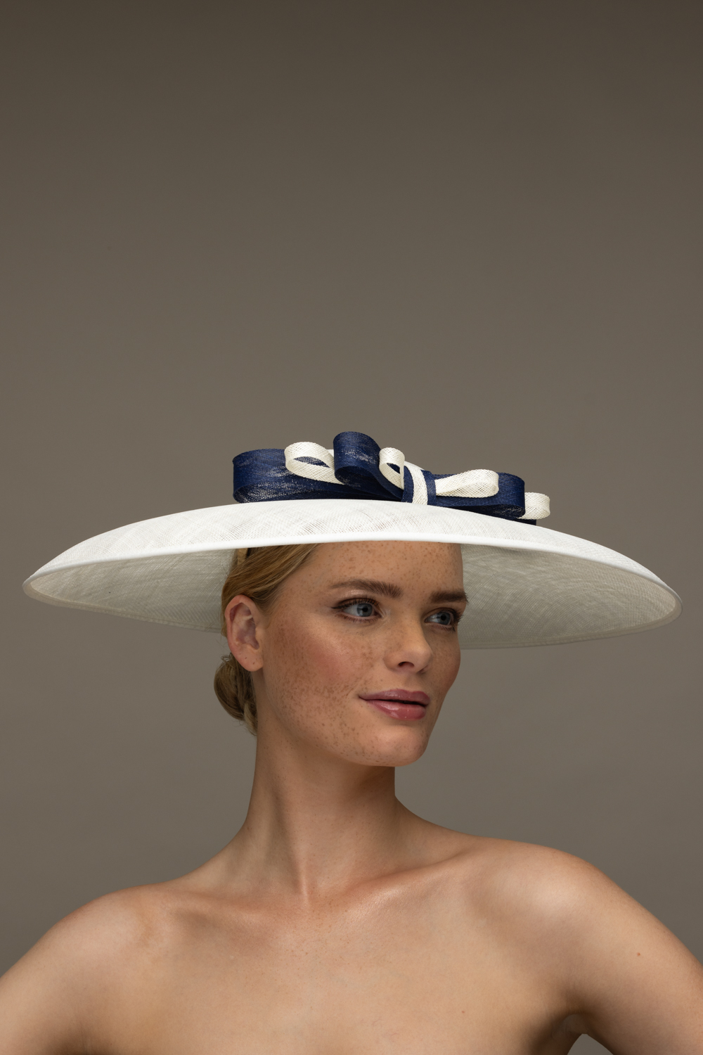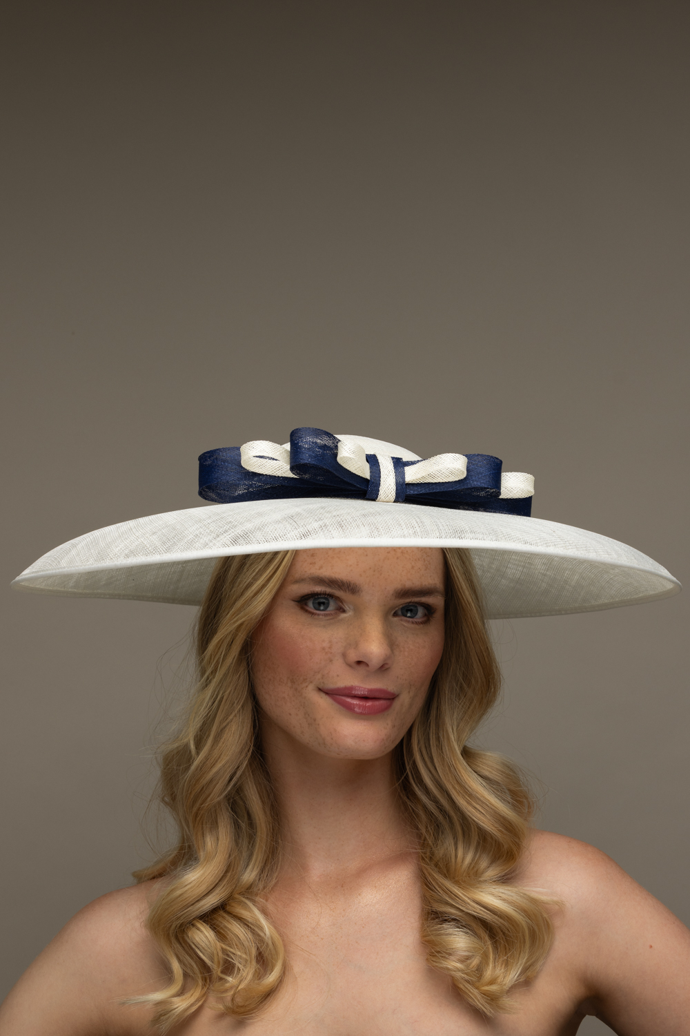 The Celestite hat is so sophisticated. The hat comprises a large sinamay base with shallow crown, trimmed with a thin sinamay band and stiff multi-looped bow to the front in two colours.