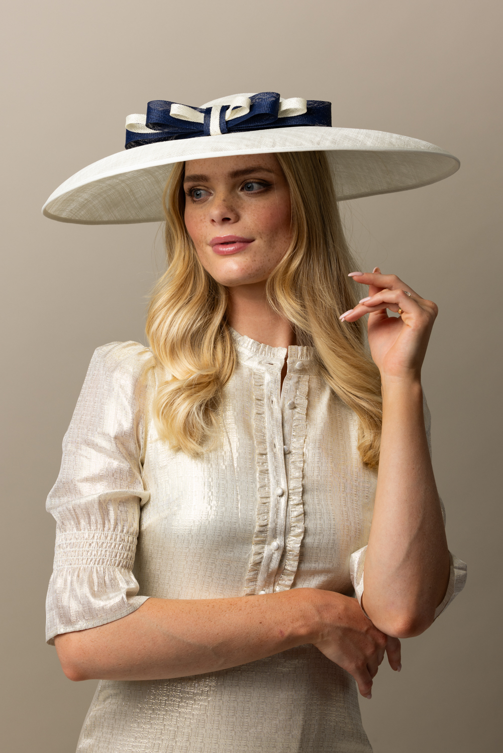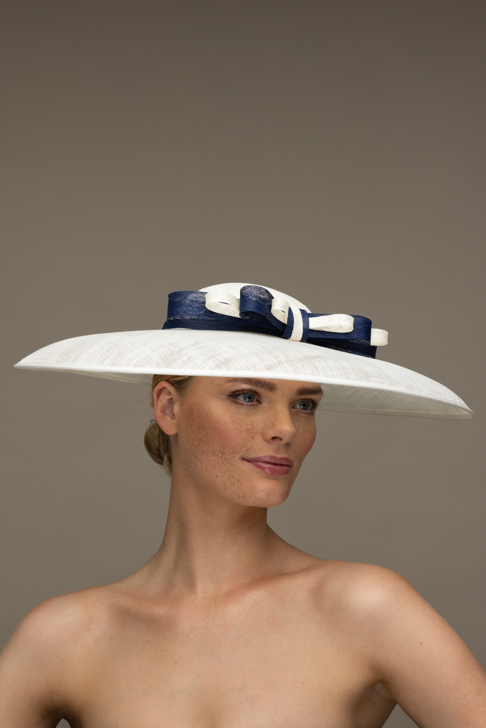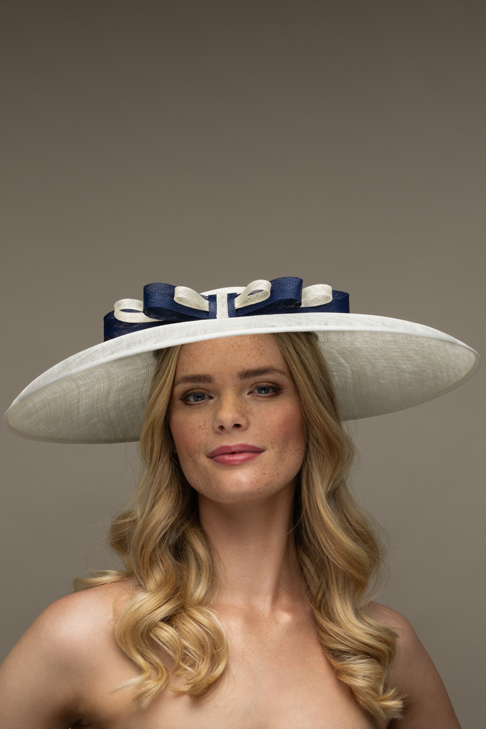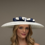 The Celestite hat is so sophisticated. The hat comprises a large sinamay base with shallow crown, trimmed with a thin sinamay band and stiff multi-looped bow to the front in two colours.