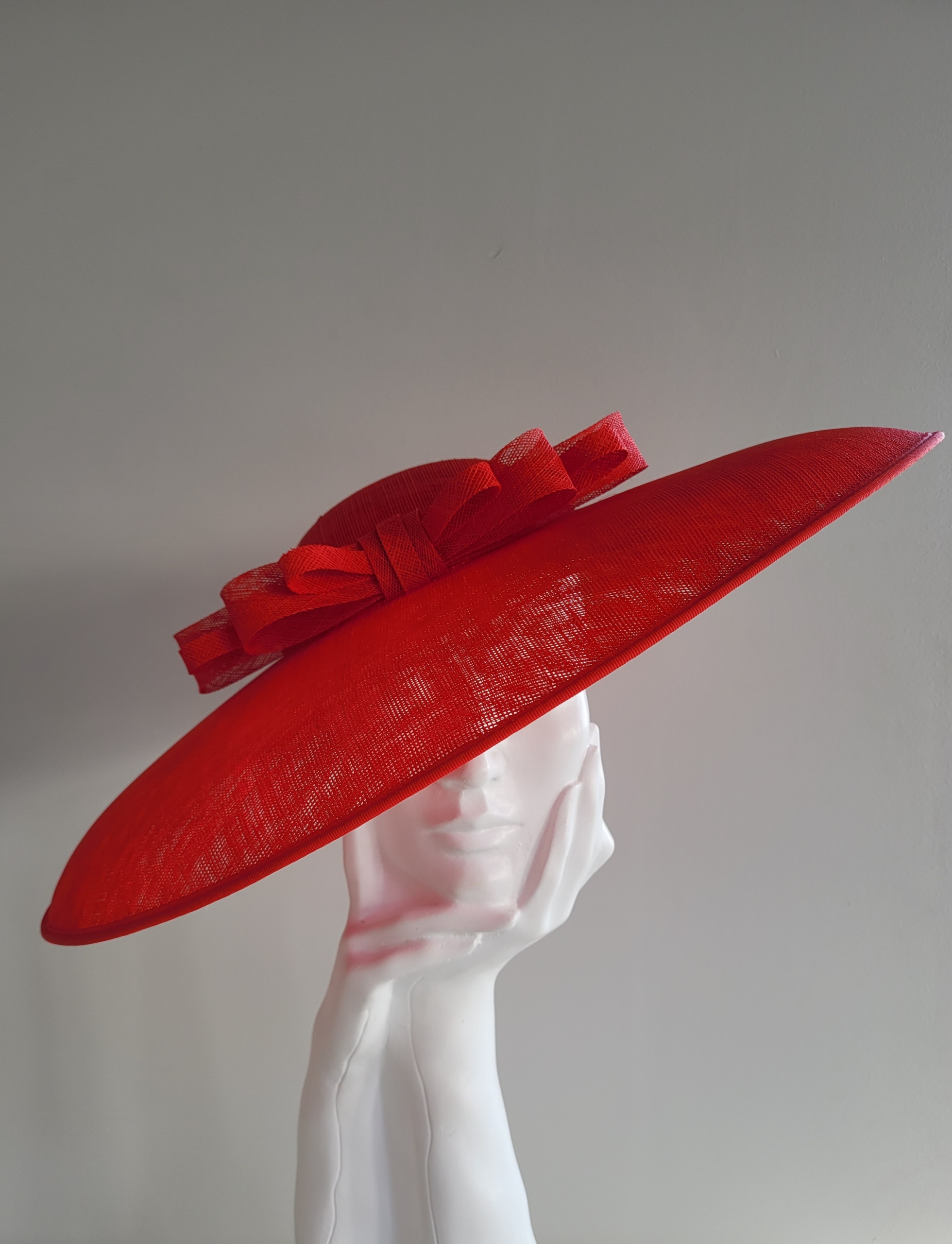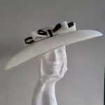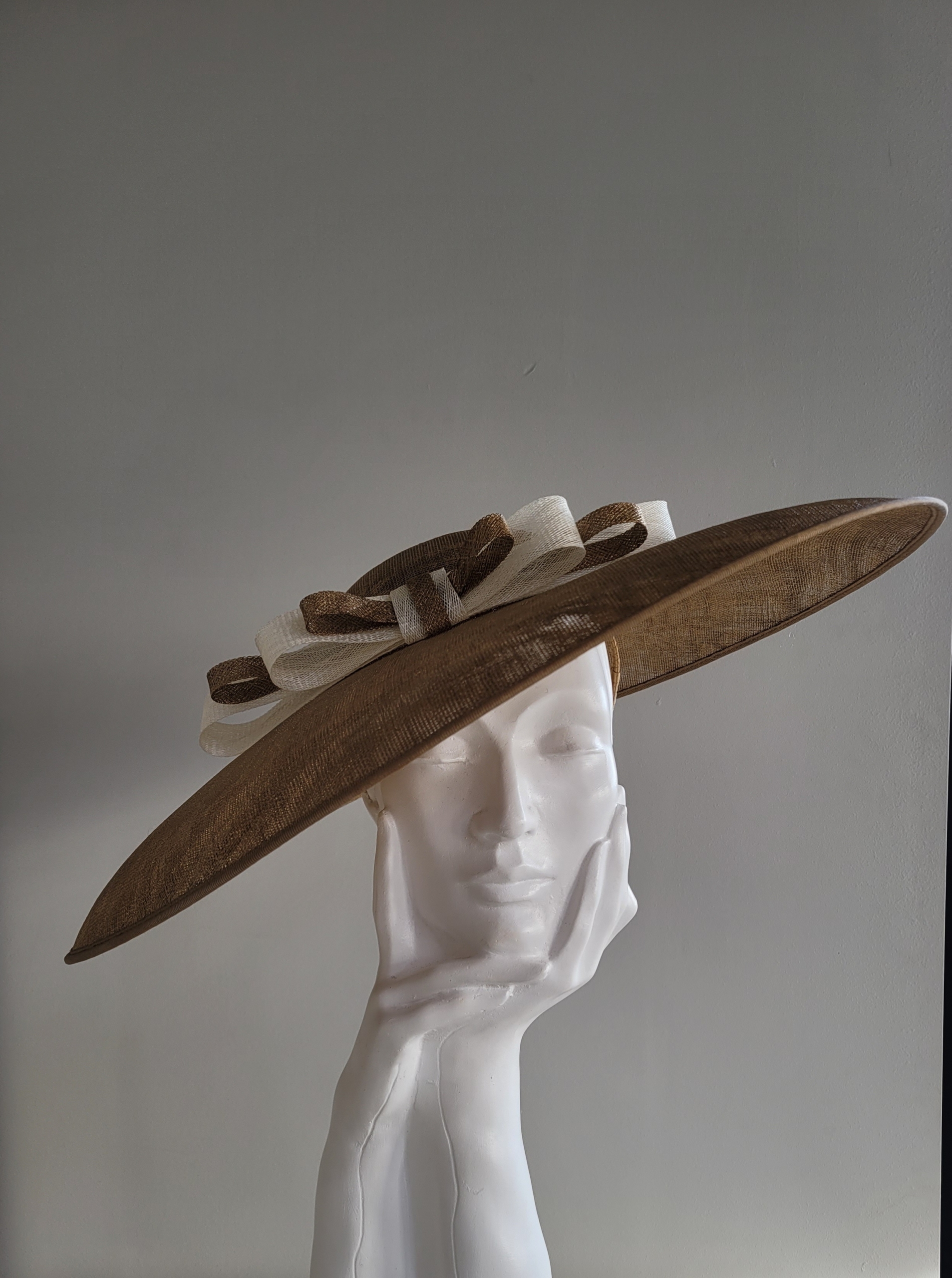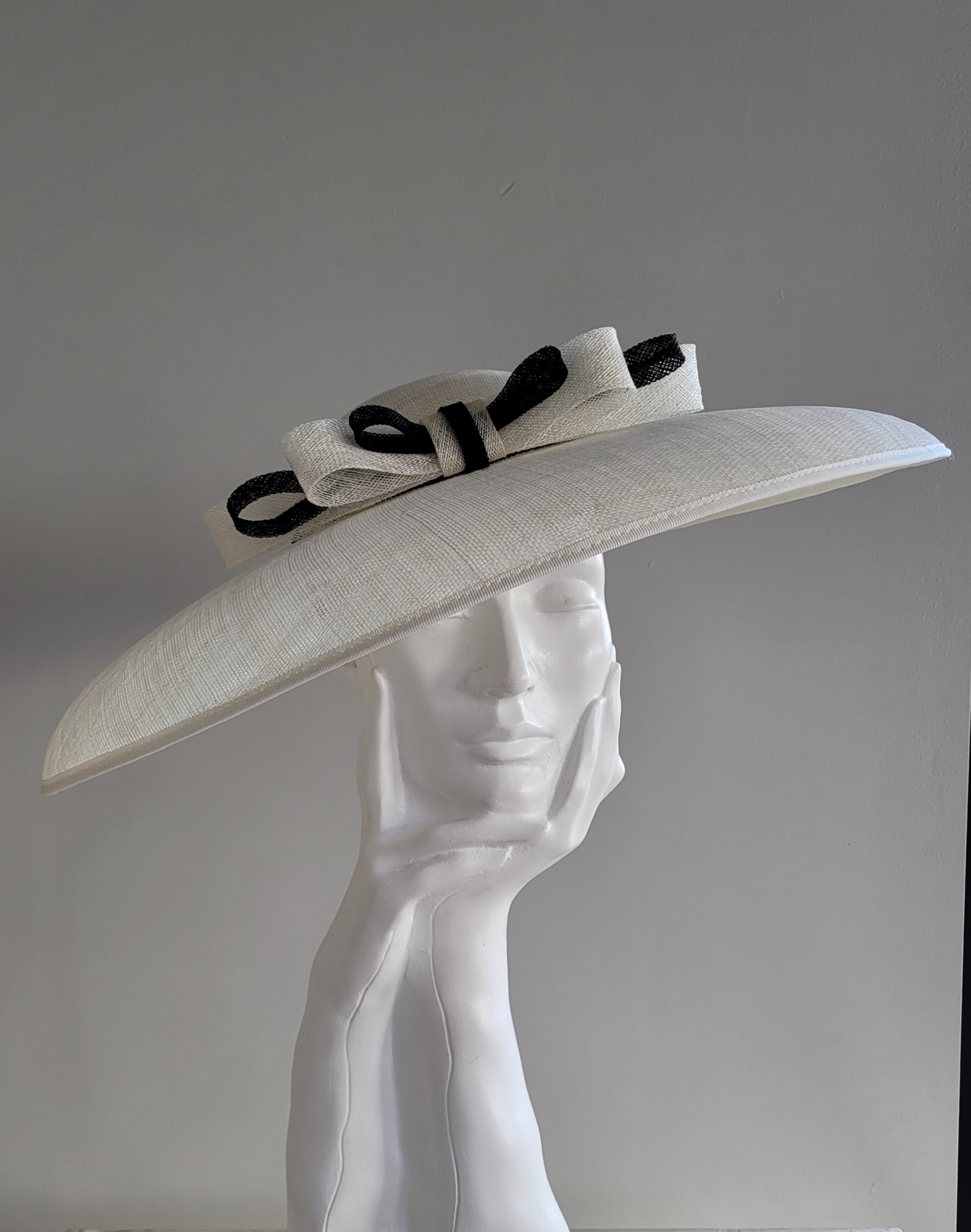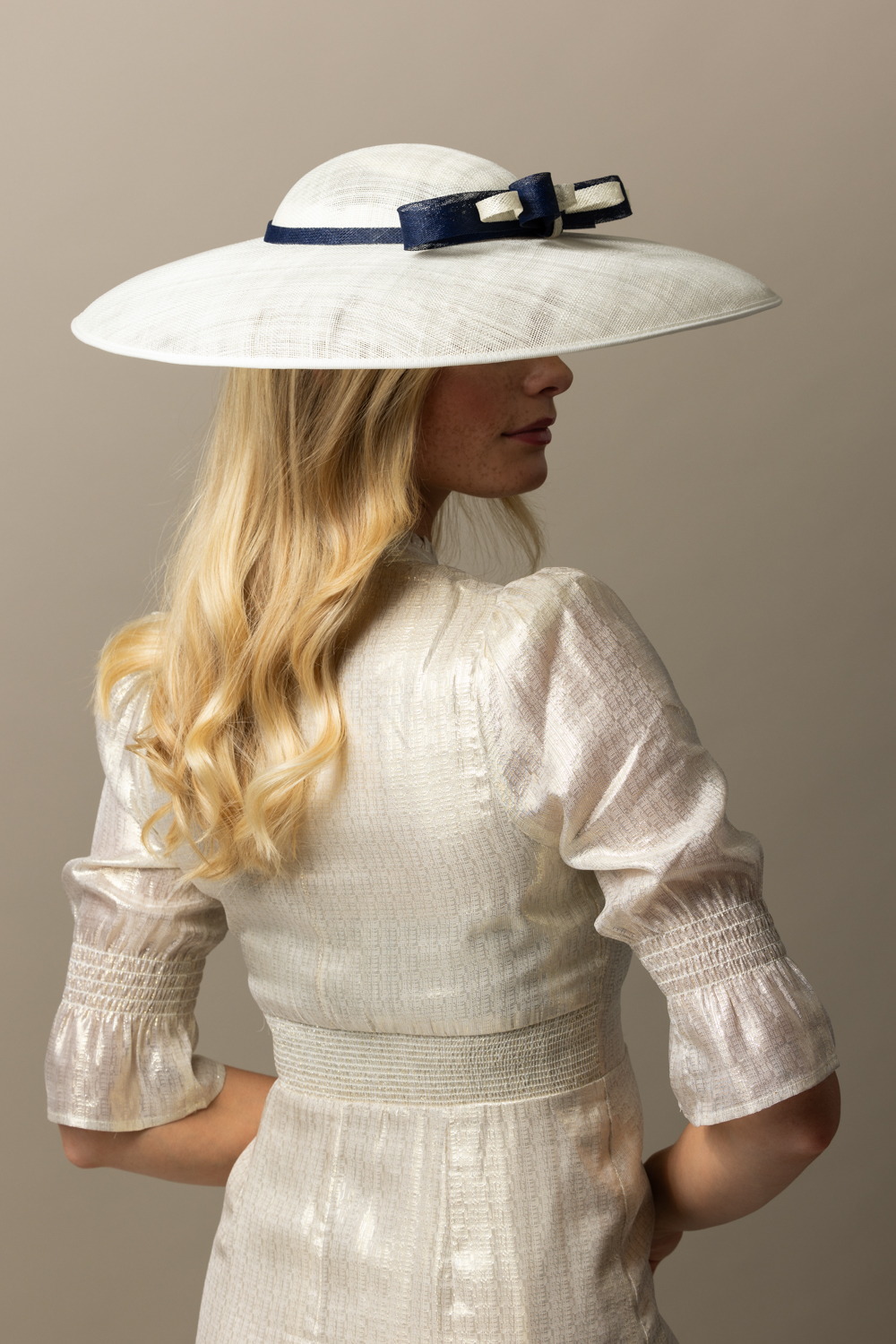 The Celestite hat is so sophisticated. The hat comprises a large sinamay base with shallow crown, trimmed with a thin sinamay band and stiff multi-looped bow to the front in two colours.