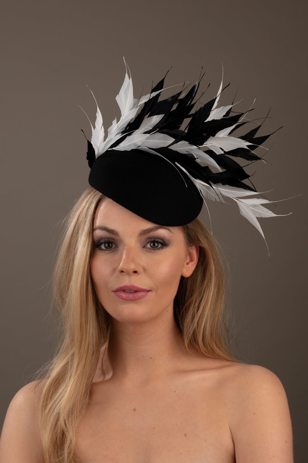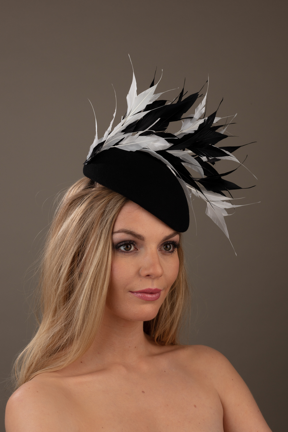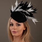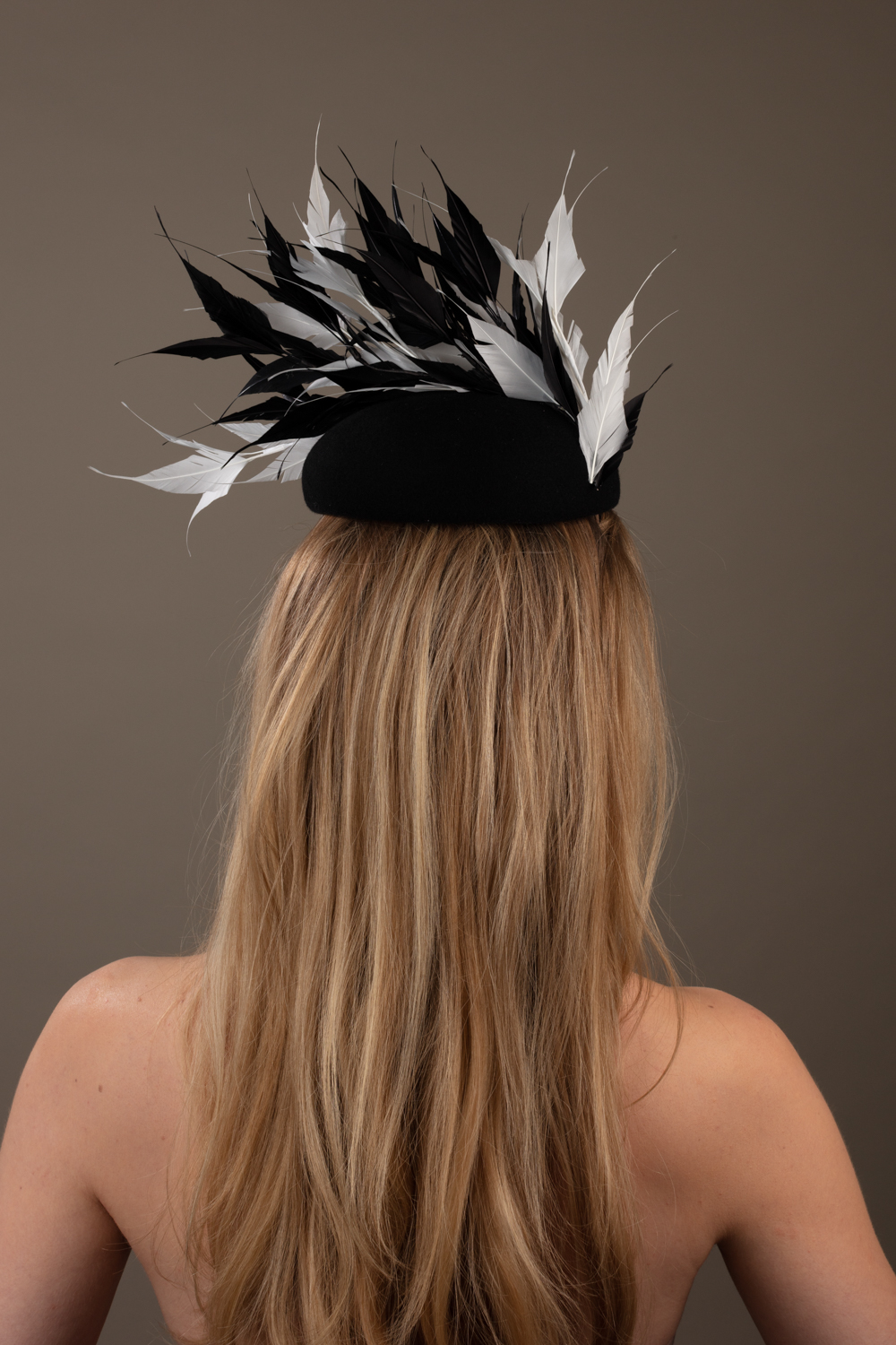 The Chablis Pillbox Hat comprises a felt base adorned to the back with a fan of spiked feathers in up to 3 different colours.