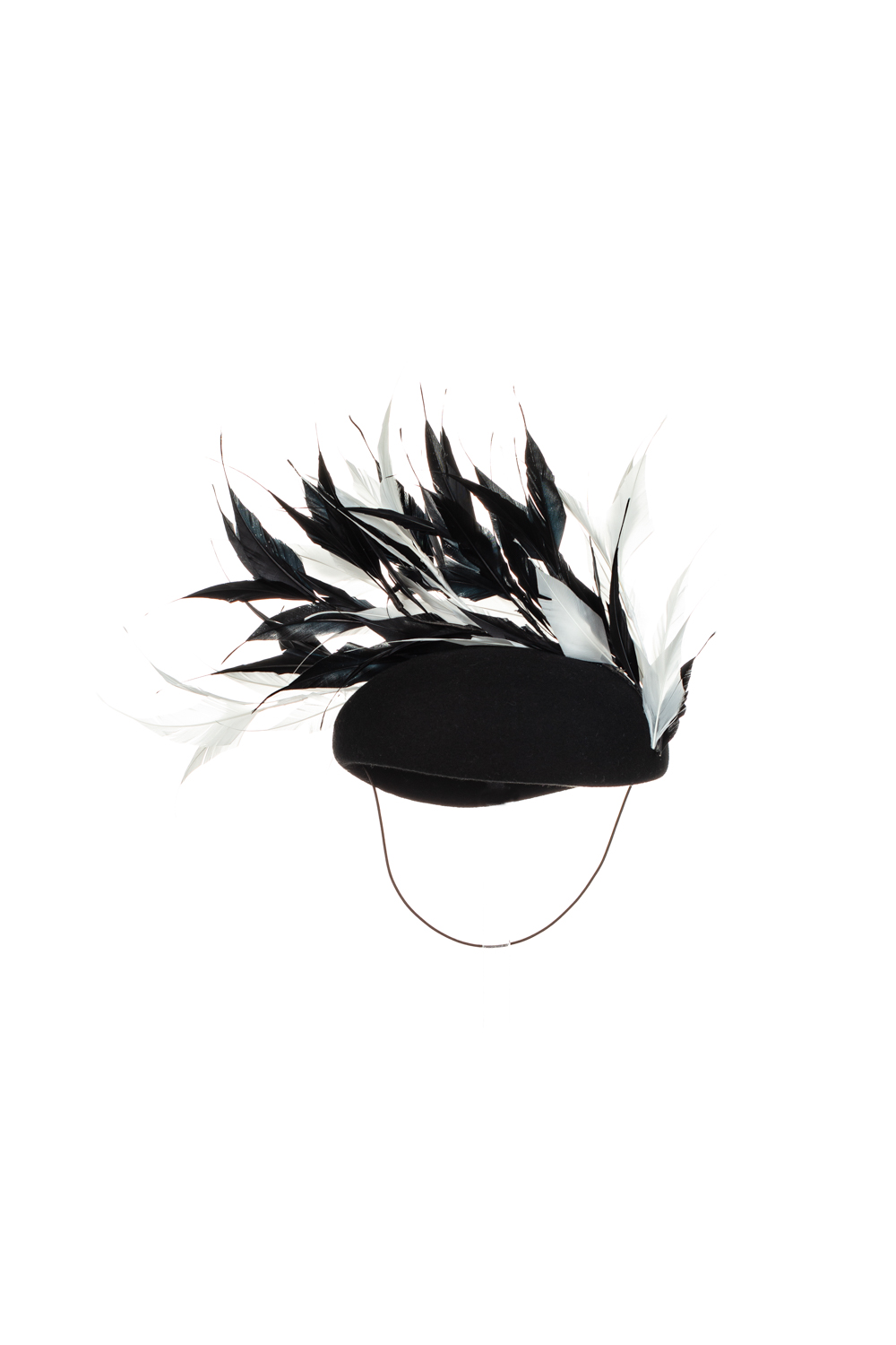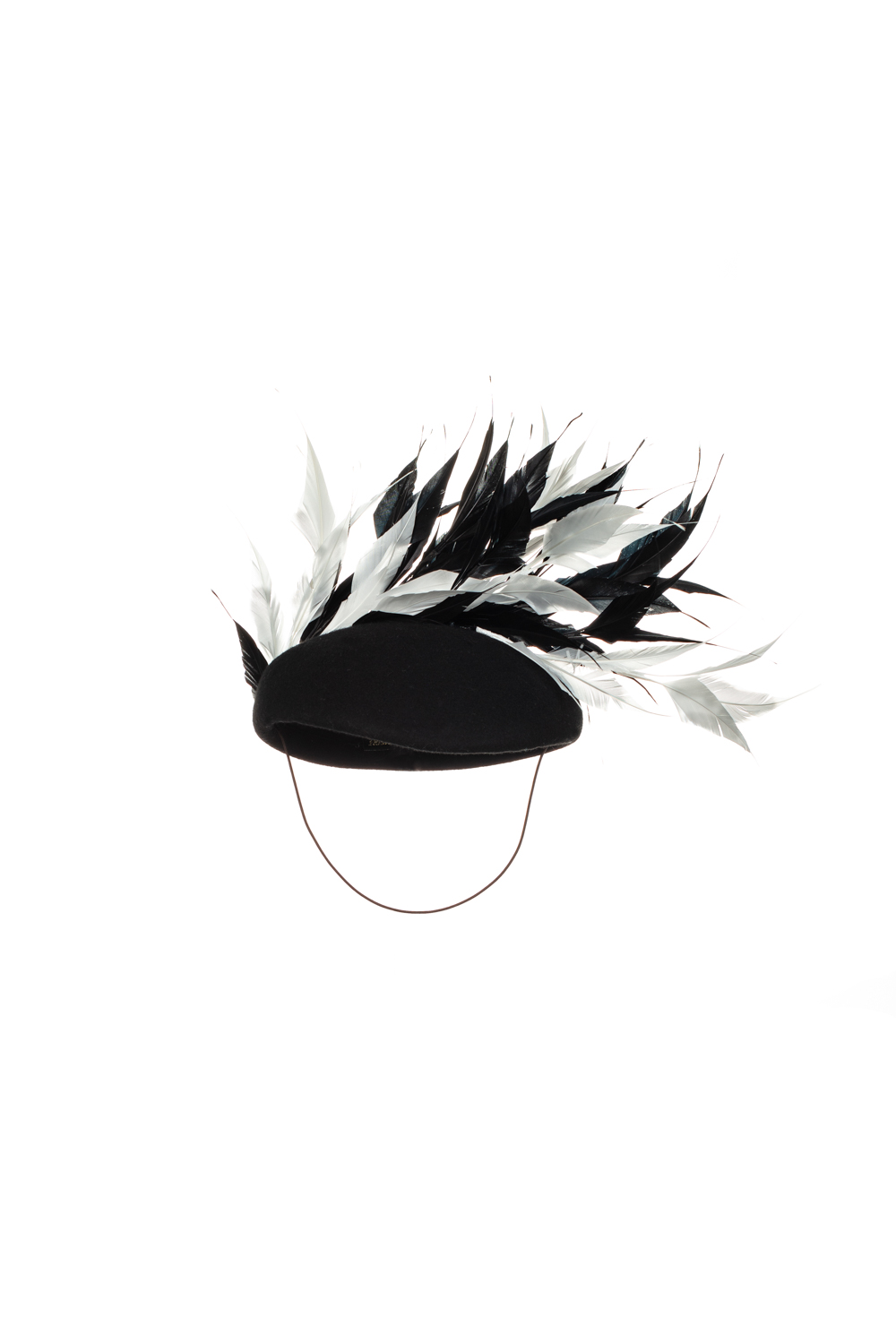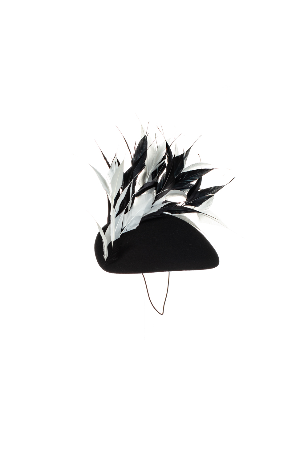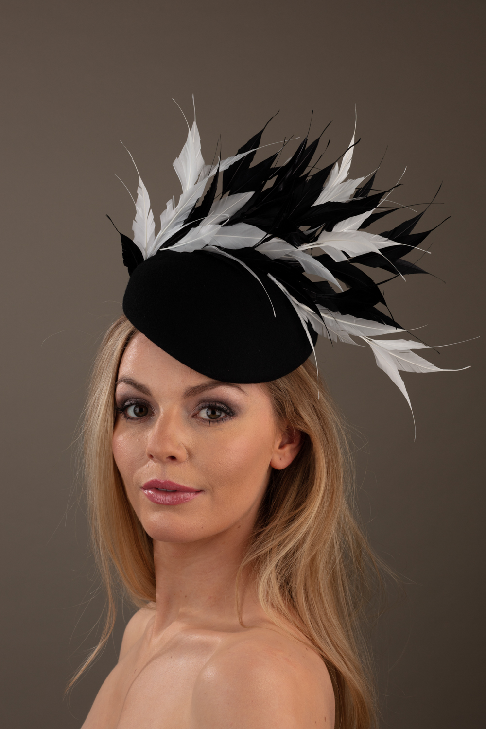 The Chablis Pillbox Hat comprises a felt base adorned to the back with a fan of spiked feathers in up to 3 different colours.