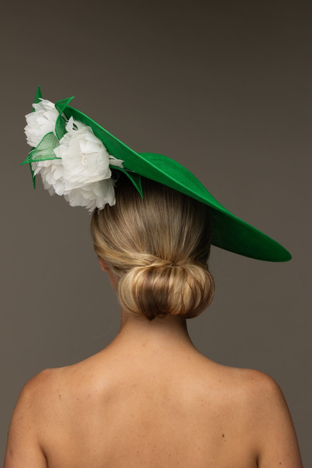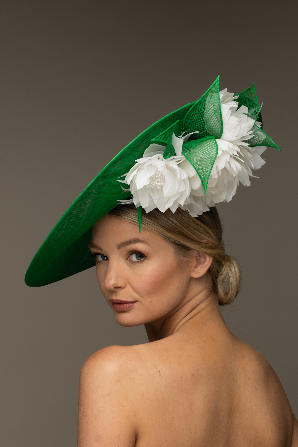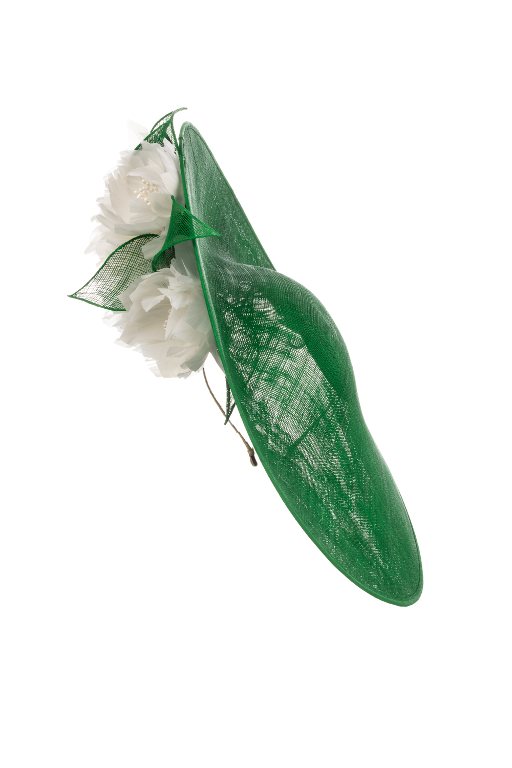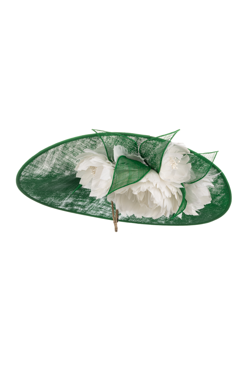The Chamberlain Dish Hat comprises an 18″ dish base set on a headband, trimmed to the underside of the brim with a beautiful bouquet of feather flowers and sinamay petals.