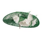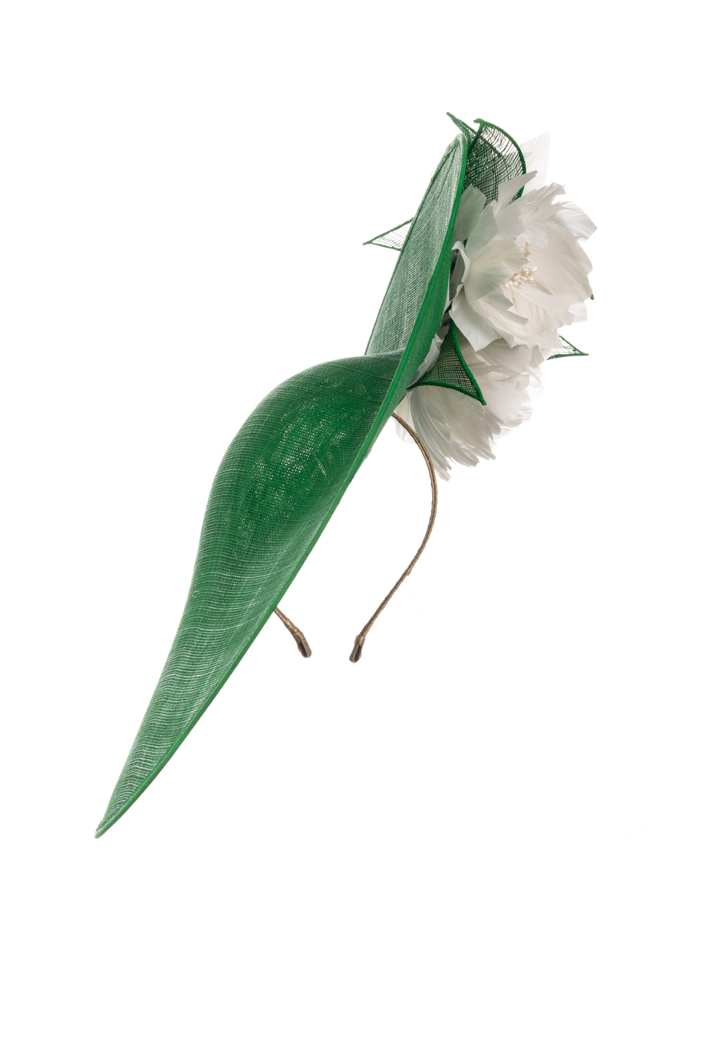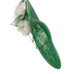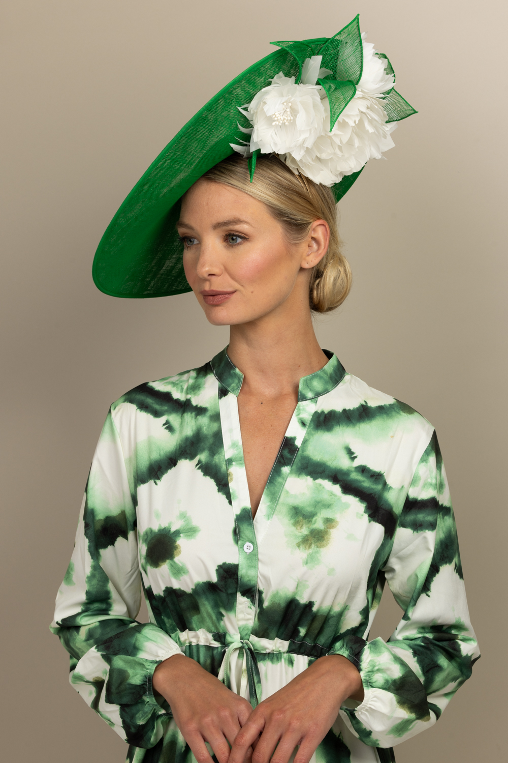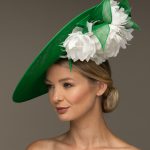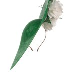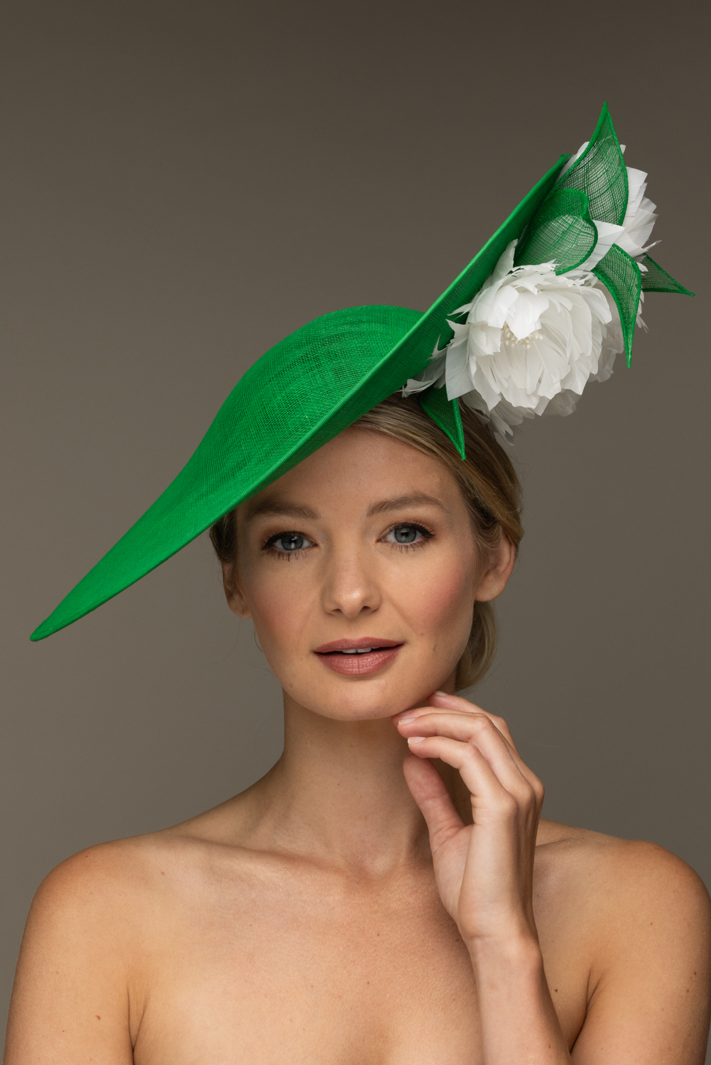 The Chamberlain Dish Hat comprises an 18″ dish base set on a headband, trimmed to the underside of the brim with a beautiful bouquet of feather flowers and sinamay petals.