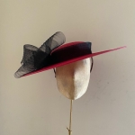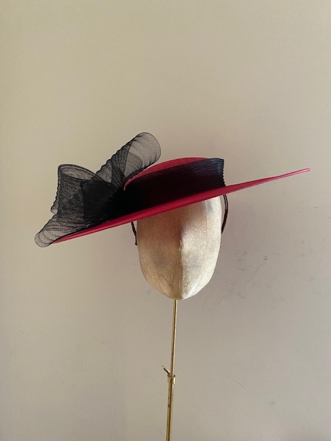 The Charisma dish hat comprises a sinamay boater-style base trimmed with a deep crinoline band a double looped bow to the side made from ribbed crinoline.