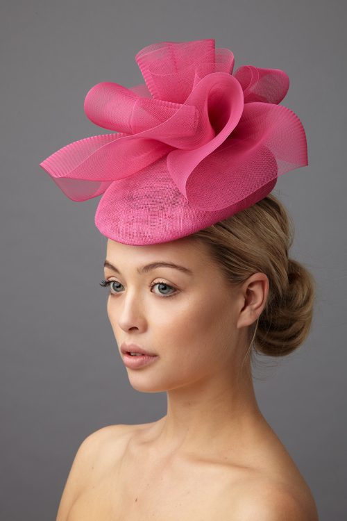 The Cleveland hat comprises a sinamay hat base with upturned front trimmed with an elegant band around the crown, a large sinamay flower, petals and loops, finished off with two quills.