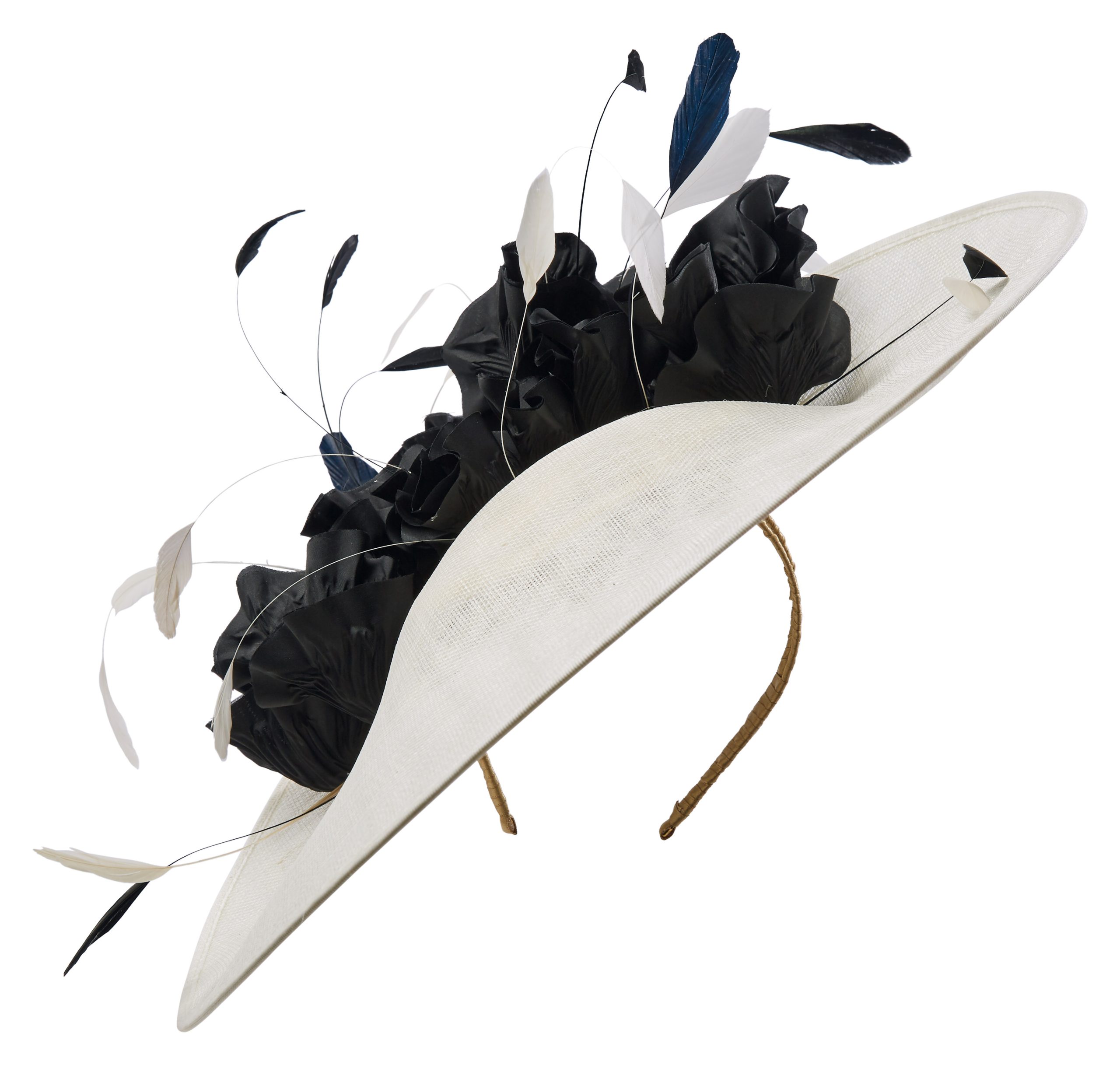 The Colada dish hat comprises a large sinamay dish base and is embellished with a row of silk flowers and finished off with some delicate coque feathers. This hat comes on a headband which will be covered to blend seamlessly with your hair colour.