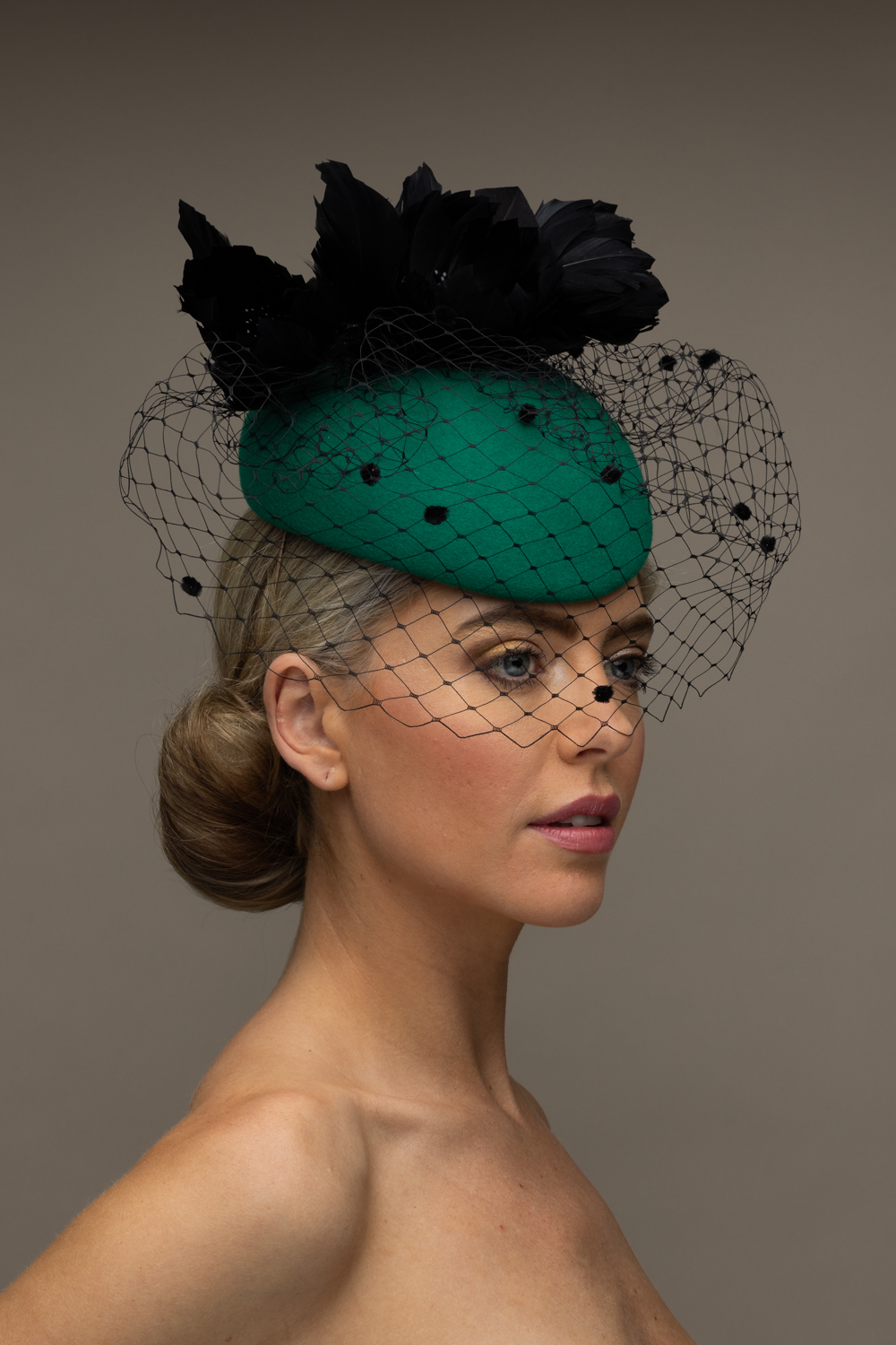 The Colorada Pillbox hat comprises a neat, felt pillbox base trimmed with dog feather flowers (available in Ivory, black & navy) and a dramatic spotted veil.