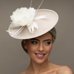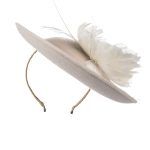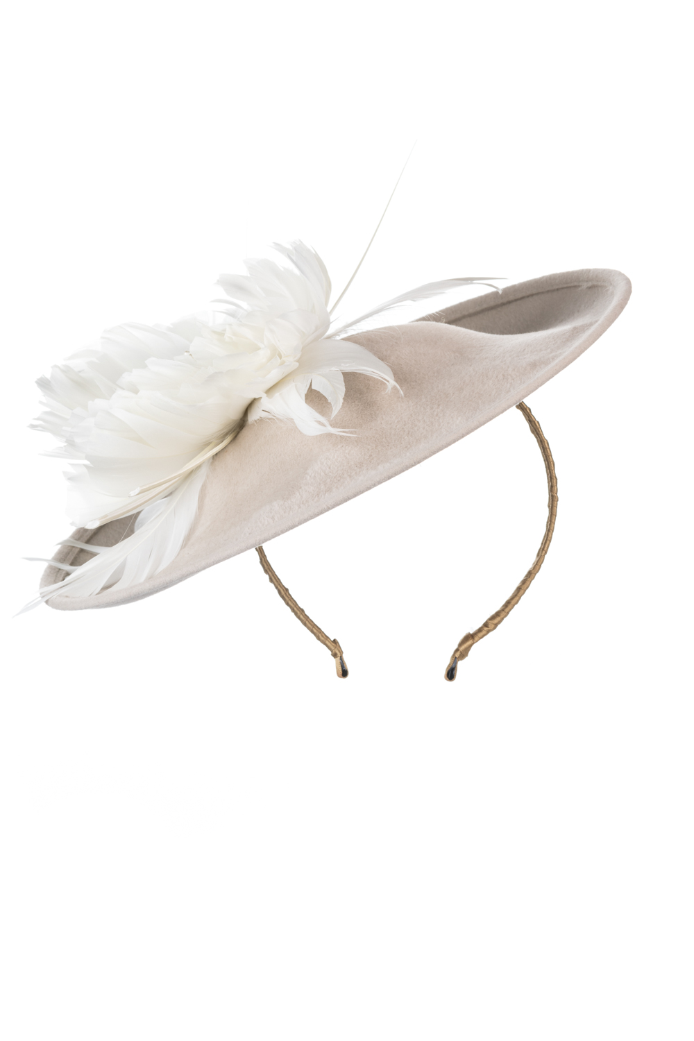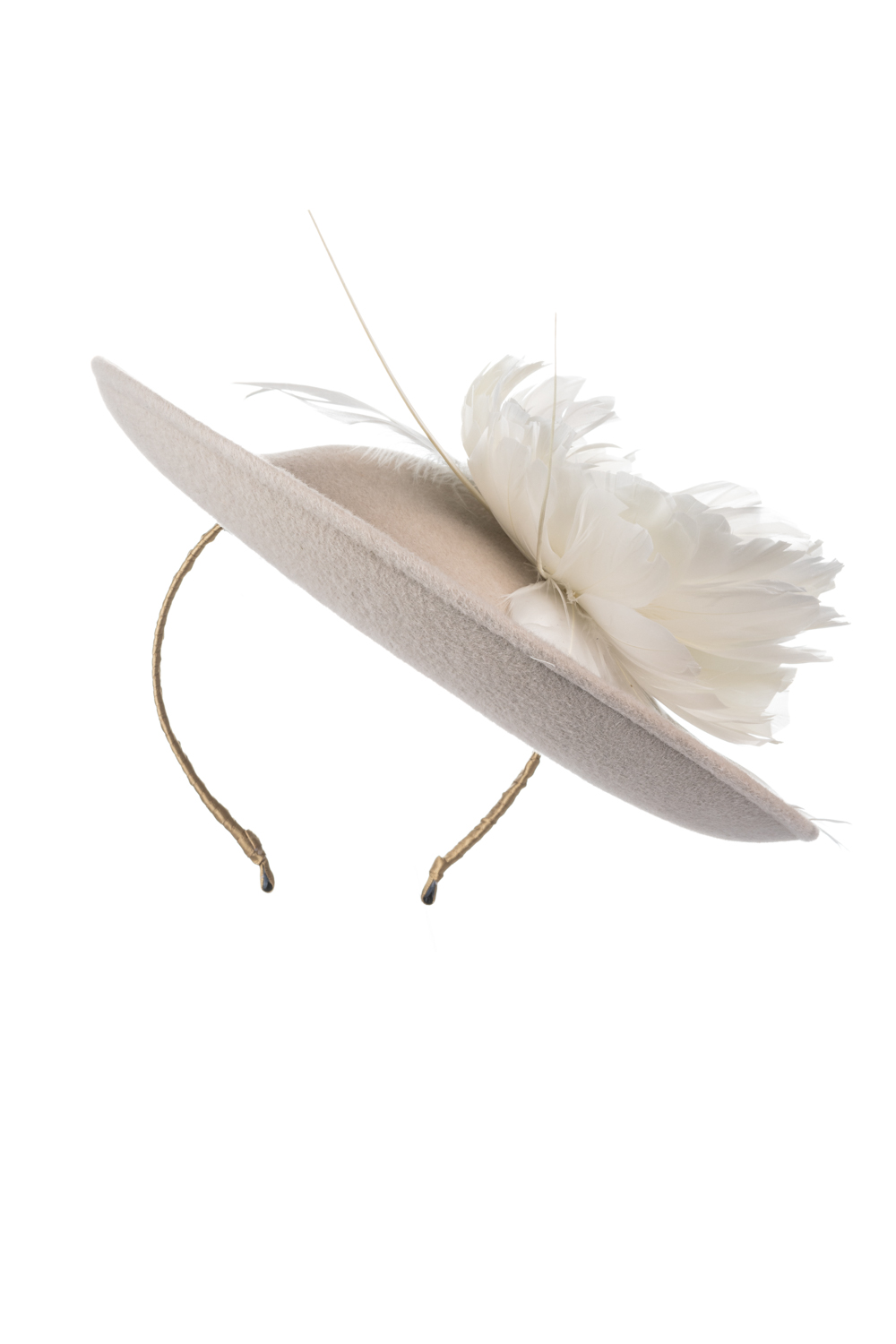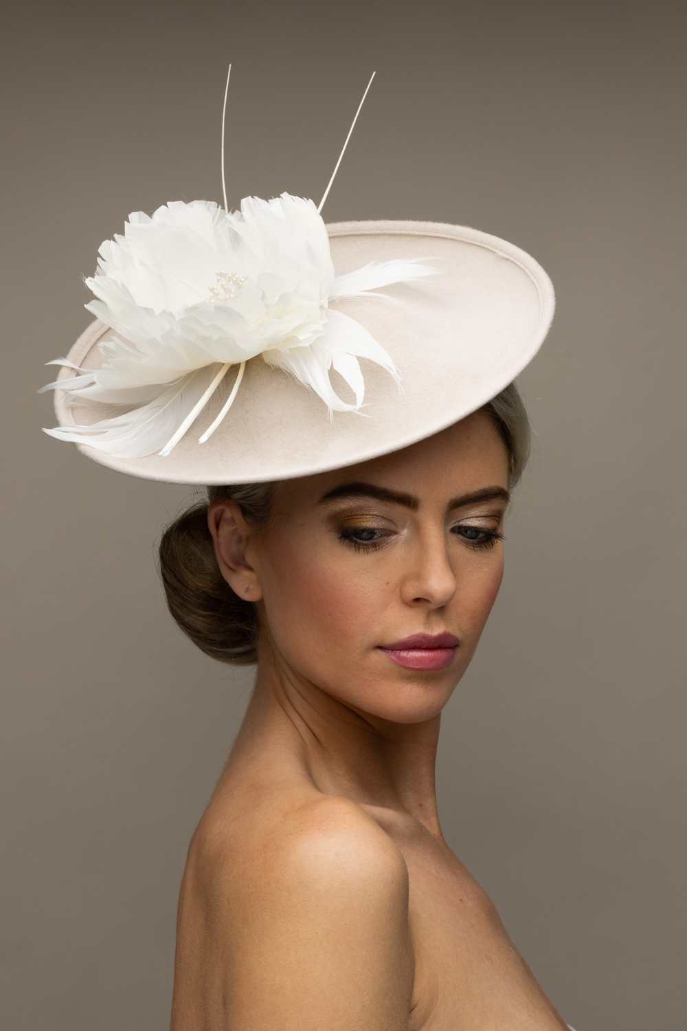 As with all of our hats, you can have your Como dish hat in any colour you wish. Choose your felt base colour here and your quill colour here, the feather flowers are available in ivory, black & navy. We are happy to send out colour swatches so you can be sure that your chosen colours perfectly match your outfit. To order colour samples simply email info@hostiehats.co.uk.
