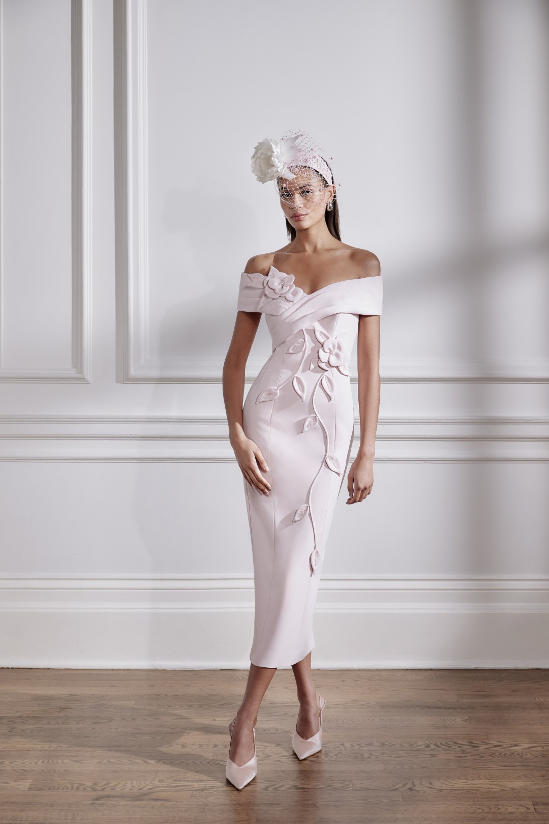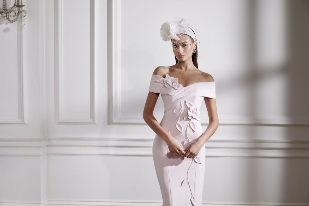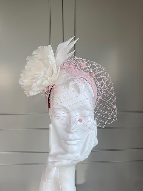 The Cornwall Headband comprises a wide duchess sinamay base trimmed with a feather flower and spotted veiling. The feather flower is available in either ivory, black or navy.
