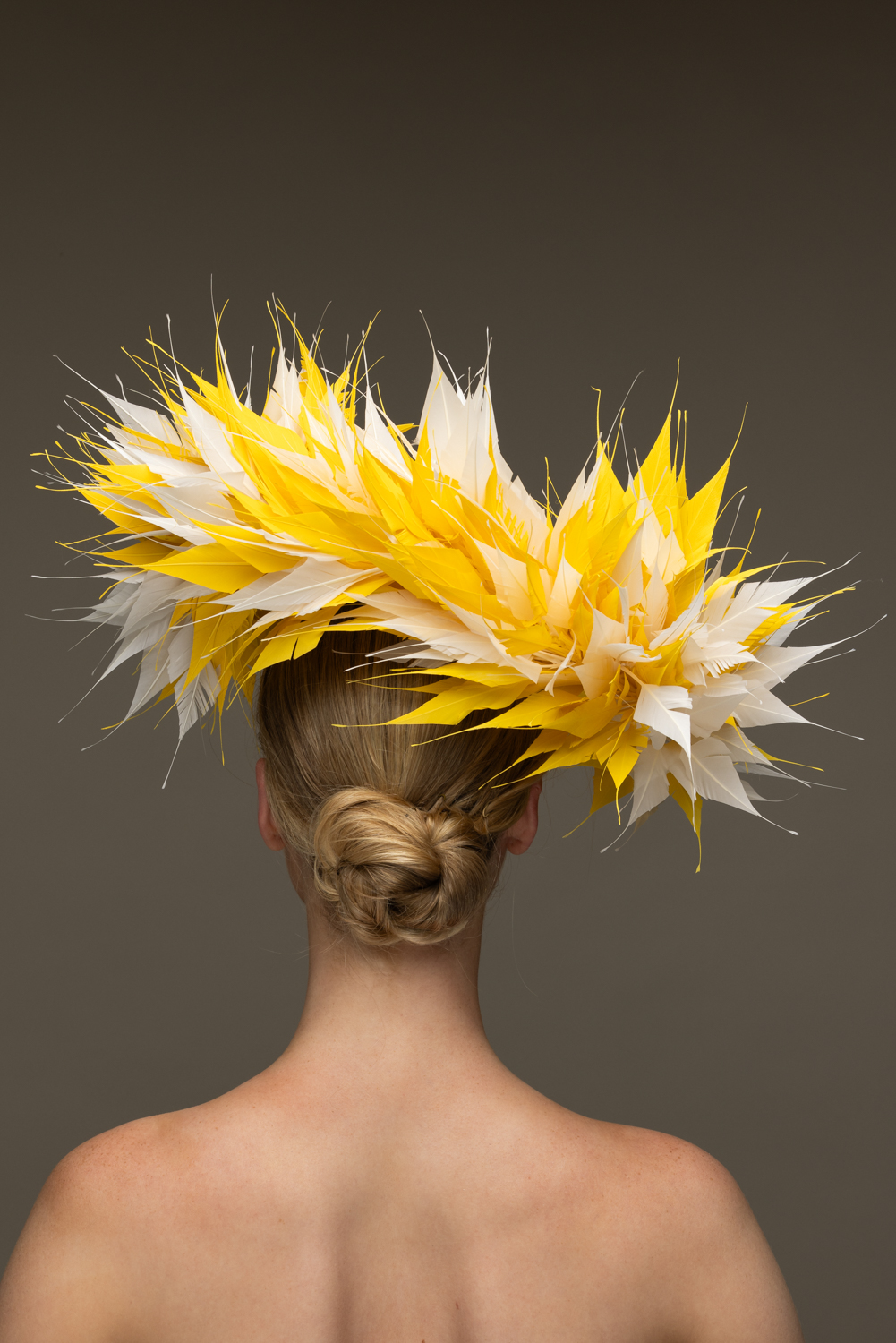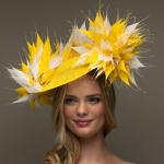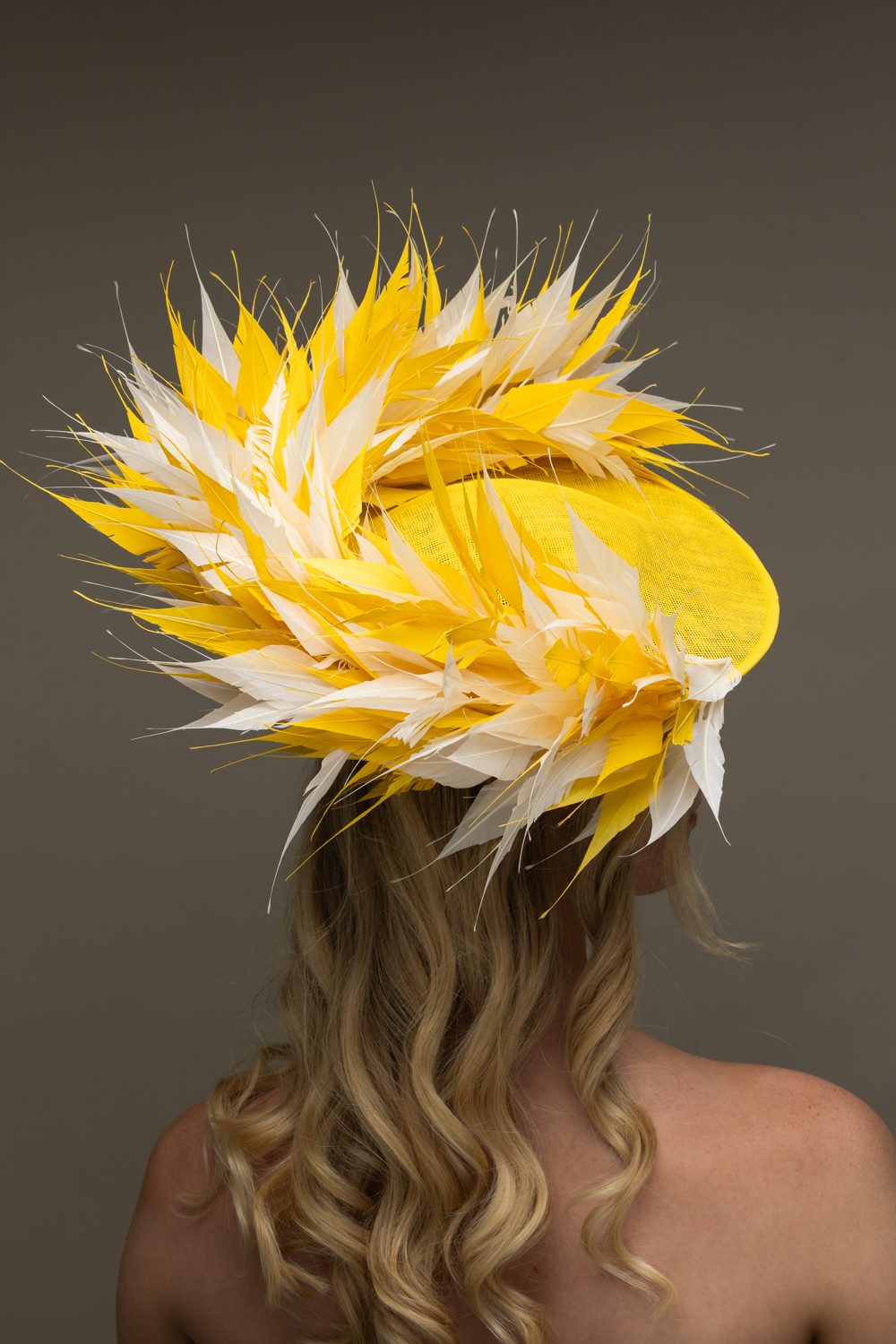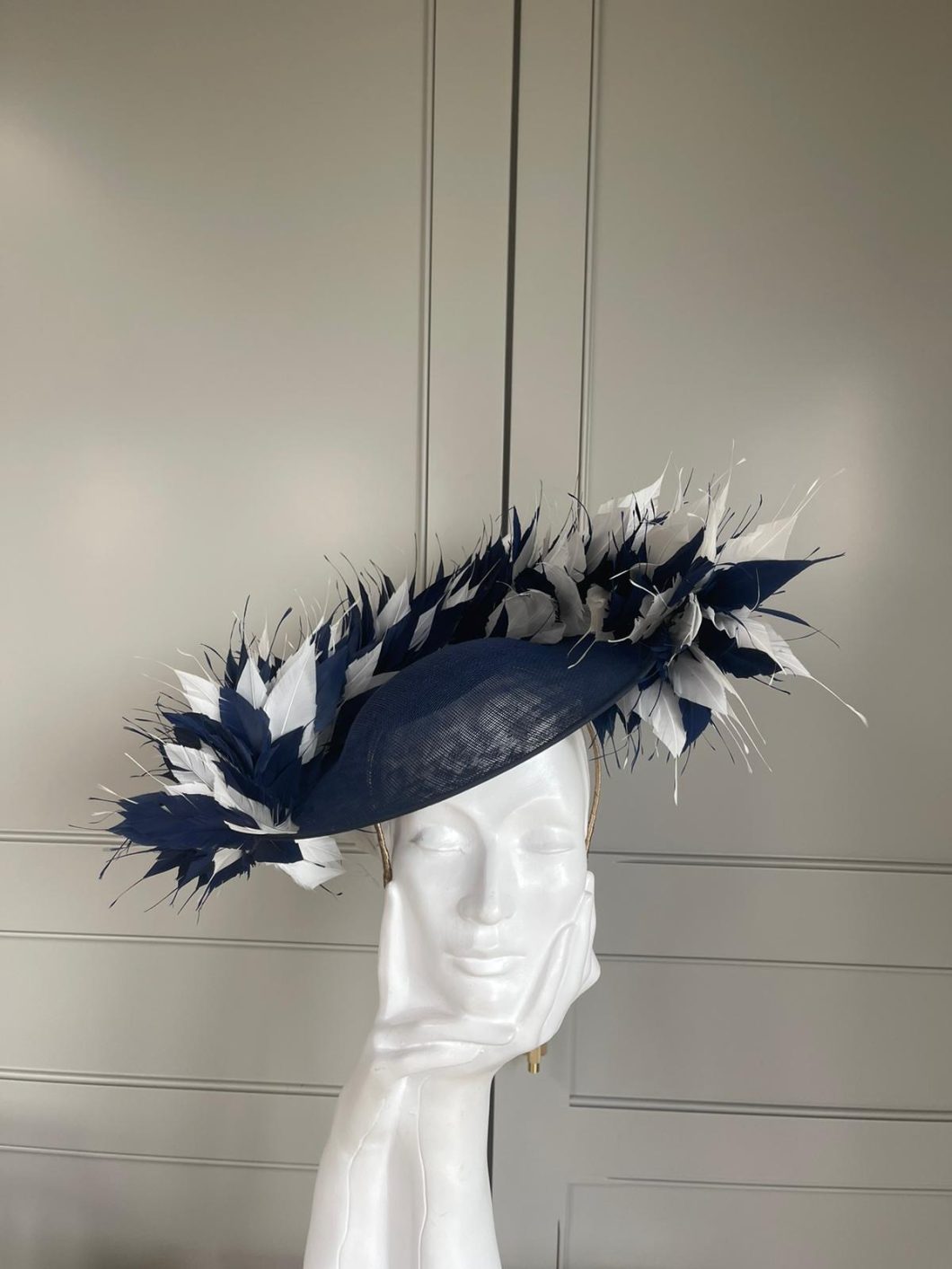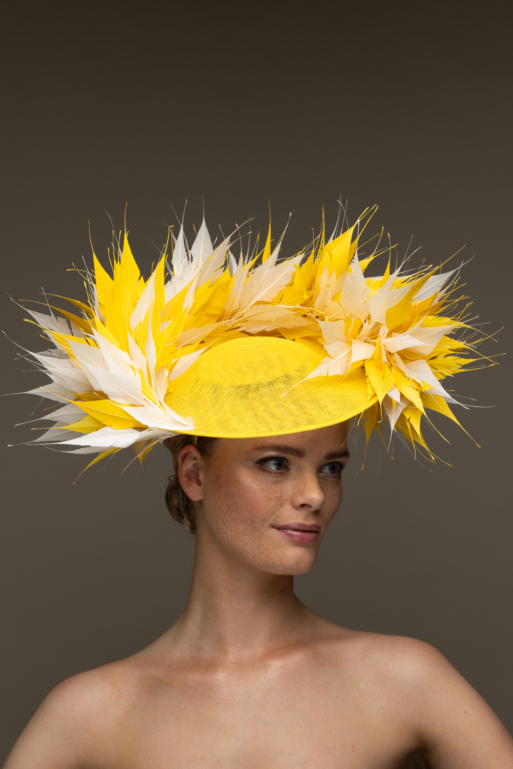 The Crystal Dish Hat is a stunning, statement-making summer occasion hat. The hat comprises a 12″ sinamay dish base trimmed generously with feather clusters, available in up to three different colours of your choice.