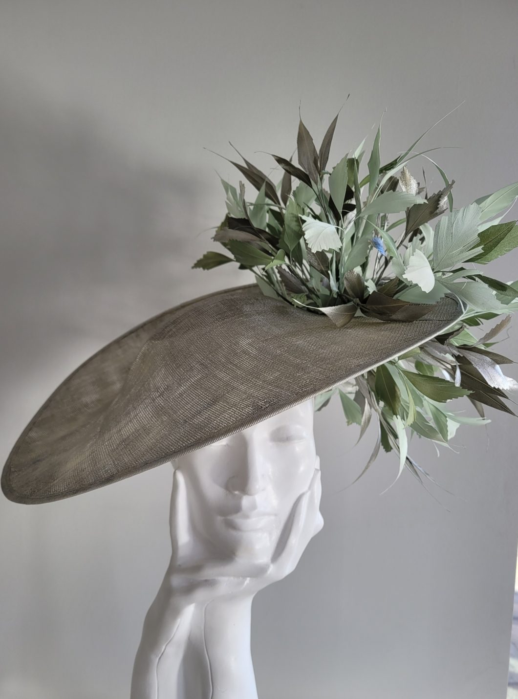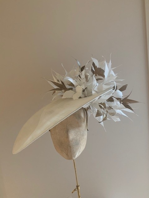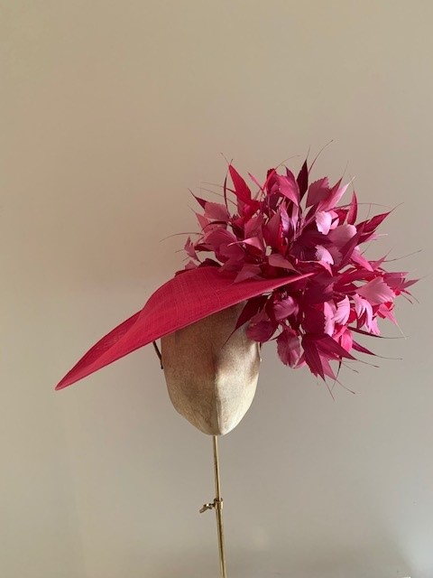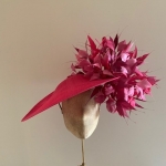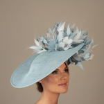 The Deauvuille dish hat is a real statement headpiece that would look fabulous in your own choice of colours at a Race meeting or a summer wedding. The Deauville comprises a large sinamay dish base generously trimmed to the top and undersides of the brim to one side with spiked feathers.