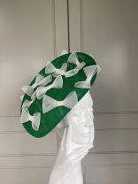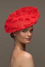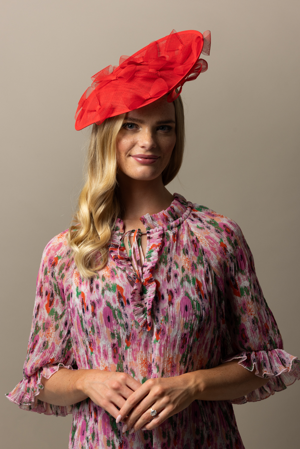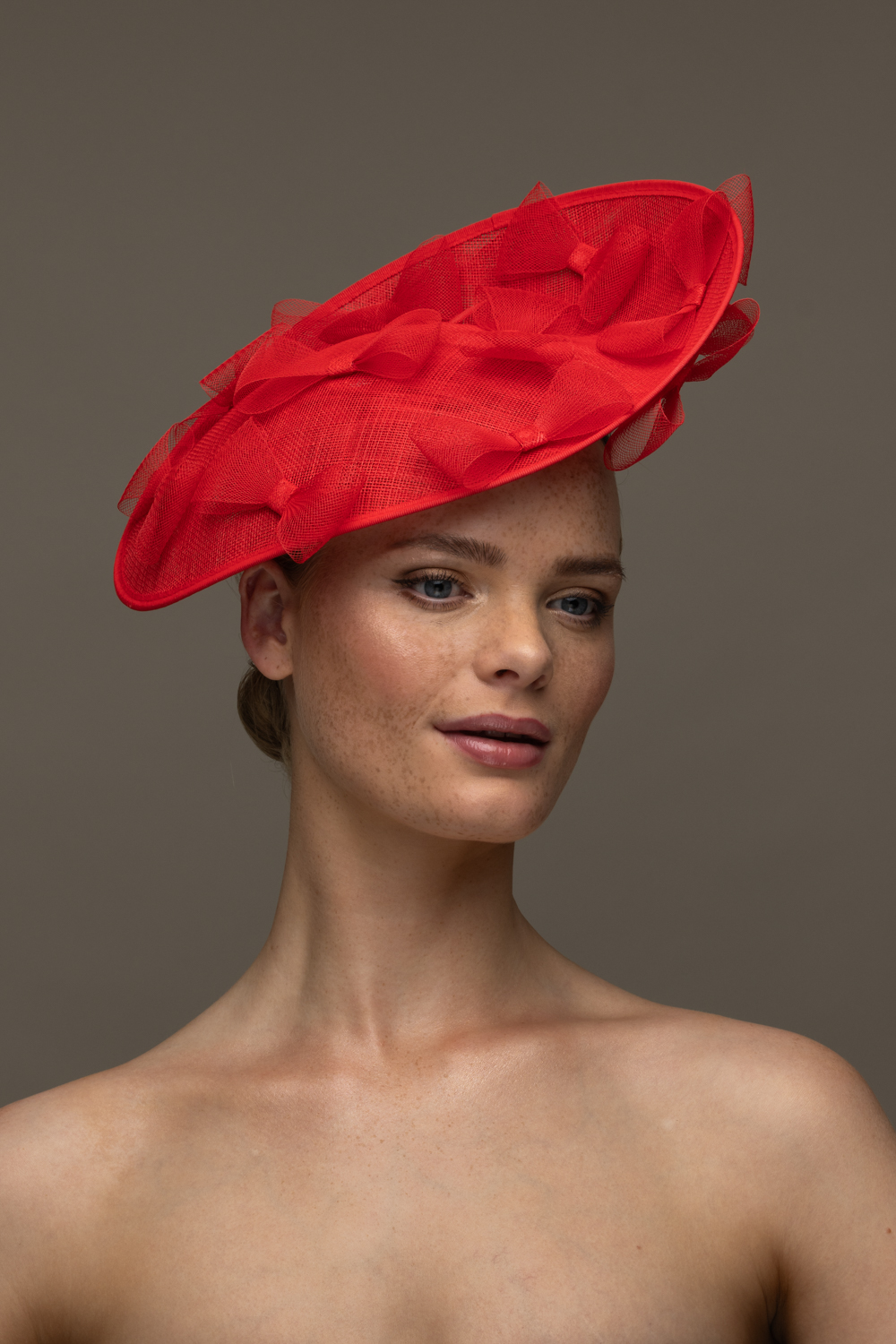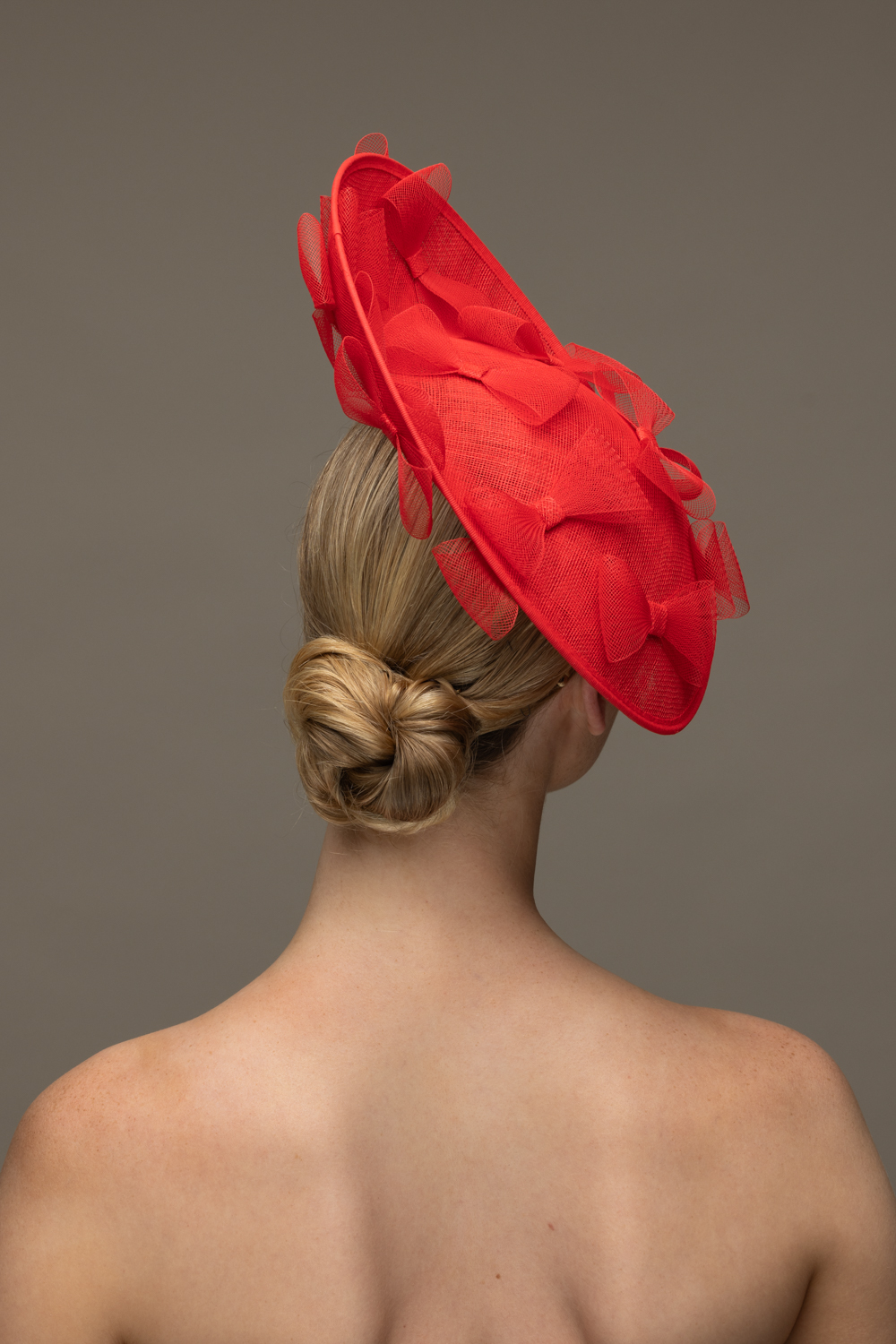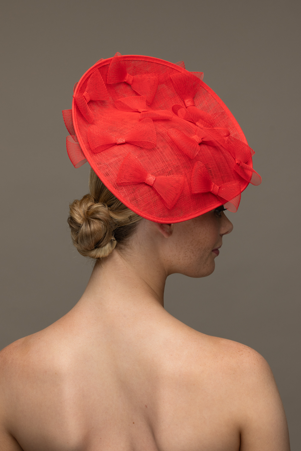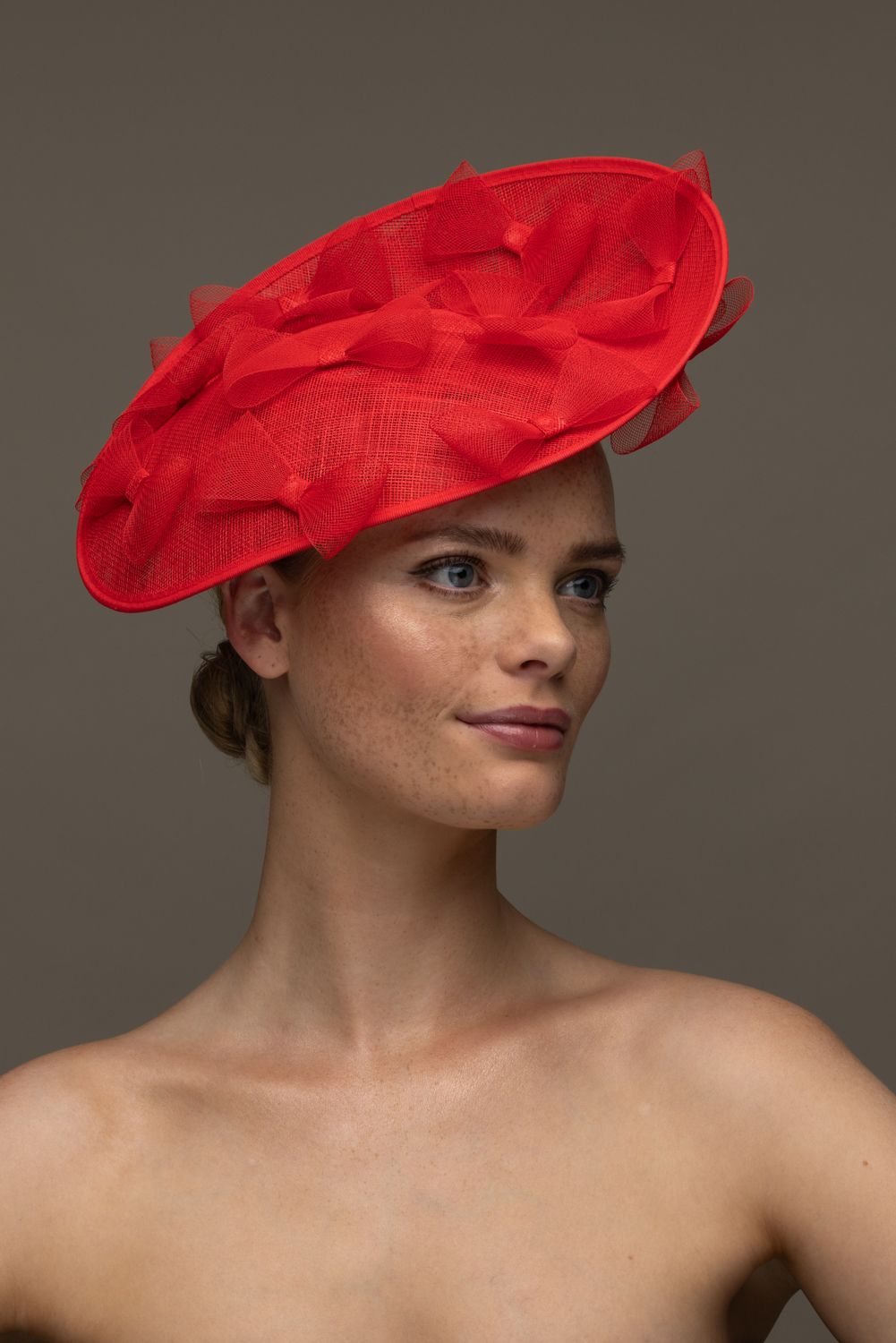 The Dolomite Dish Hat comprises a sinamay dish base moulded closely to the head on the bottom side adorned with delicate bows both above and below the brim of the hat. Choose your bows in up to three different colours, perfect for picking out all the colours in your outfit.
