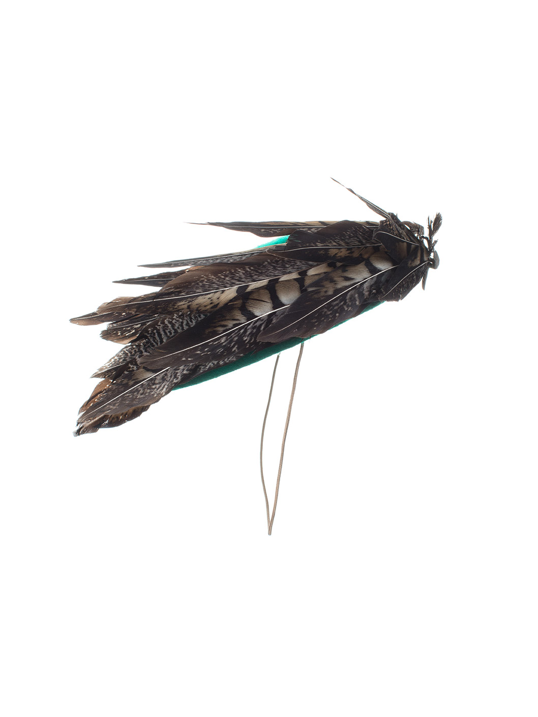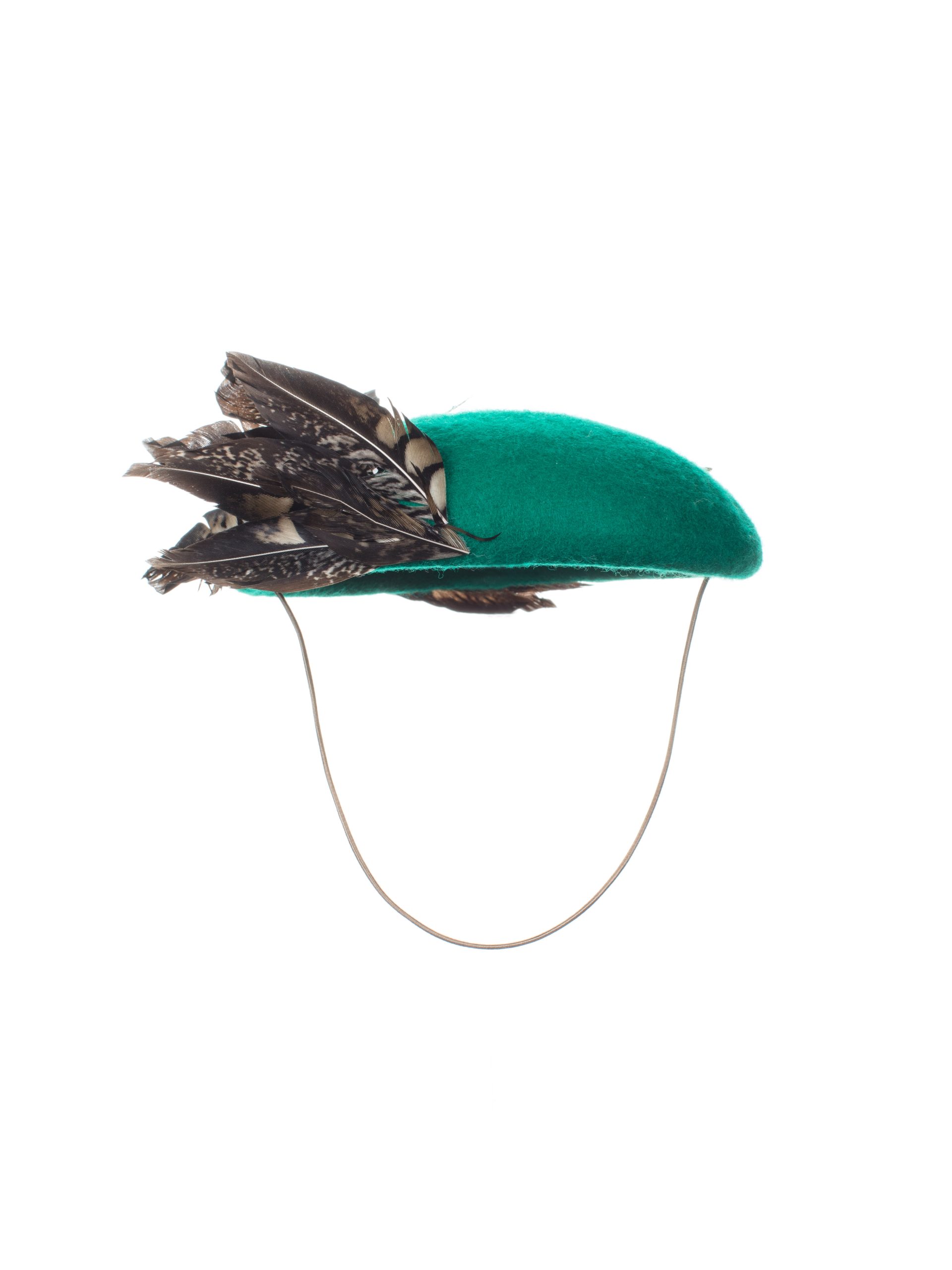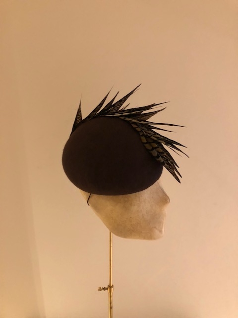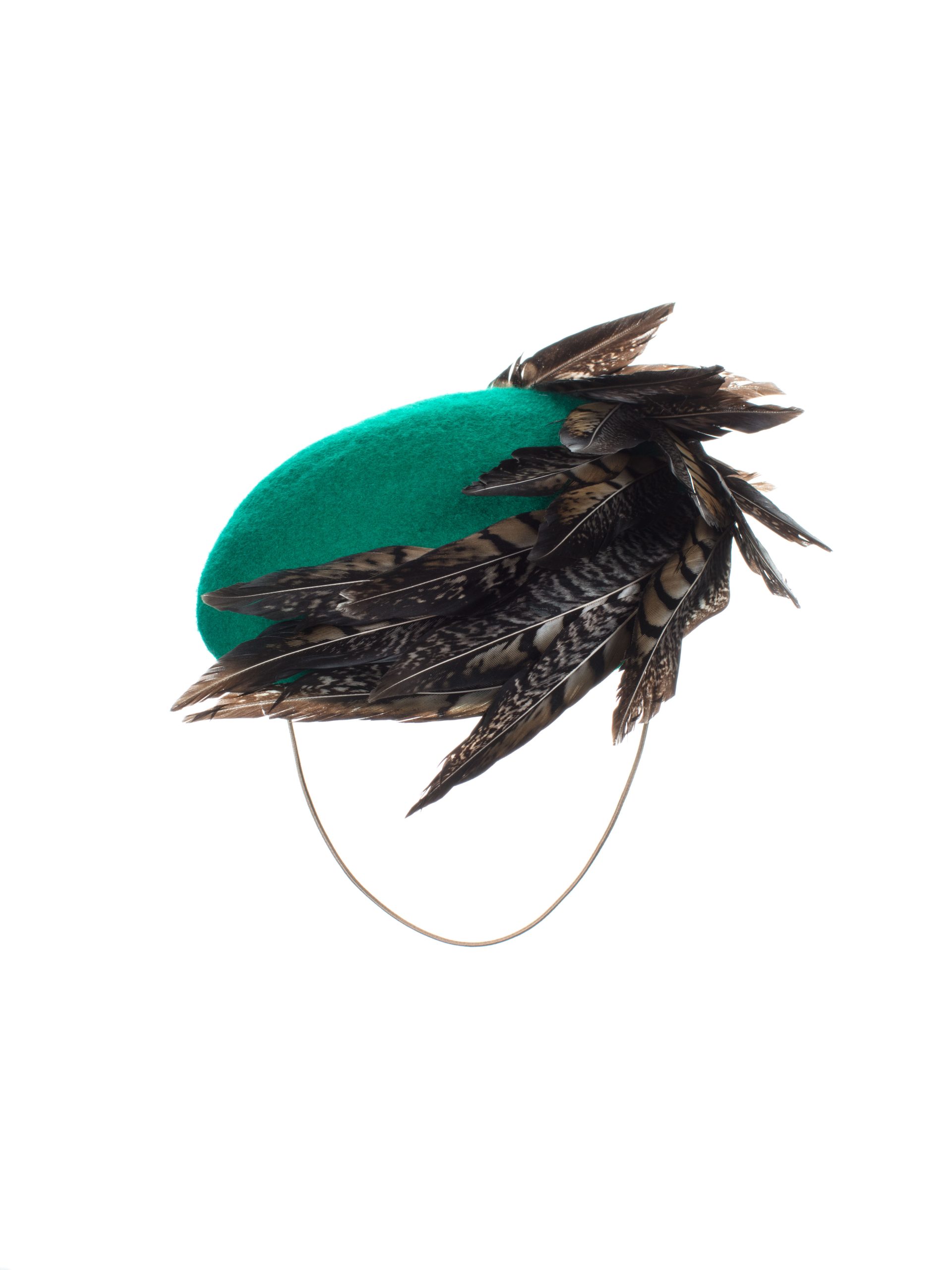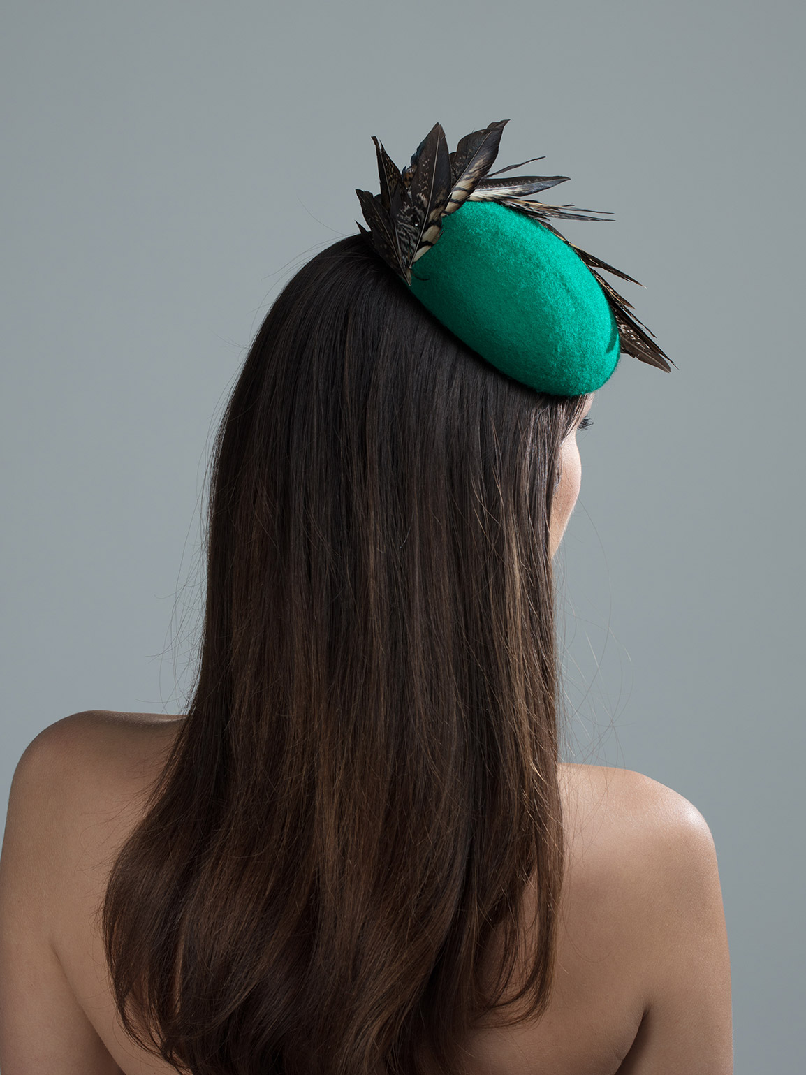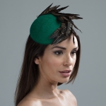The Doyle Pillbox Hat is the perfect hat for a day at the races in autumn or winter. It comprises a pillbox base, shown here in a beautiful emerald green, trimmed around the edge with natural pheasant feathers. You can choose to leave the pheasant feathers in their natural state or have them dusted with a colour of your choice, the perfect way to match the hat perfectly to your outfit.
