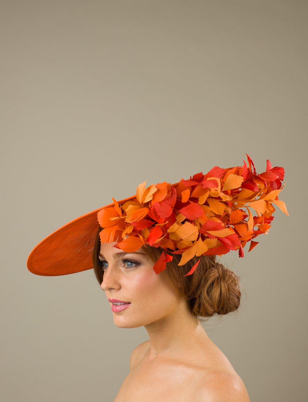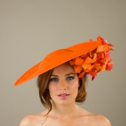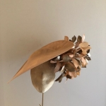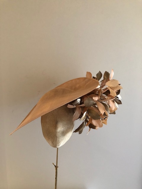 The Dunster Dish hat comprises a beautiful sinamay base with shallow crown adorned to the underside of the brim with a stunning spray or feathers to the side and back.