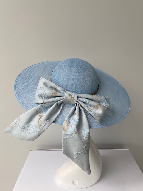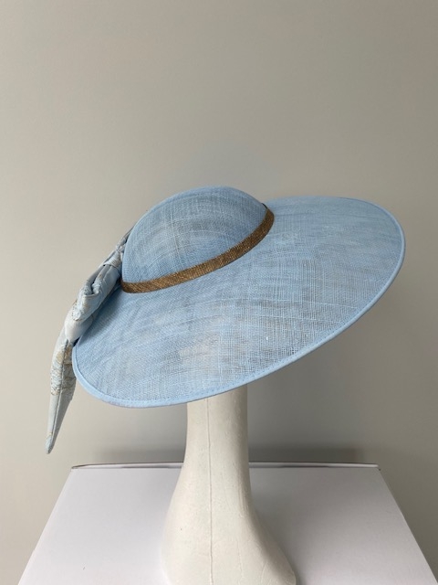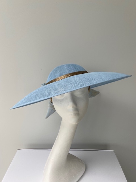 The Exclusive hat 025 comprises a sinamay dish base with a shallow crown. Trimmed with a gold band and a fabric bow positioned at the back. The hat comes on a comfortable, ribbon-wrapped double headband.