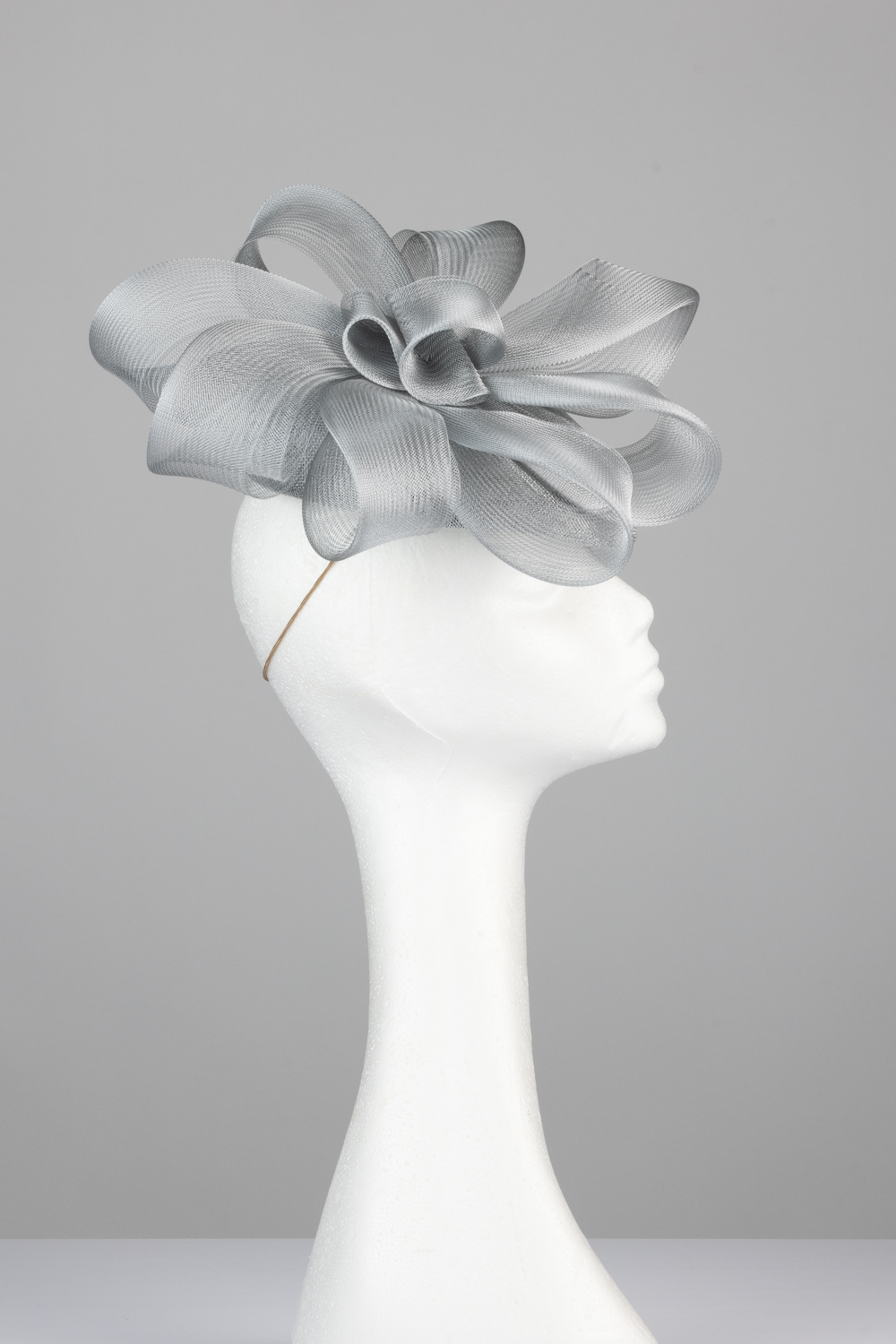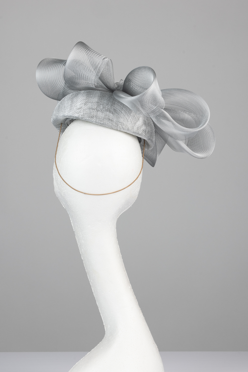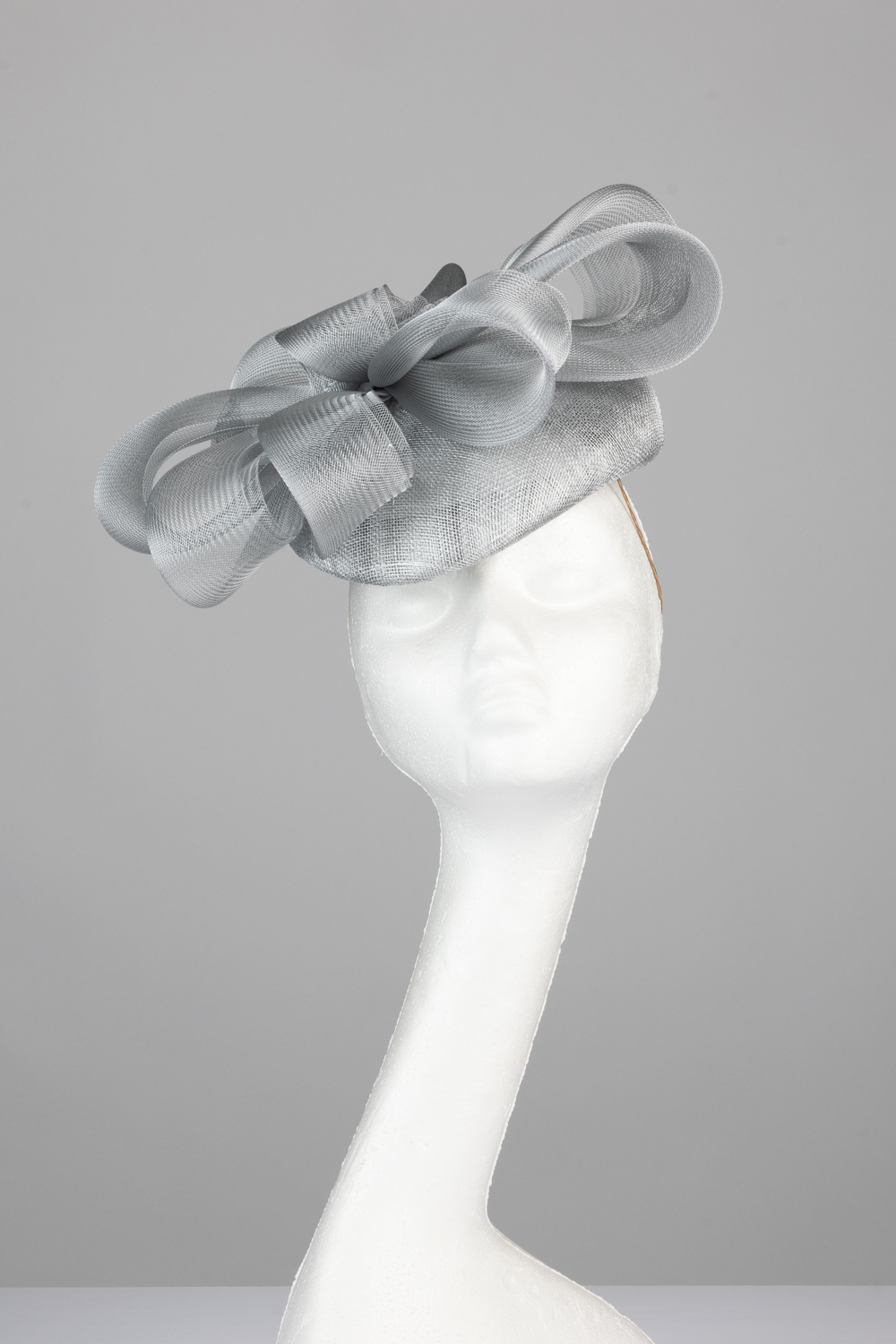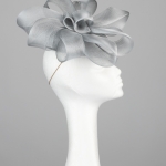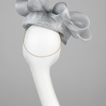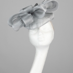 The Exclusive Hat 006 comprises a silver pillbox style base trimmed to the top with a crown of crinoline bow loops with smaller loop to the centre. This hat comes on elastic to sit to the back of the head, hidden beneath your hair.