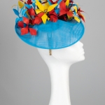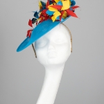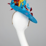 The Exclusive hat 014 comprises a 12″ sinamay dish base in light blue trimmed to the back with spiked and zig-zag trimmed feathers to create extra texture in light blue, shock red and shock yellow light. This hat comes on a comfortable, ribbon-wrapped double headband.