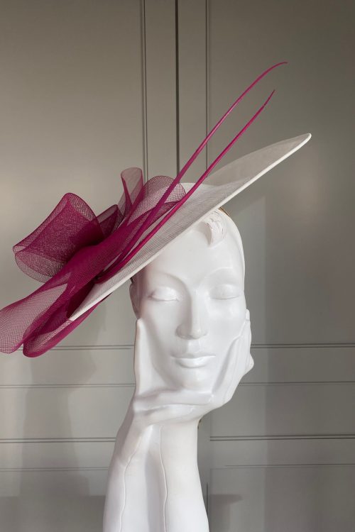 The Exclusive Hat 040 is a dish hat which is moulded close to the head which is adorned with a beautiful bow made from fabric. The hat sits on a comfortable, ribbon-wrapped double headband.