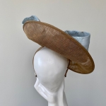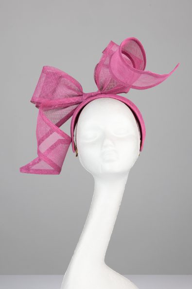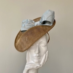 The Exclusive Hat 043 is a dish hat which is moulded close to the head which is adorned with a beautiful bow made from fabric. The hat sits on a comfortable, ribbon-wrapped double headband.