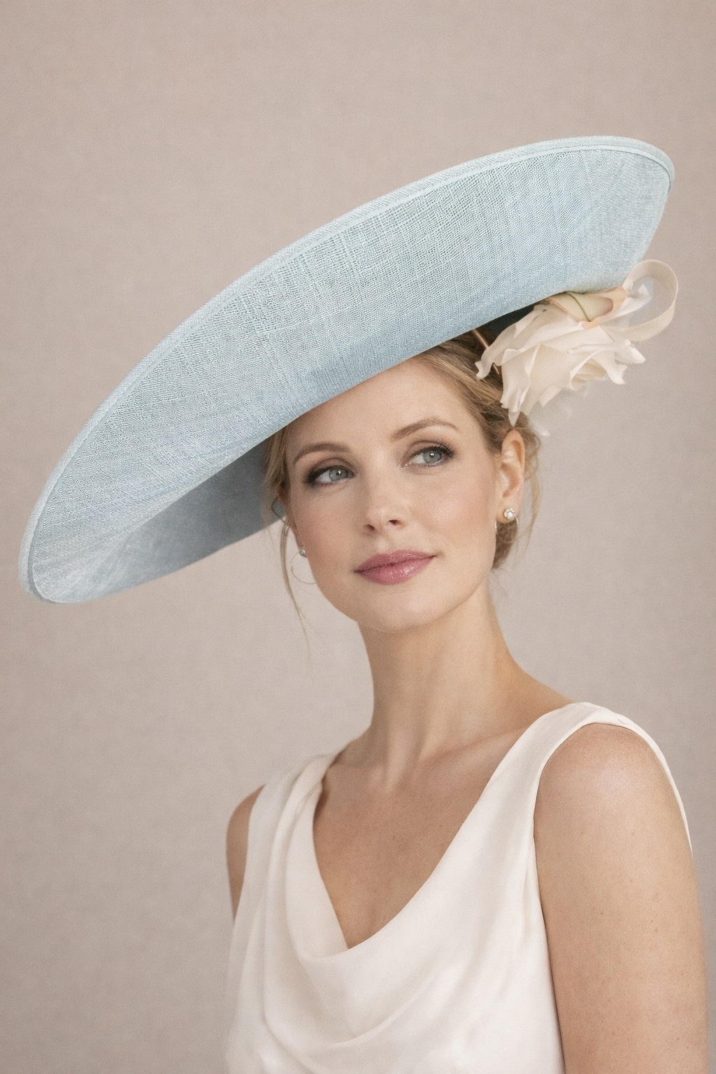 The Exclusive Hat 052 comprises a sinamay base in a teardrop shaped east to west design with deep upturn to the front of the brim, trimmed with a silk rose and sinamay loops underneath the brim.